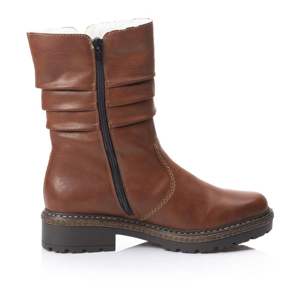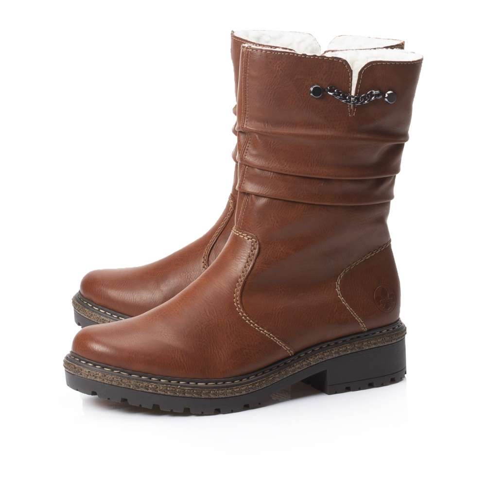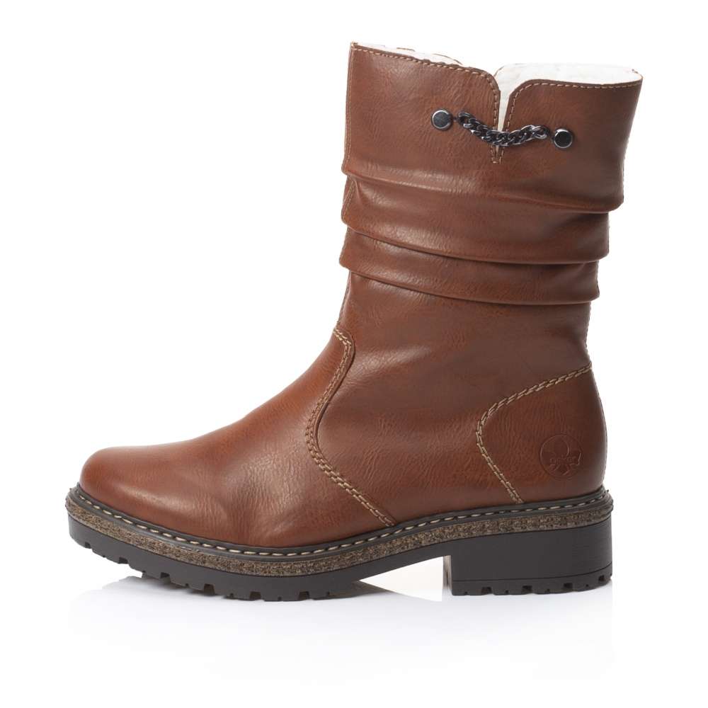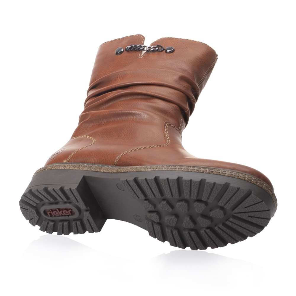 Vyšší kotníková obuv s krčeným povrchem v horní části zaujme především decentním průřezem se zdobným kovovým řetízkem. Obutí Vám skvěle usnadní funkční zip na vnitřní straně. Podšívka z teplého materiálu krásně zahřeje a hrubá podešev zajistí bezpečnou chůzi. Hnědá obuv od značky Rieker ve které jednoznačně oslníte své okolí a skvěle ji sladíte s jakýmkoliv outfitem. Technologie: Antistress – podešev je díky této technologii lehká, flexibilní, absorbuje nárazy při došlapu a snadno se přizpůsobí každé noze.