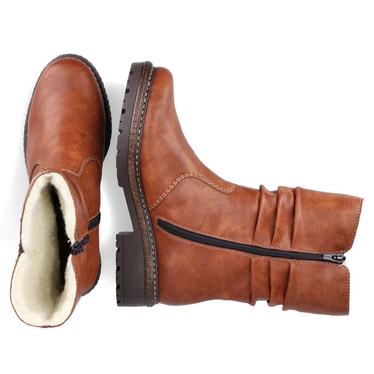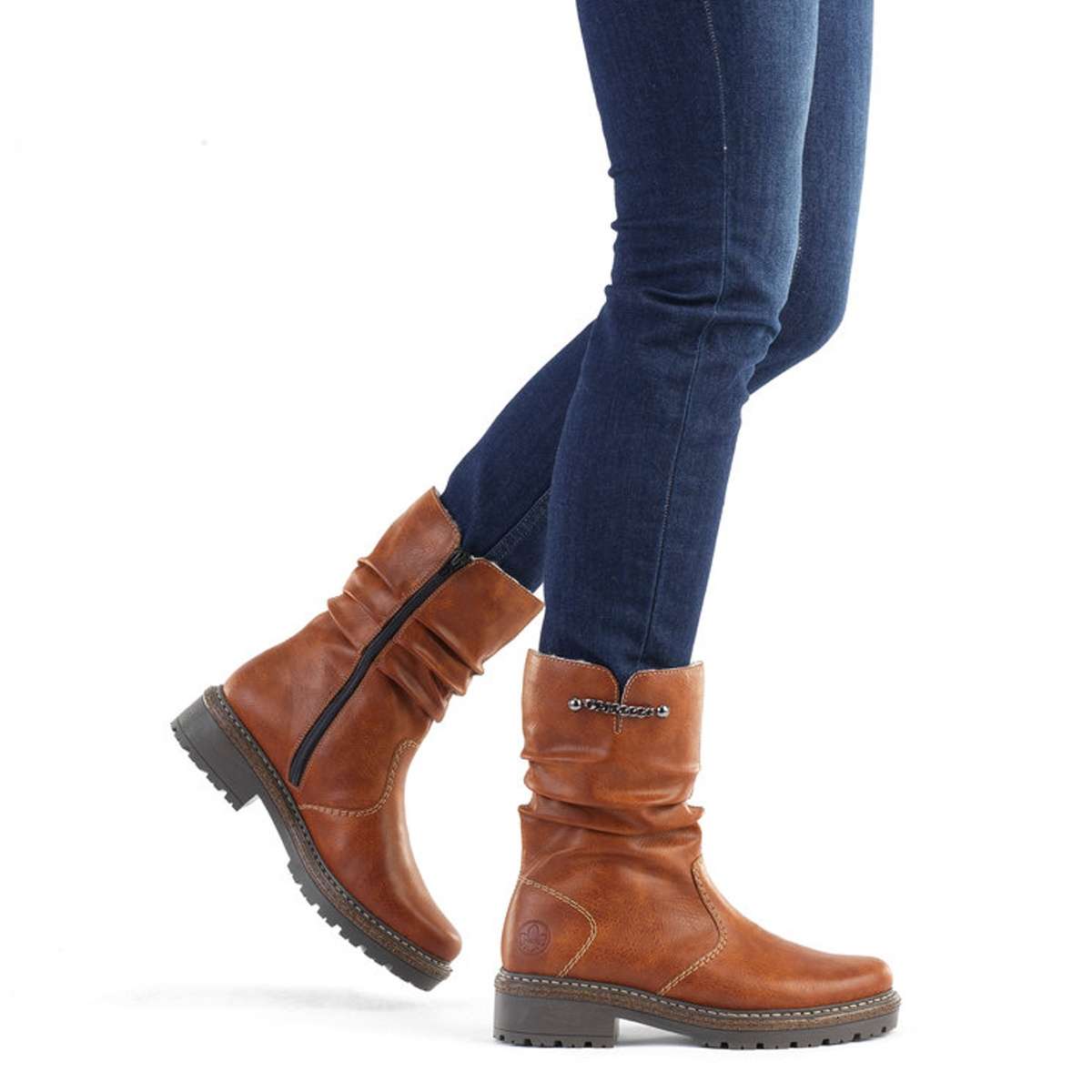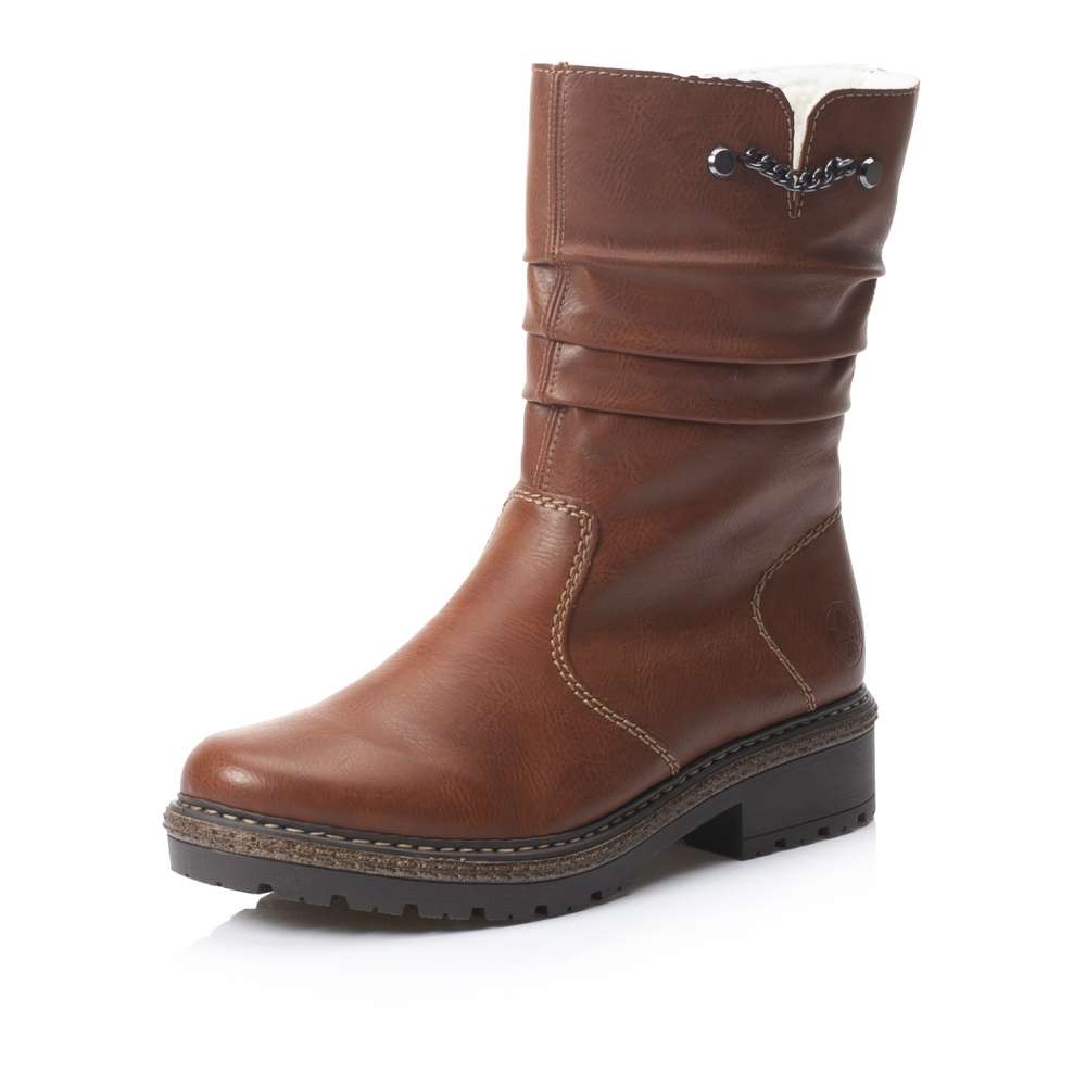 Vyšší kotníková obuv s krčeným povrchem v horní části zaujme především decentním průřezem se zdobným kovovým řetízkem. Obutí Vám skvěle usnadní funkční zip na vnitřní straně. Podšívka z teplého materiálu krásně zahřeje a hrubá podešev zajistí bezpečnou chůzi. Hnědá obuv od značky Rieker ve které jednoznačně oslníte své okolí a skvěle ji sladíte s jakýmkoliv outfitem. Technologie: Antistress – podešev je díky této technologii lehká, flexibilní, absorbuje nárazy při došlapu a snadno se přizpůsobí každé noze.