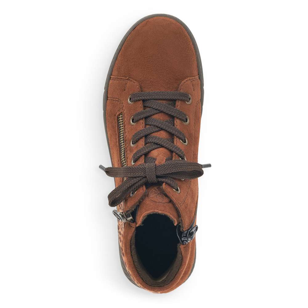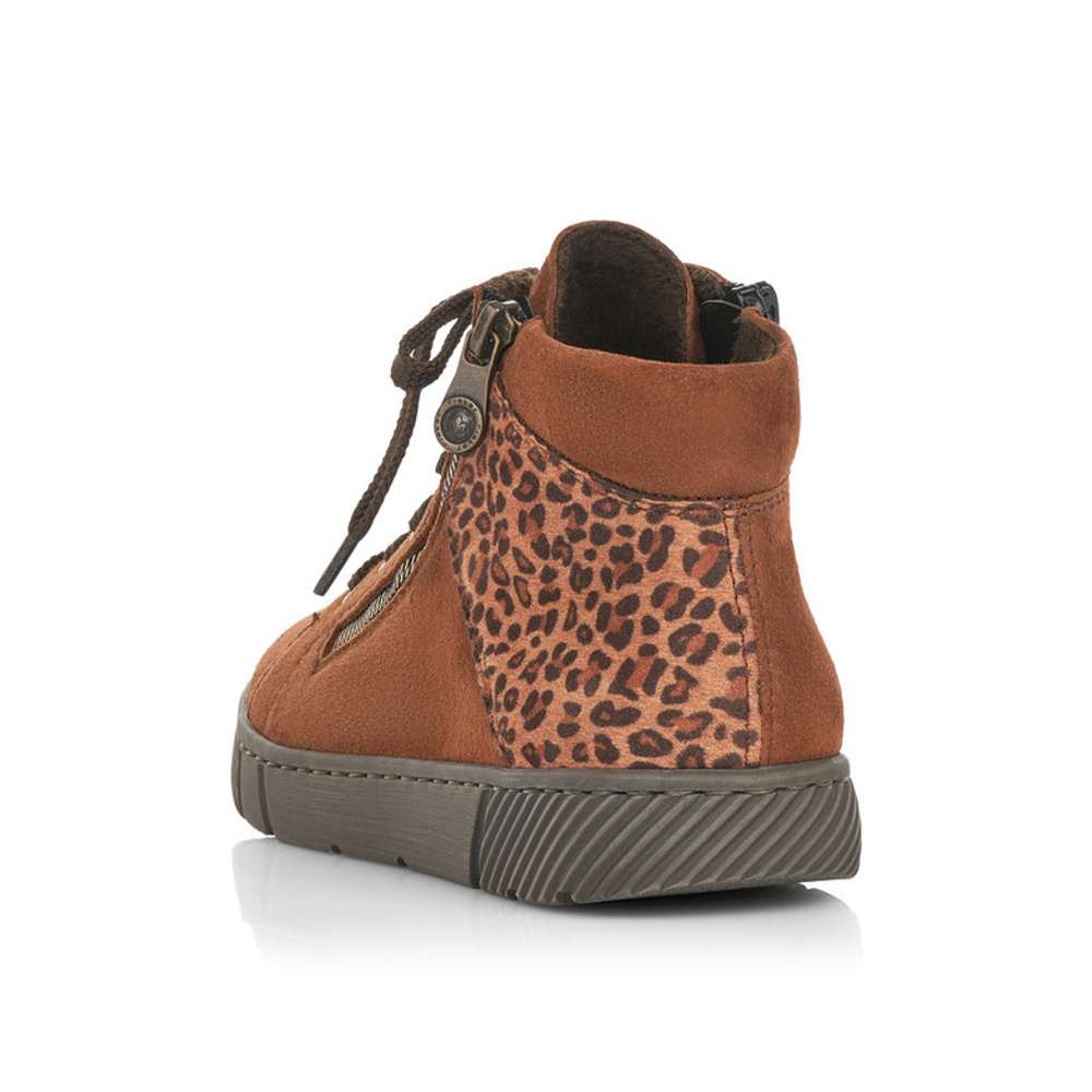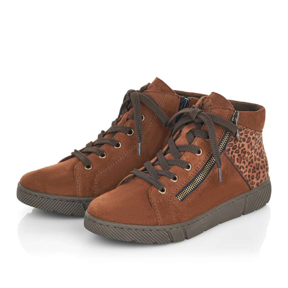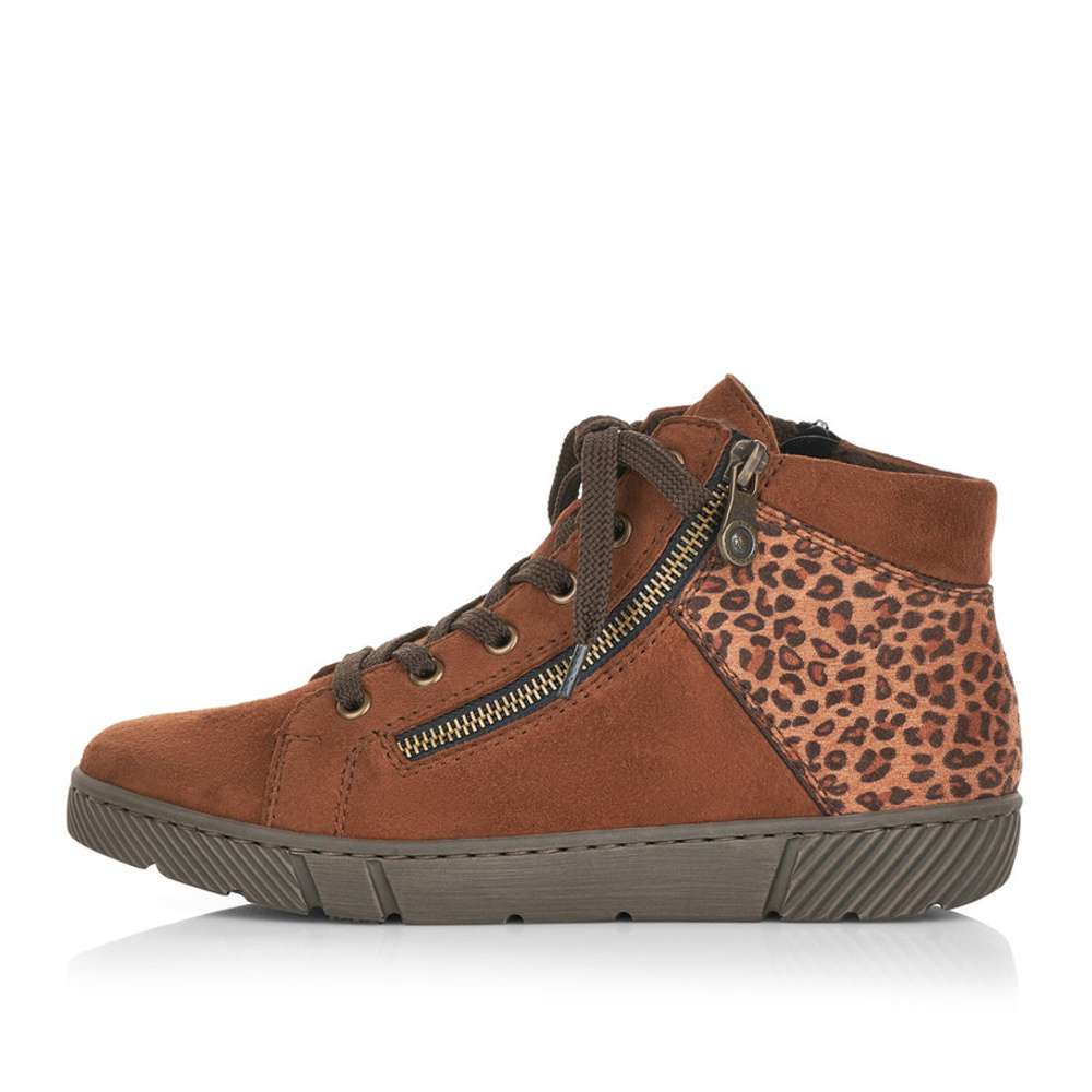 Dámské kotníky šité z pravé kůže mají semišový povrch a kulatou špici. Zdobným prvkem je zvířecí motiv v zadní části boty a zip na vnější straně. Funkční zip na vnitřní straně je zde pro snadné obutí a šněrováním si je upravíte dle svých potřeb.