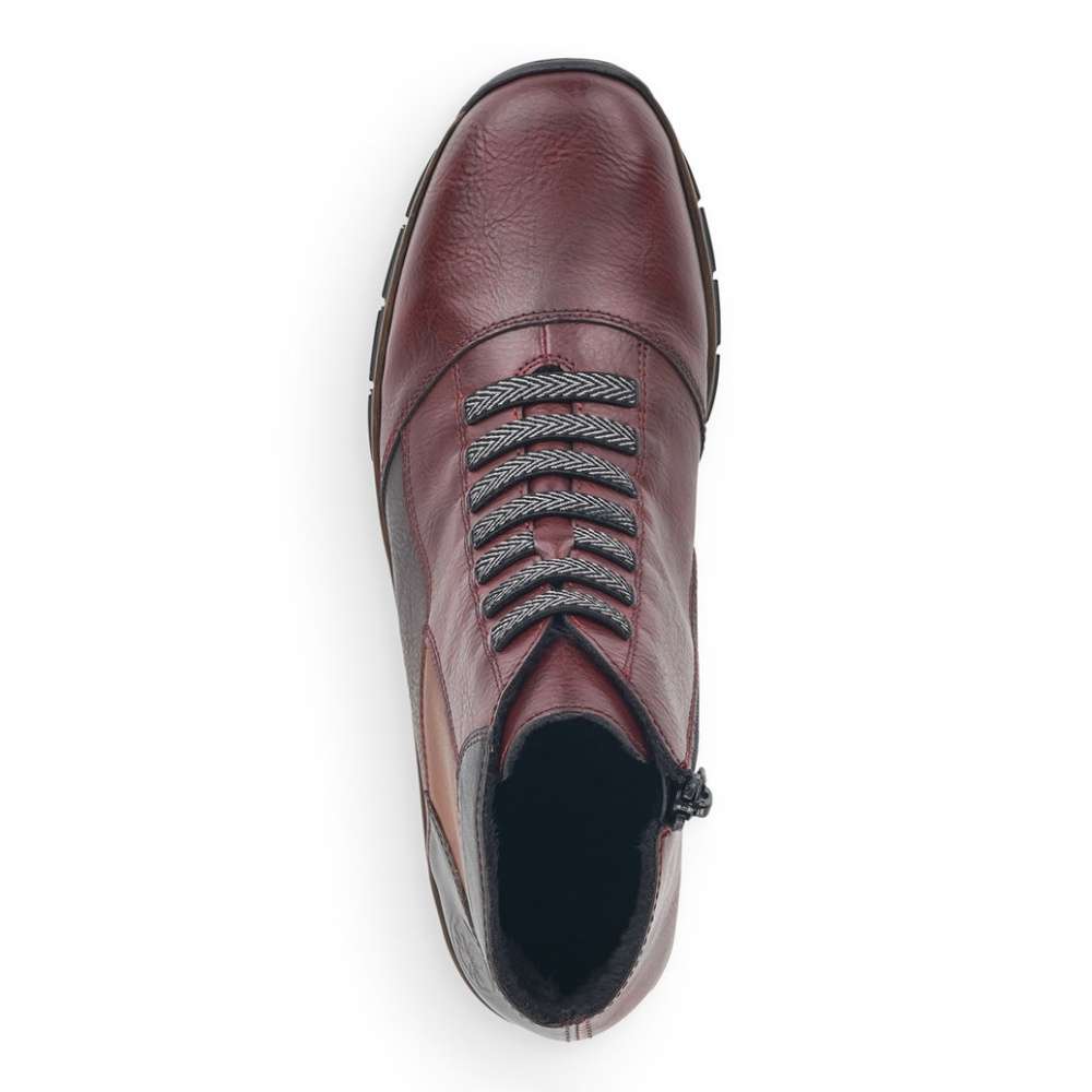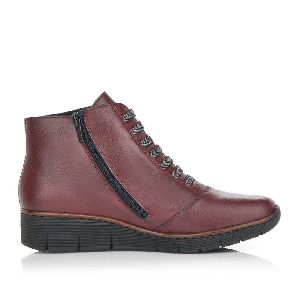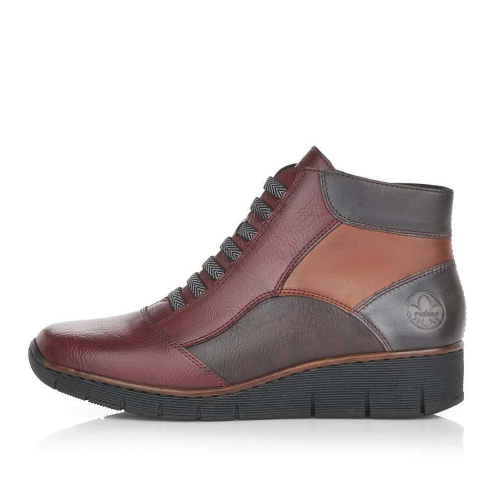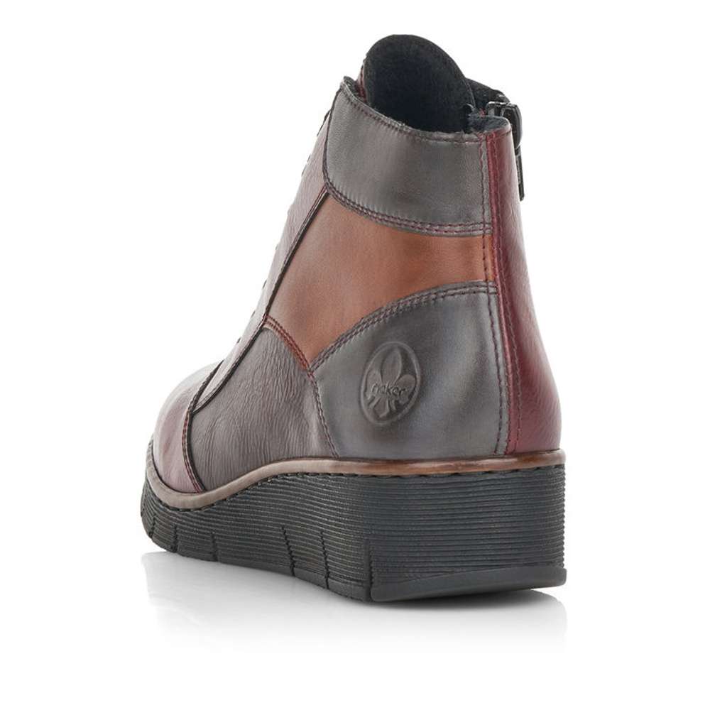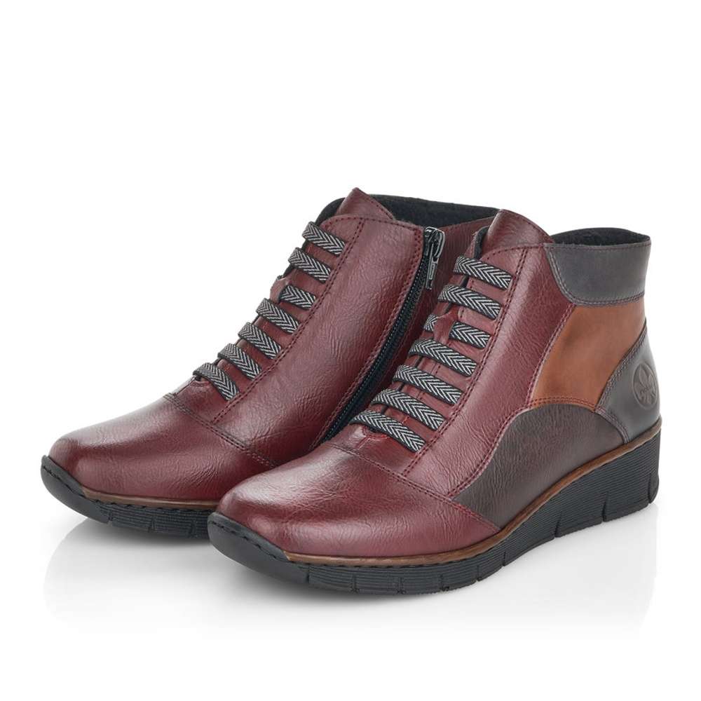 Svršek utváří dohromady kombinaci červené, černé a hnědé, díky čemuž vyniká mezi ostatními botami. Uvnitř boty je kožešina, takže ideální volba do chladnějšího počasí. Z boční strany je všitý zip, díky kterému se bota lépe obouvá. Přední část v oblasti nártu je oživena okrasnými tkaničkami. Ze zadní strany je vytištěno logo značky. Celá bota je jemně prošívaná.