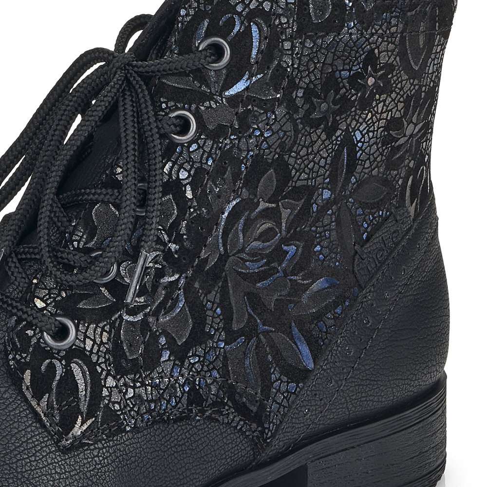 Černý svršek je složen z jemně strukturovaných částí doplněných po stranách barevným květovaným vzorem. Snadné nazouvání Vám umožní funkční zip na vnitřní straně a dokonale si obuv přizpůsobíte šněrováním.
