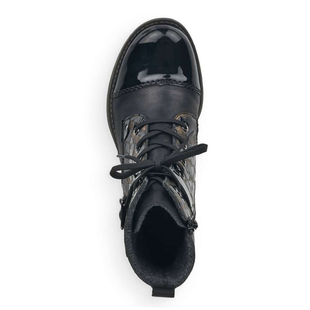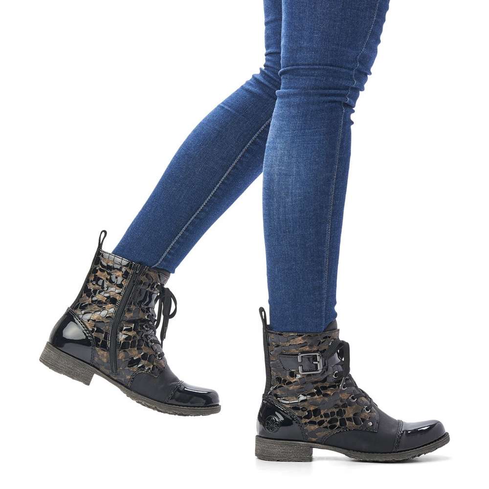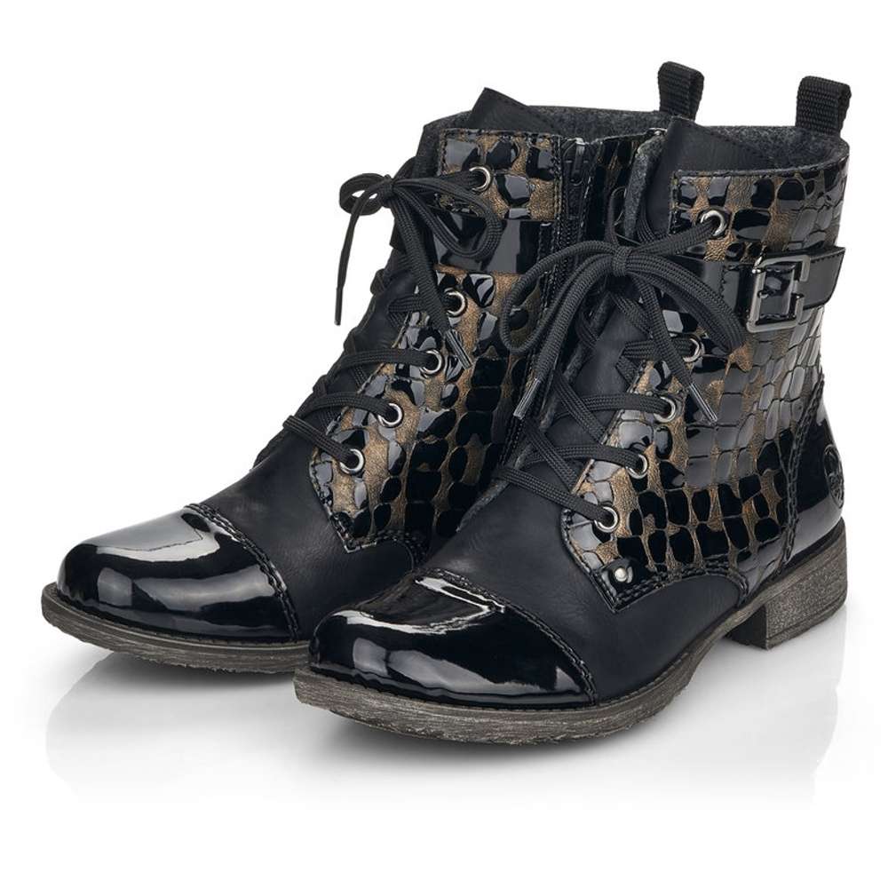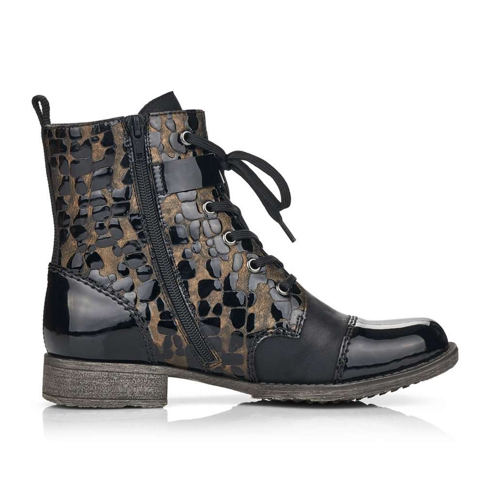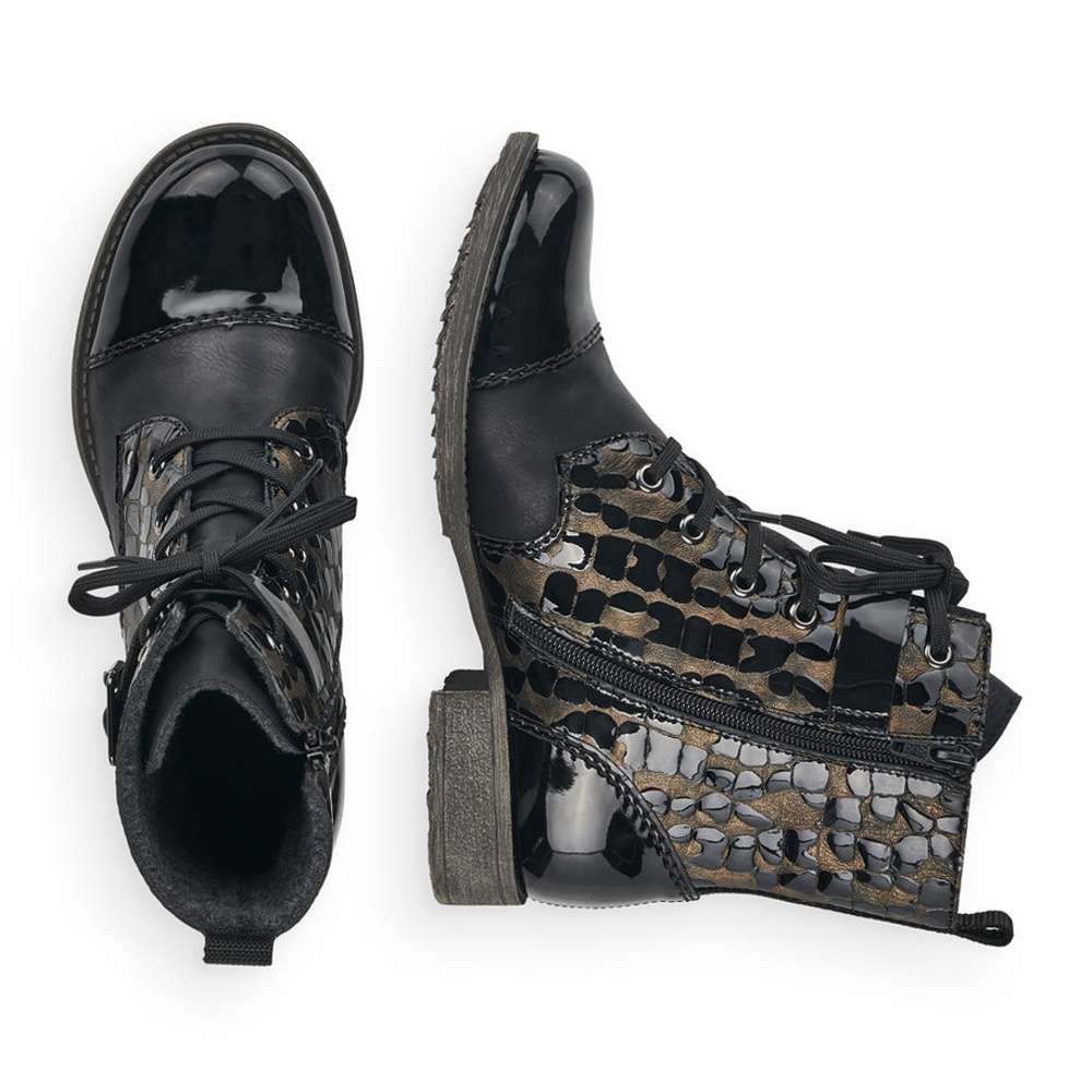 Na svršku se prolínají hladké, lesklé a vzorované části, které jsou doladěny k dokonalosti páskem s kovovou sponou. Snadné nazouvání Vám umožní funkční zip na vnitřní straně a dokonale si obuv přizpůsobíte šněrováním.