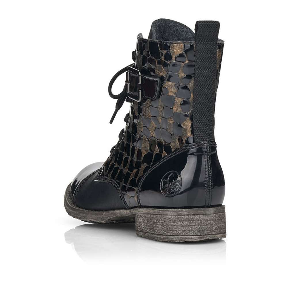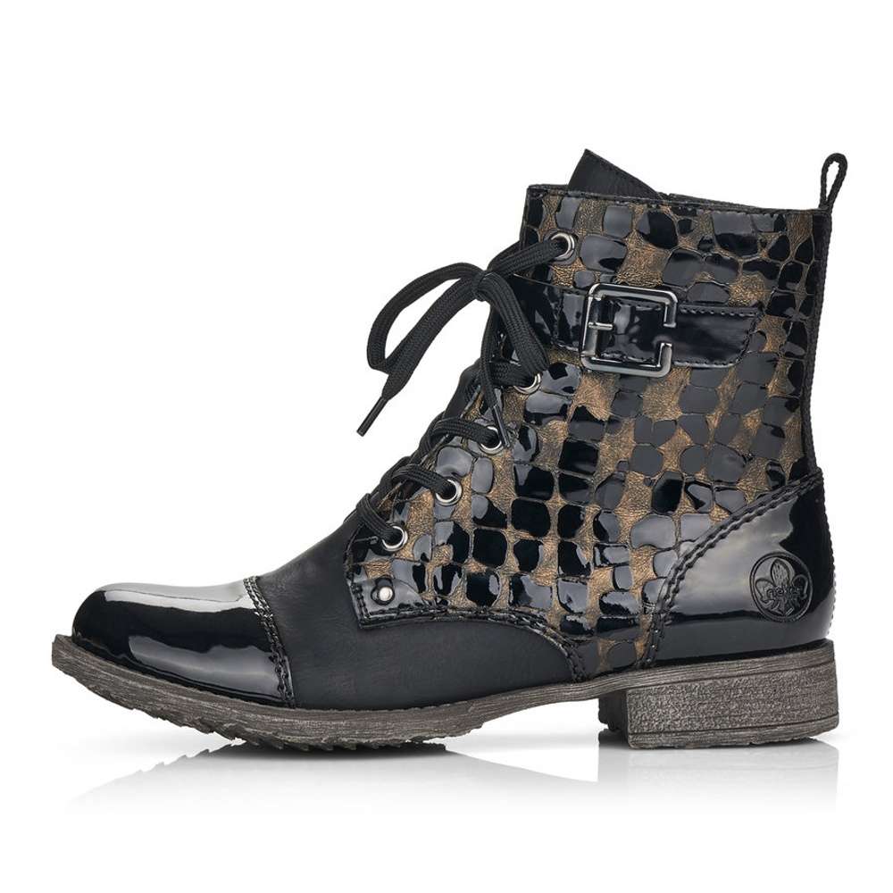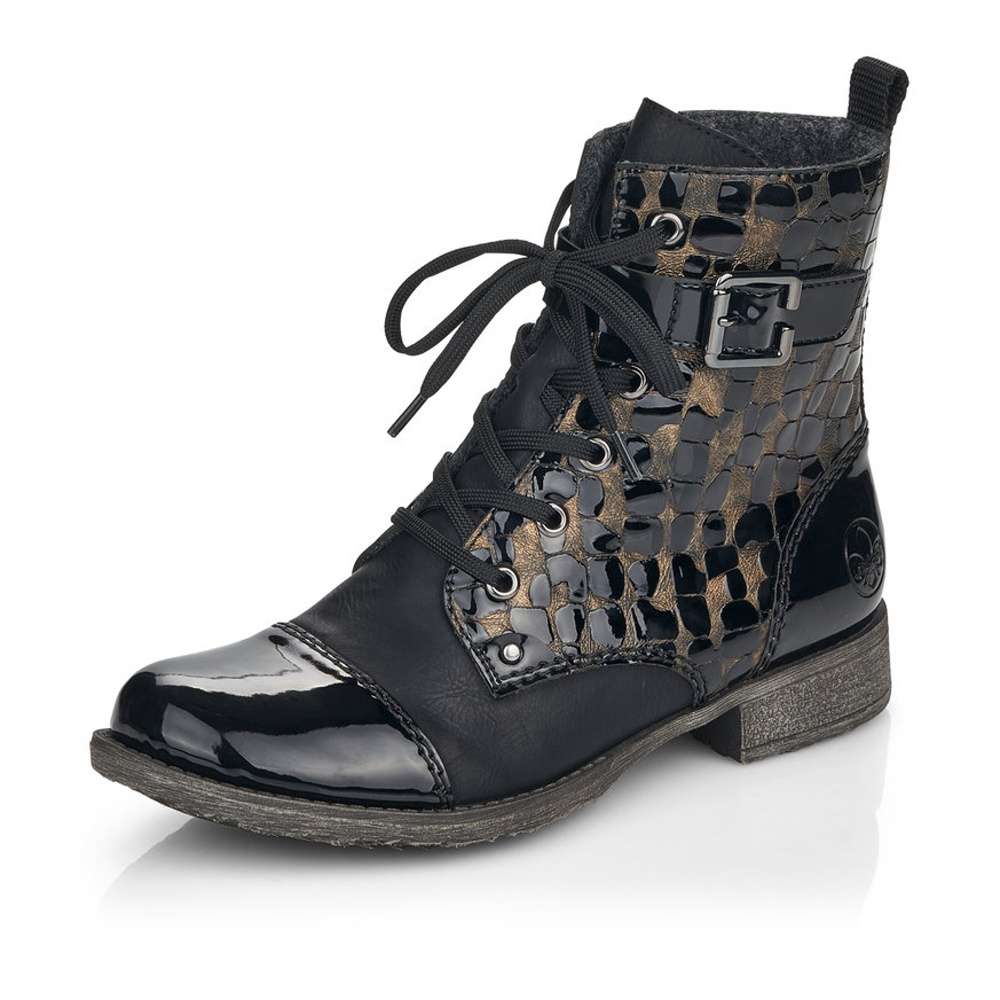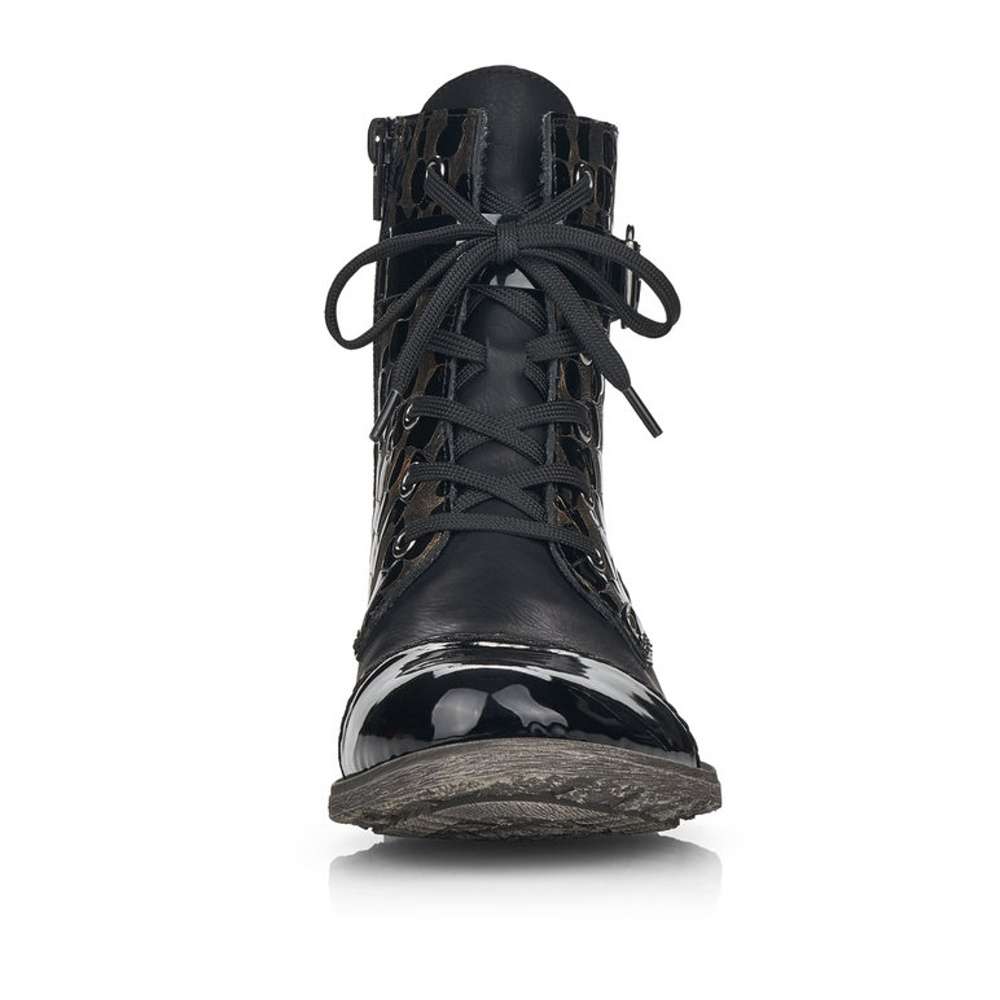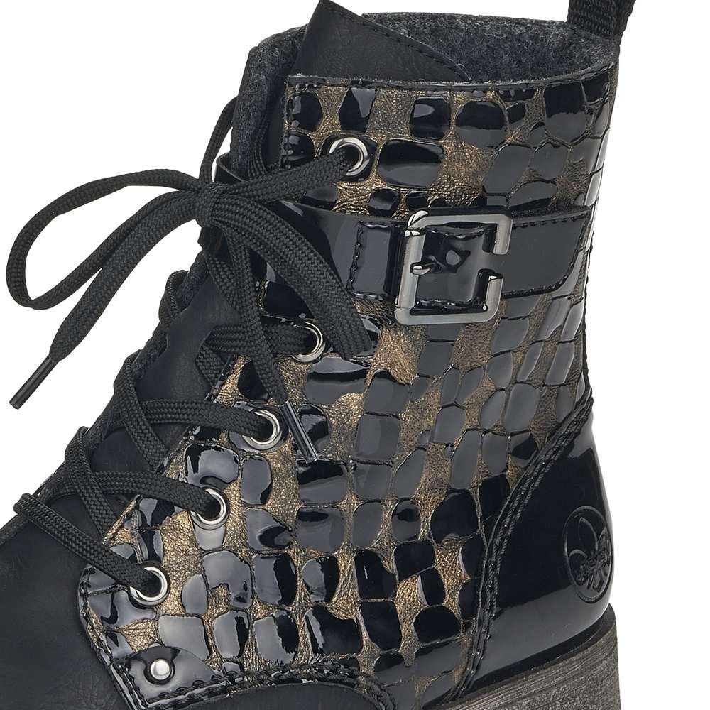 Na svršku se prolínají hladké, lesklé a vzorované části, které jsou doladěny k dokonalosti páskem s kovovou sponou. Snadné nazouvání Vám umožní funkční zip na vnitřní straně a dokonale si obuv přizpůsobíte šněrováním.