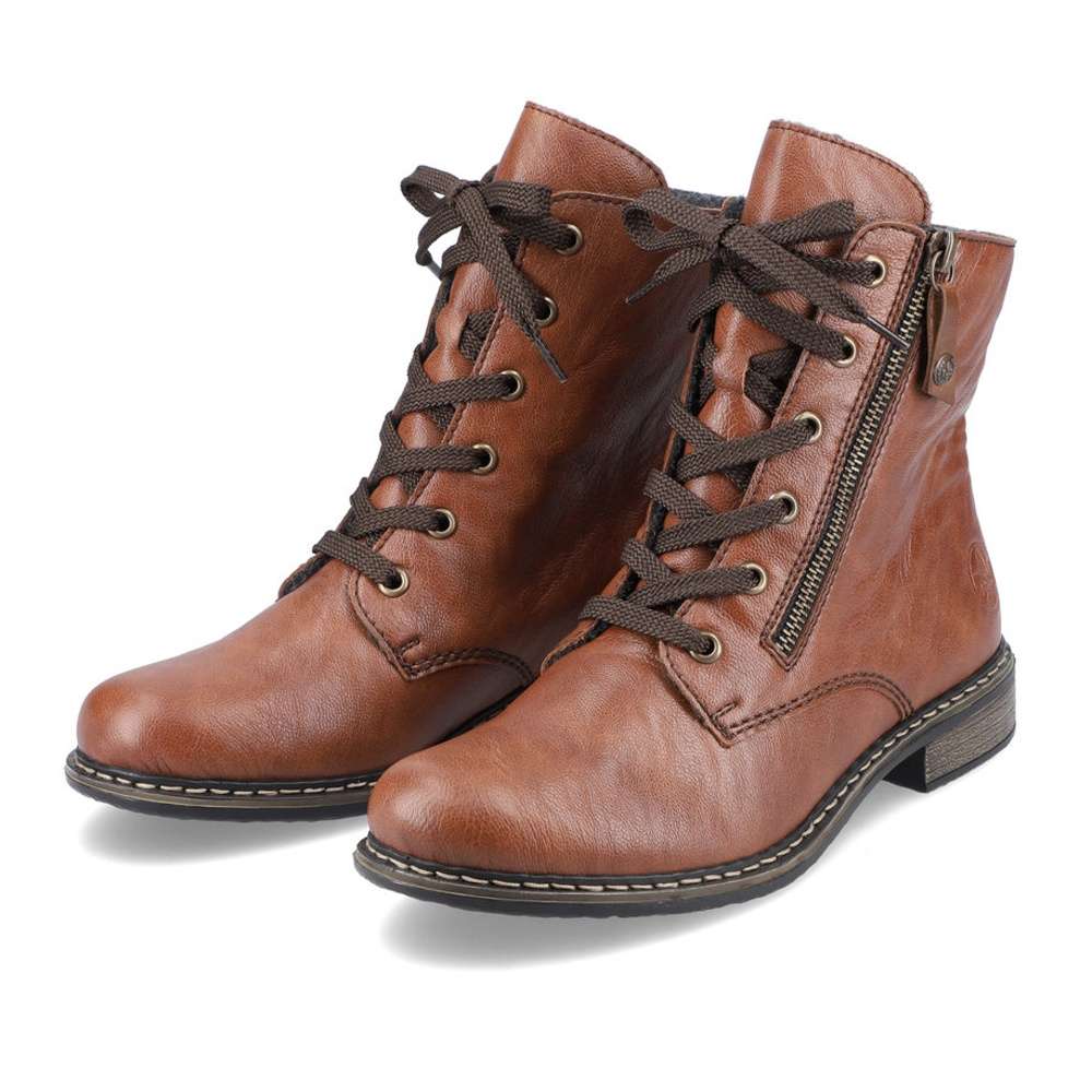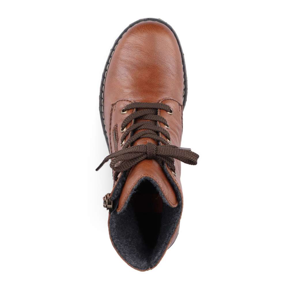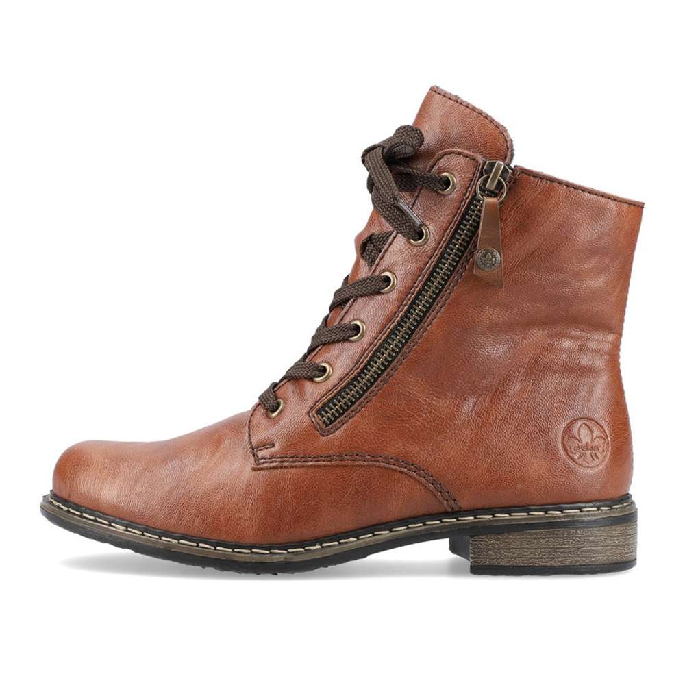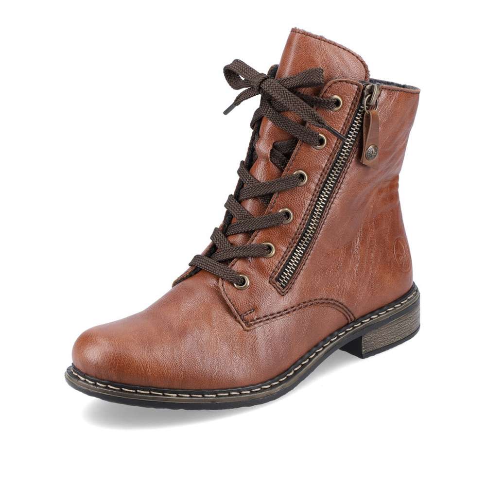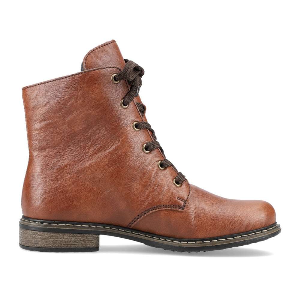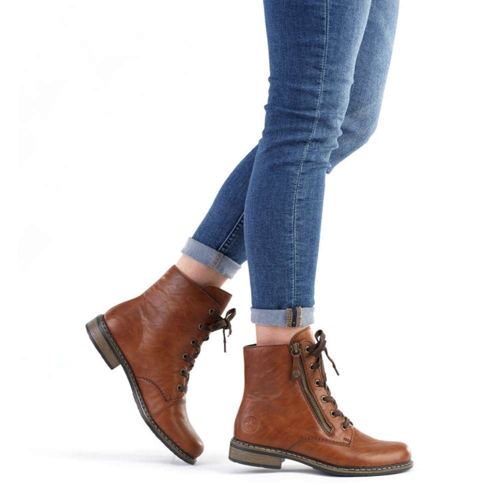 Jednoduchá krása této kotníkové obuvi značky RIEKER Vás zaručeně upoutá. Hladký hnědý svršek je ozdoben jemným kontrastním prošíváním, vytlačeným logem značky a zipem na vnější straně. Ten společně se šněrováním usnadní Vaše nazouvání a přizpůsobení obuvi. Pro komfortní každý krok je stélka příjemně měkká a pocit tepla zajistí podšívka. K těmto skvostným botám si můžete vzít buď kalhoty či teplou bundičku a vyrazit s kamarádkami na kávu, nebo je můžete doplnit krásnou kabelkou z naší široké nabídky. Technologie: Antistress – podešev je díky této technologii lehká, flexibilní, absorbuje nárazy při došlapu a snadno se přizpůsobí každé noze.
