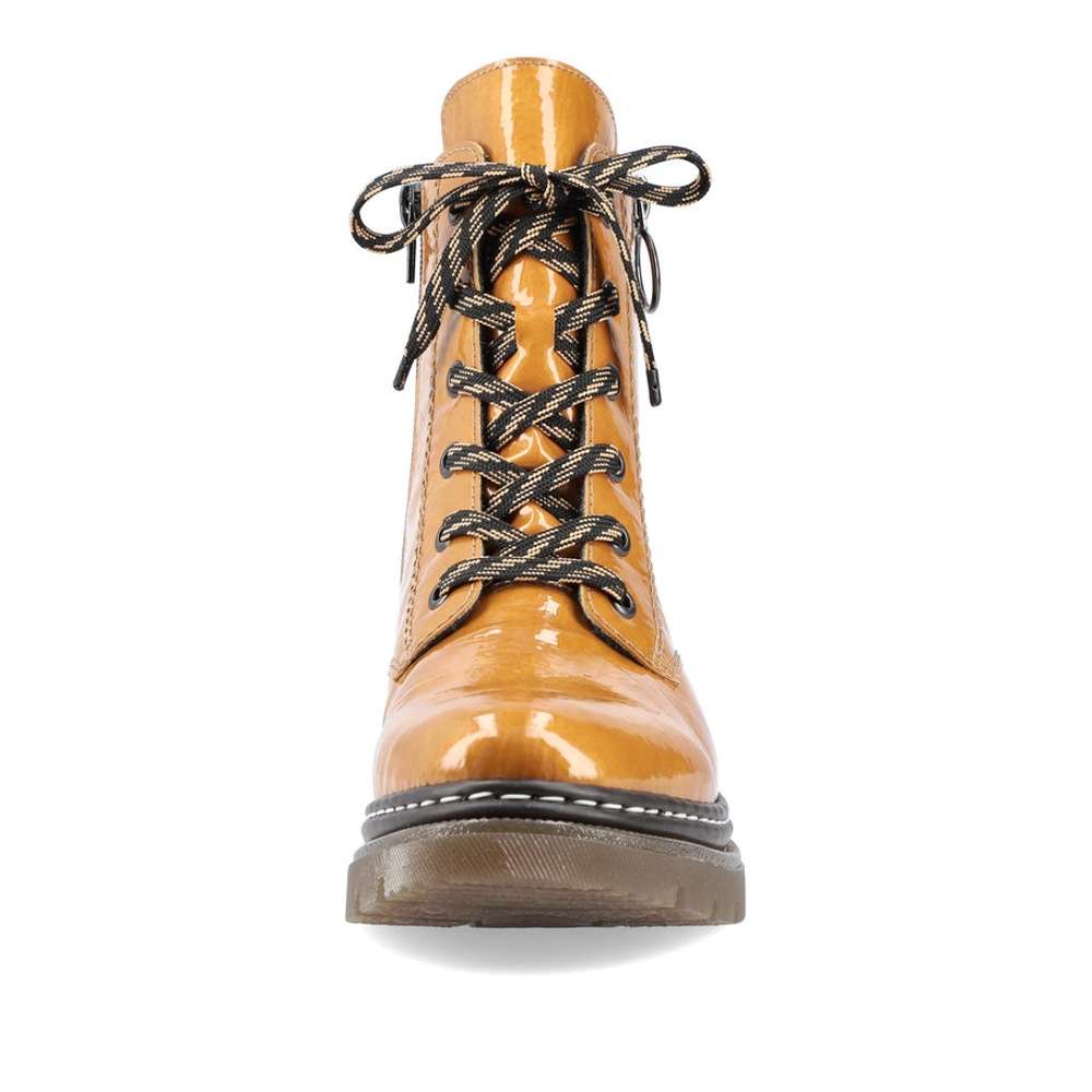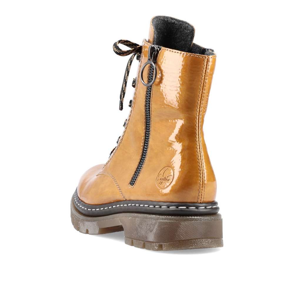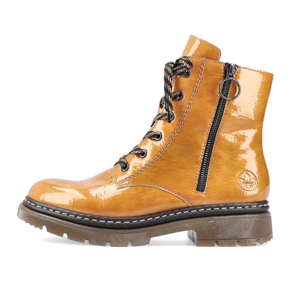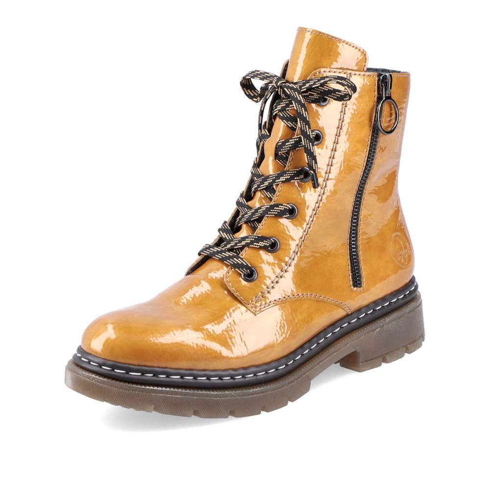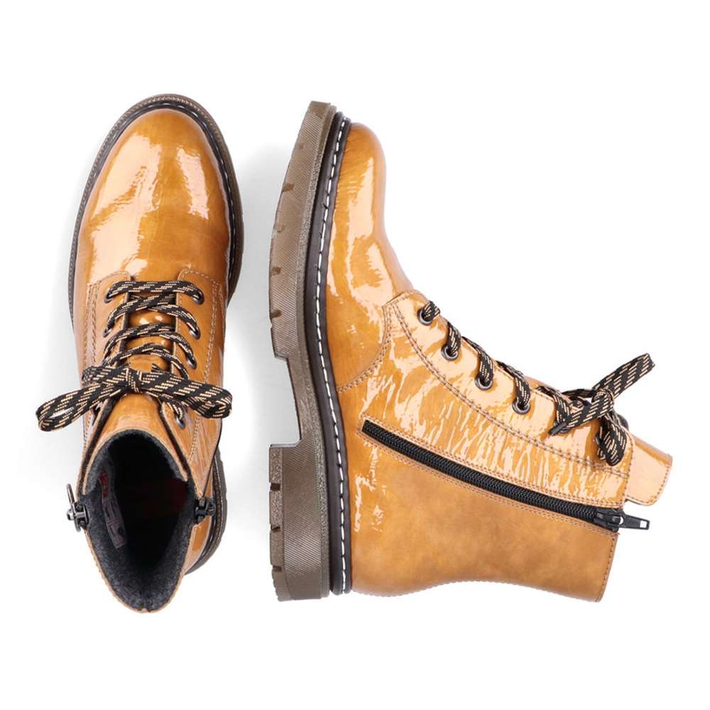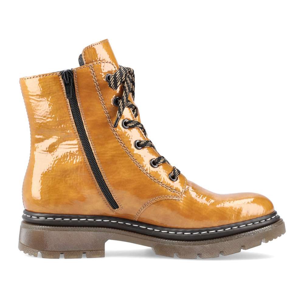 Procházky budou mnohem příjemnější s tímto krásným kotníkem v nádherné žluté barvě. Dokonalost podtrhne jednoduchý lakovaný svršek s logem firmy Rieker na patě a kontrastní šití designové podešve. Na straně je funkční zip pro snadné obutí a šněrováním si je upravíte dle svých potřeb. Velurová podšívka se postará o pocit tepla v chladných dnech a měkká stélka o pohodlí na každém kroku.