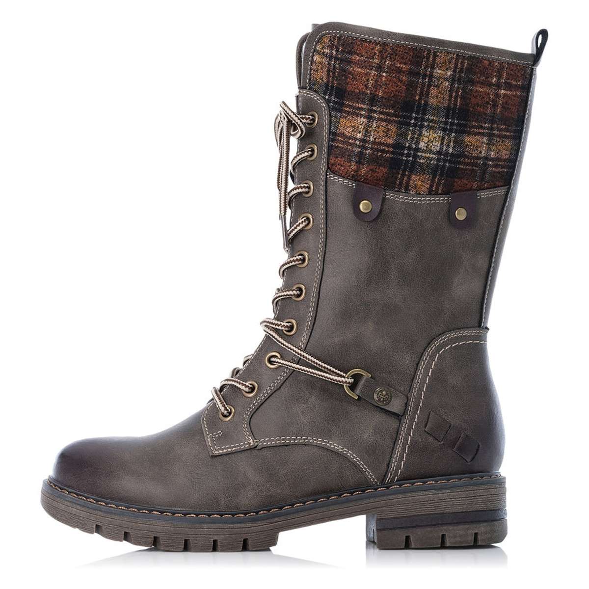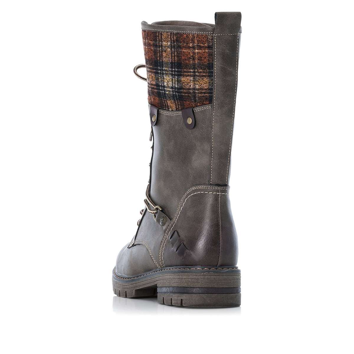 Šedý svršek je v horní části obohacený károvaným vzorem a světlým šitím, které dodává jedinečný styl. Spolu se zipem a šněrováním se obujete raz dva, abyste mohla vyrazit na svoje pochůzky.