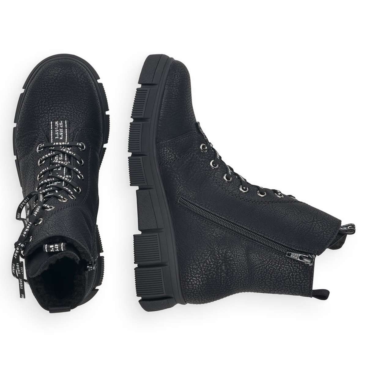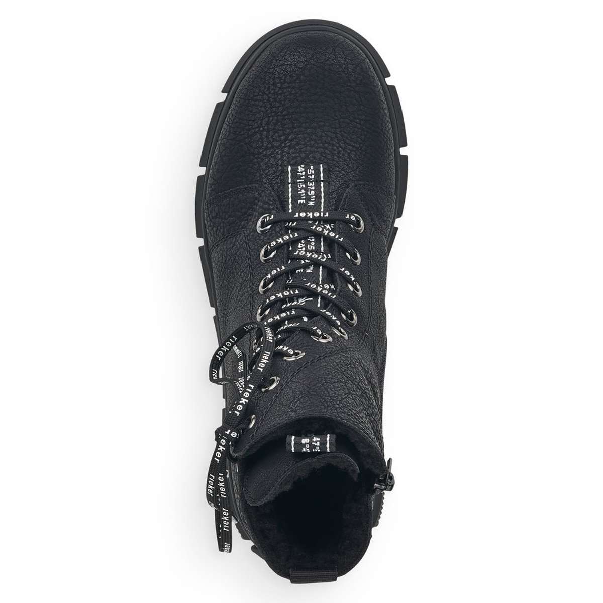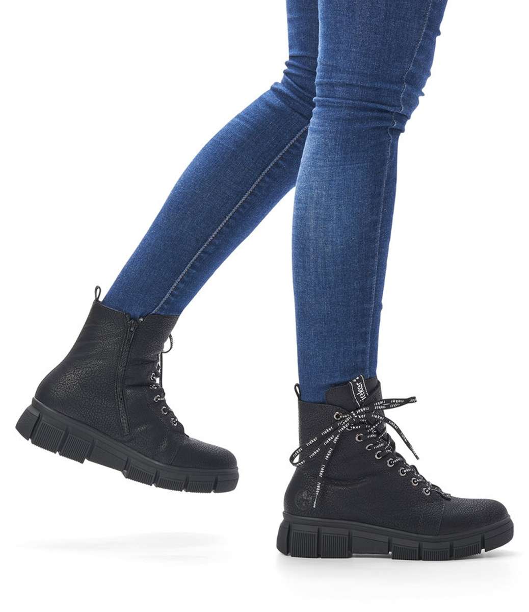 Jsou výrazně ozdobeny tkaničkami s nápisem RIEKER a kovovými kroužky, kterými tyto tkaničky provlékáte. Pro snadné obutí poslouží i zip z vnitřní strany, obuv si tak upravíte dle svých představ.