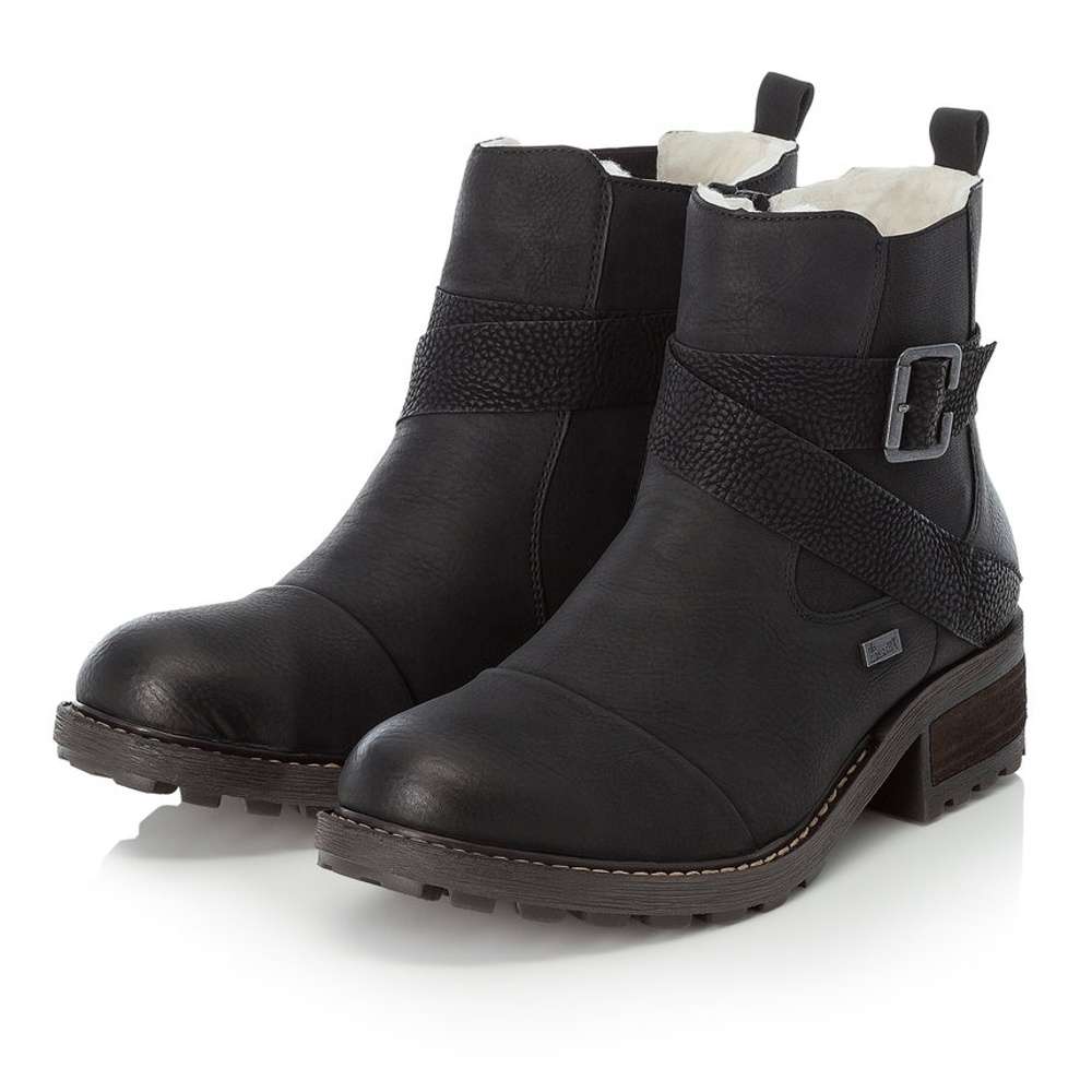 Zimní dámské boty s hřejivou podšívkou, značky RIEKER. Svršek Dámská kotníková obuv v černé barvě má hladký svršek a je dozdobena páskem s přezkou kolem kotníku a hnědým pruhem v podpatku. Pro snadné nazouvání slouží praktický zip z vnitřní strany. Stélka Stélka je příjemně měkká a zaručí Vám pohodlí po celý den. Navíc také oceníte podšívku s kožíškem z pravé ovčí vlny, která Vás zahřeje při chladném počasí. Podešev Podešev je vysoká cca 4 cm a díky technologii Antistress je lehká, flexibilní a absorbuje nárazy při došlapu. Tento kousek se jistě stane Vašim oblíbeným doplňkem k zimním a podzimním outfitům. Technologie: Antistress, Rieker TEX