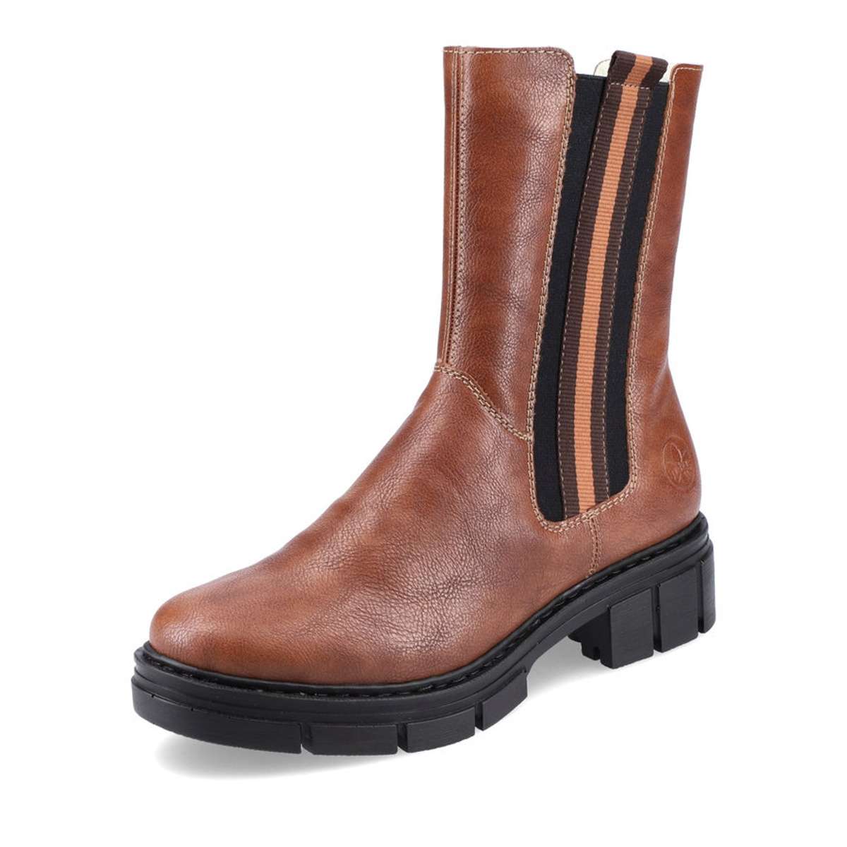 Vyšší kotníková obuv od značky RIEKER s hladkým hnědým svrškem a barevnými proužky na vnější straně. Pro snadnější obutí je zde použita pružná guma a z vnitřní strany je umístěn funkční zip.