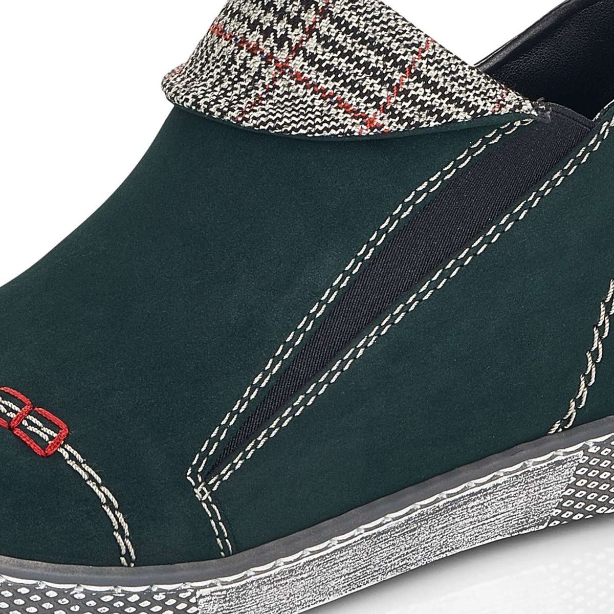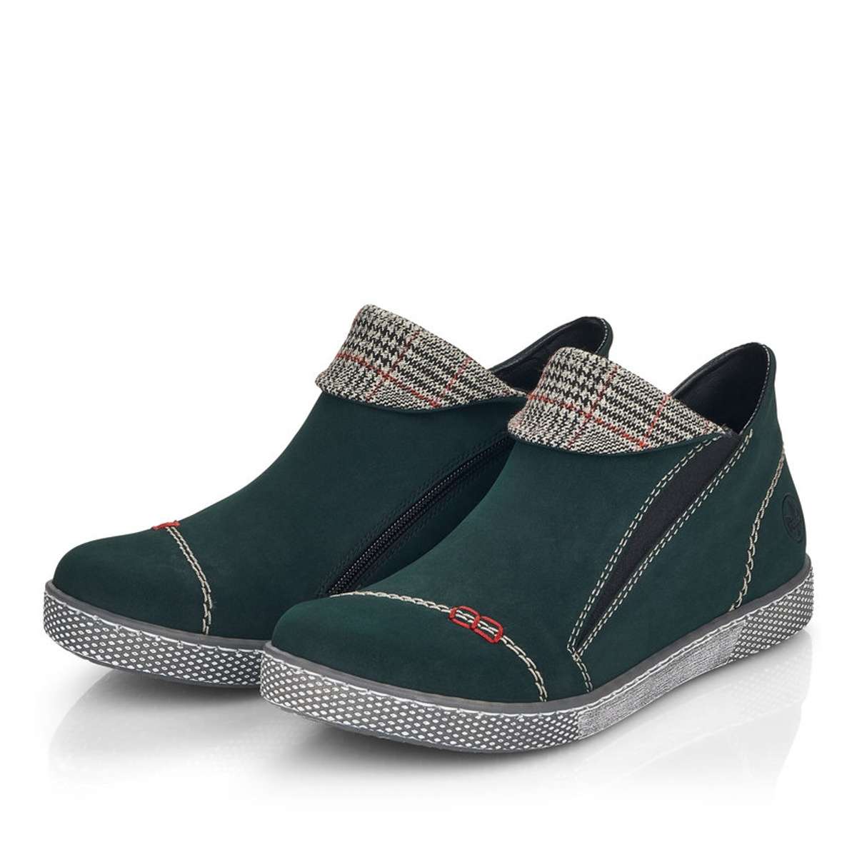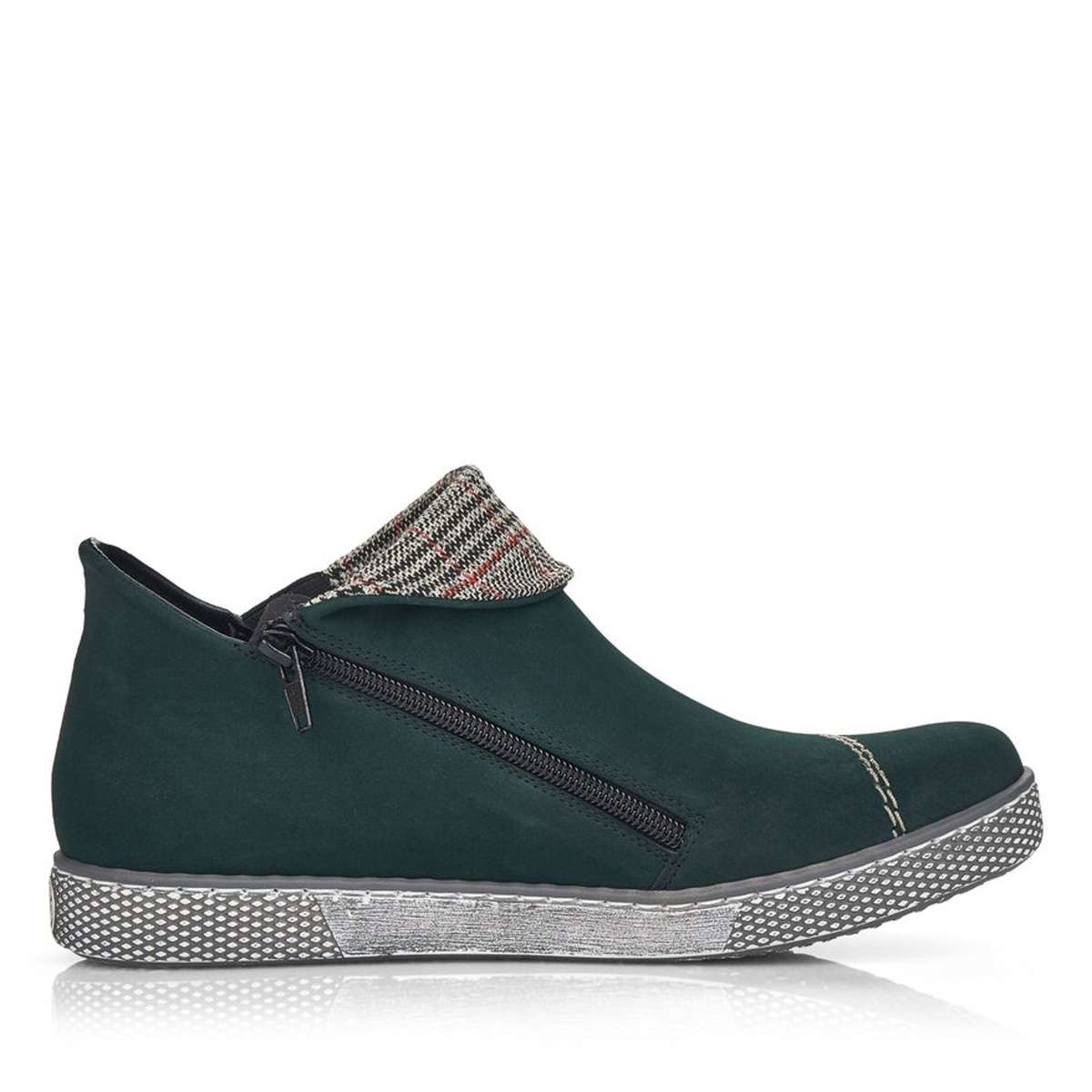 Nižší kotníková obuv v tmavě zeleném odstínu, kdy dominujícím prvkem je výrazné prošití a károvaný ohyb. Pro snadnější obutí je zde použita pružná guma a z vnitřní strany je umístěn funkční zip.