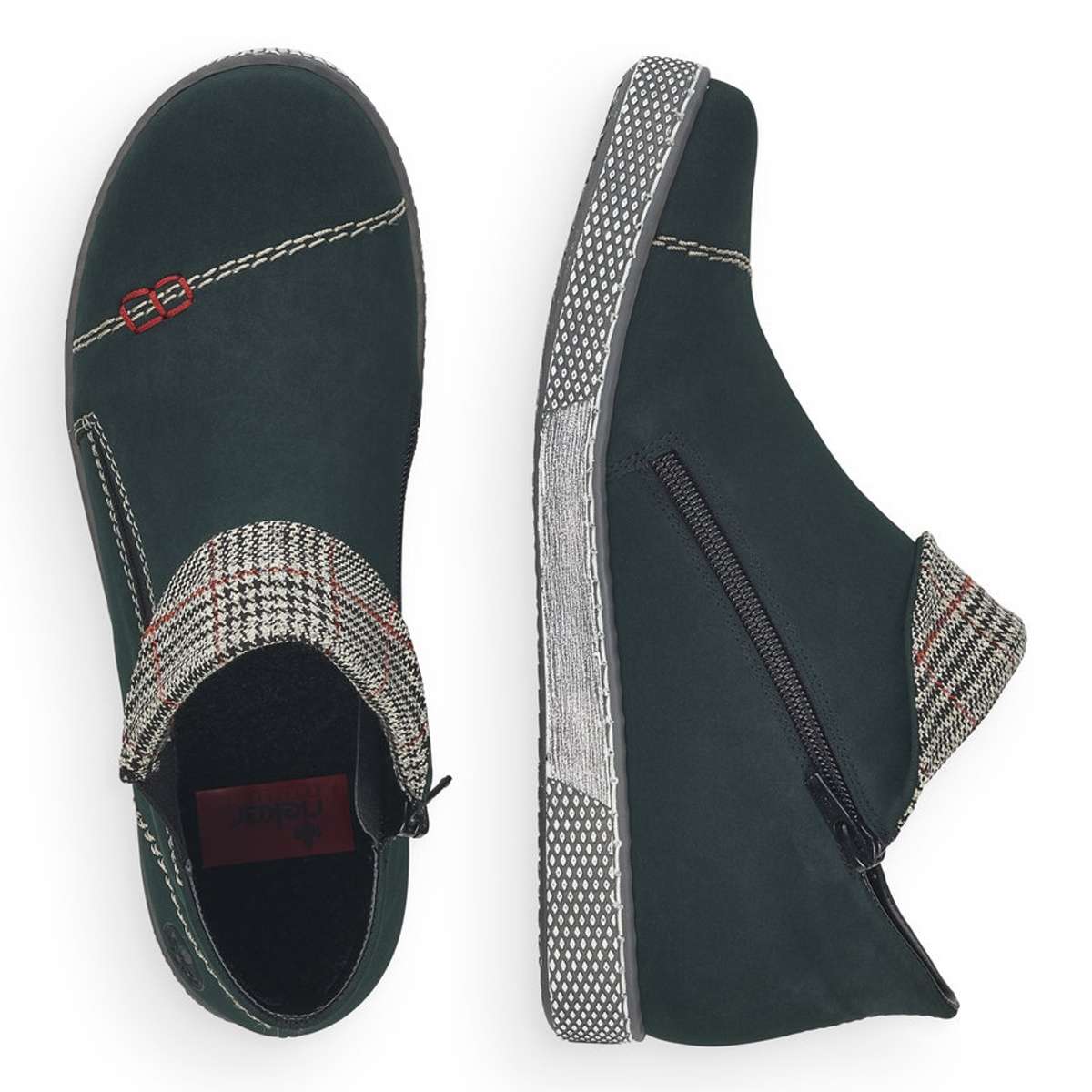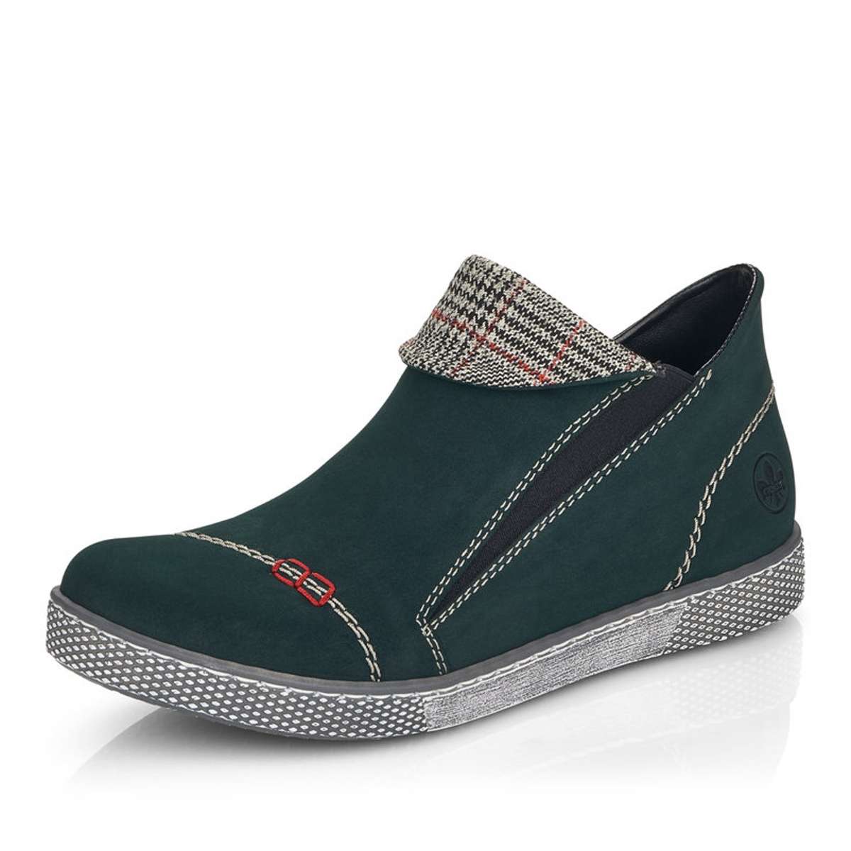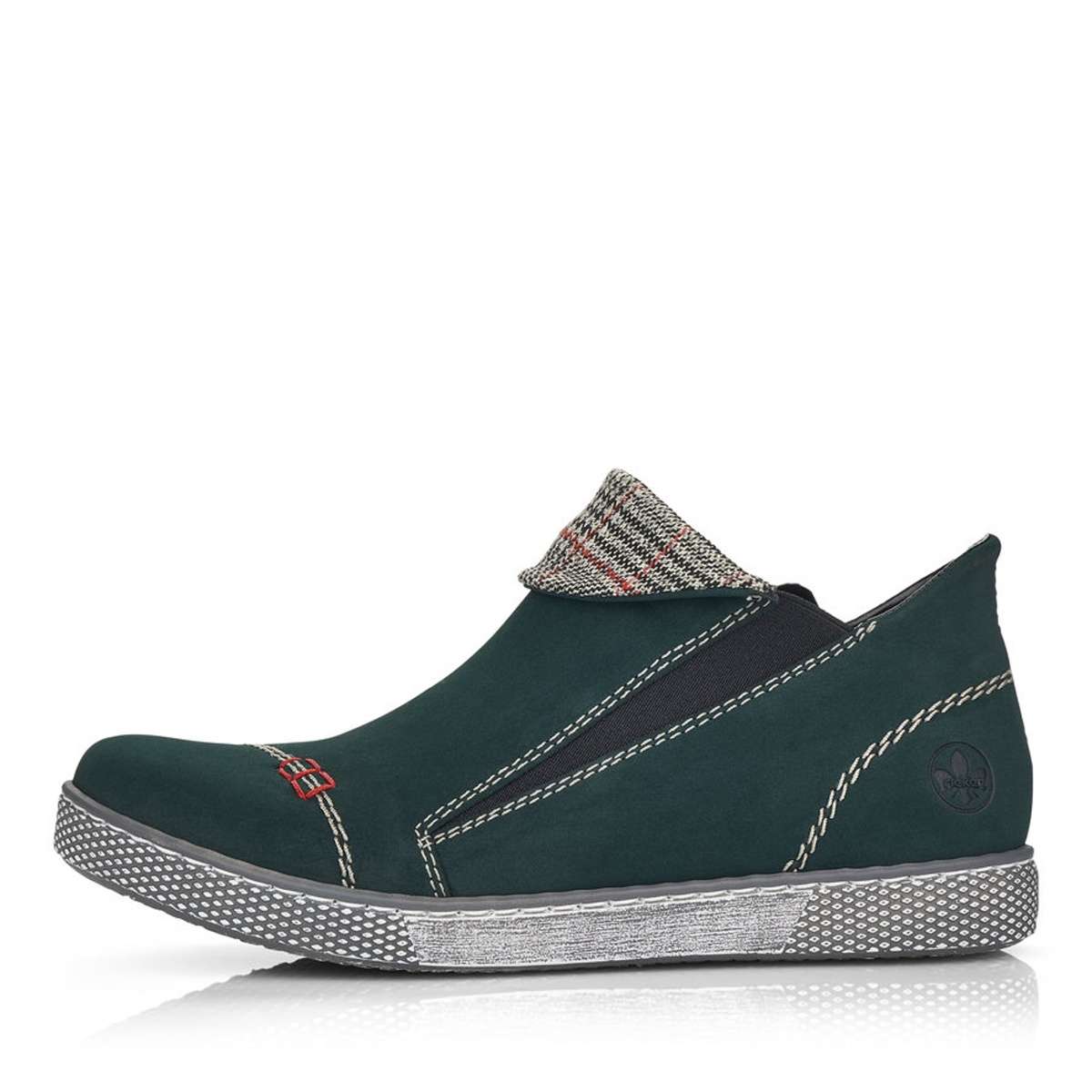 Nižší kotníková obuv v tmavě zeleném odstínu, kdy dominujícím prvkem je výrazné prošití a károvaný ohyb. Pro snadnější obutí je zde použita pružná guma a z vnitřní strany je umístěn funkční zip.