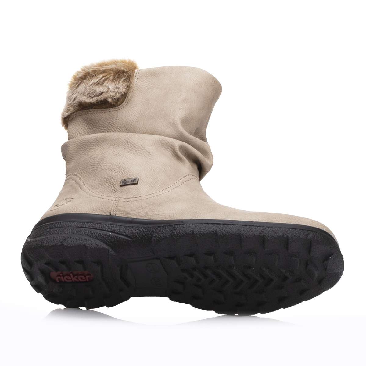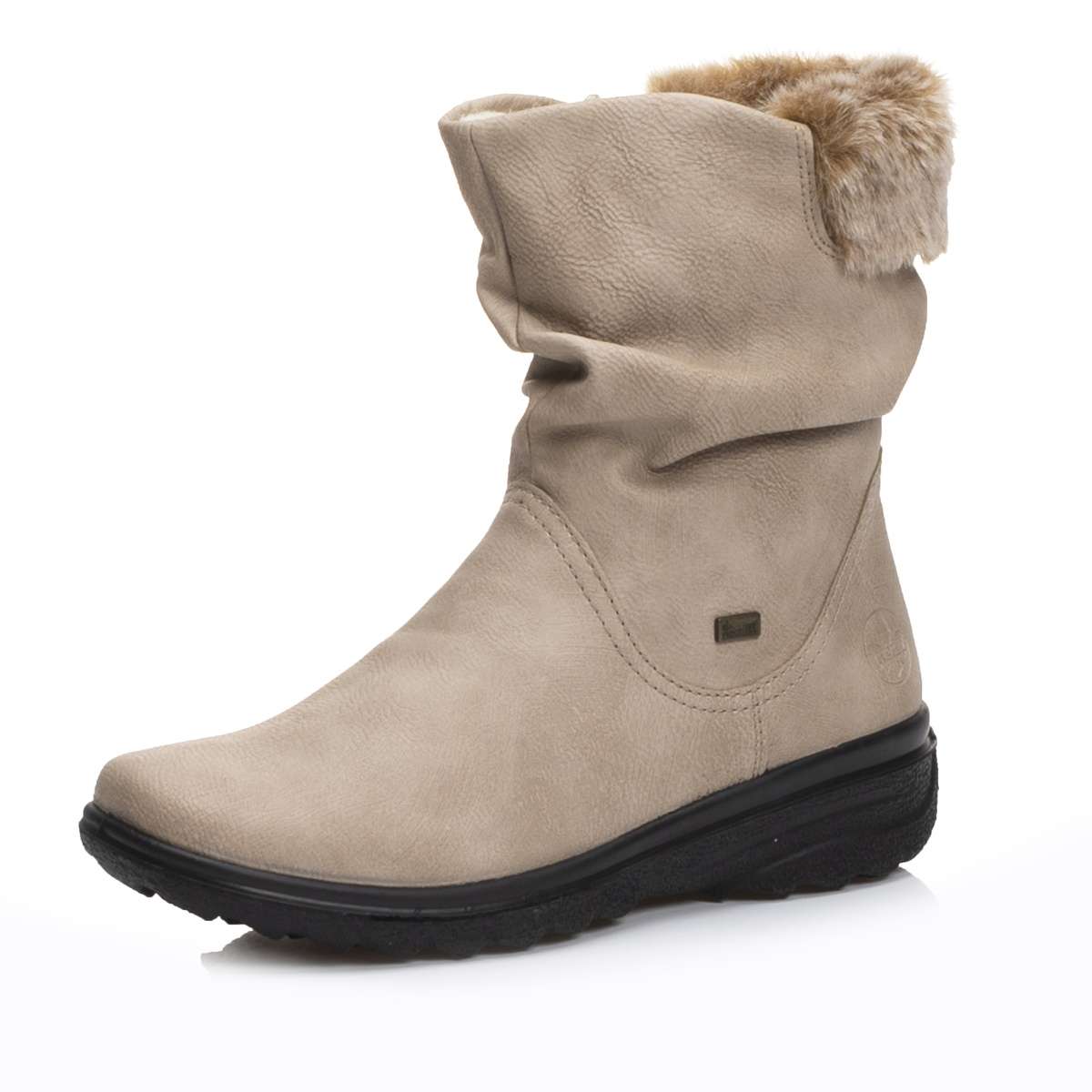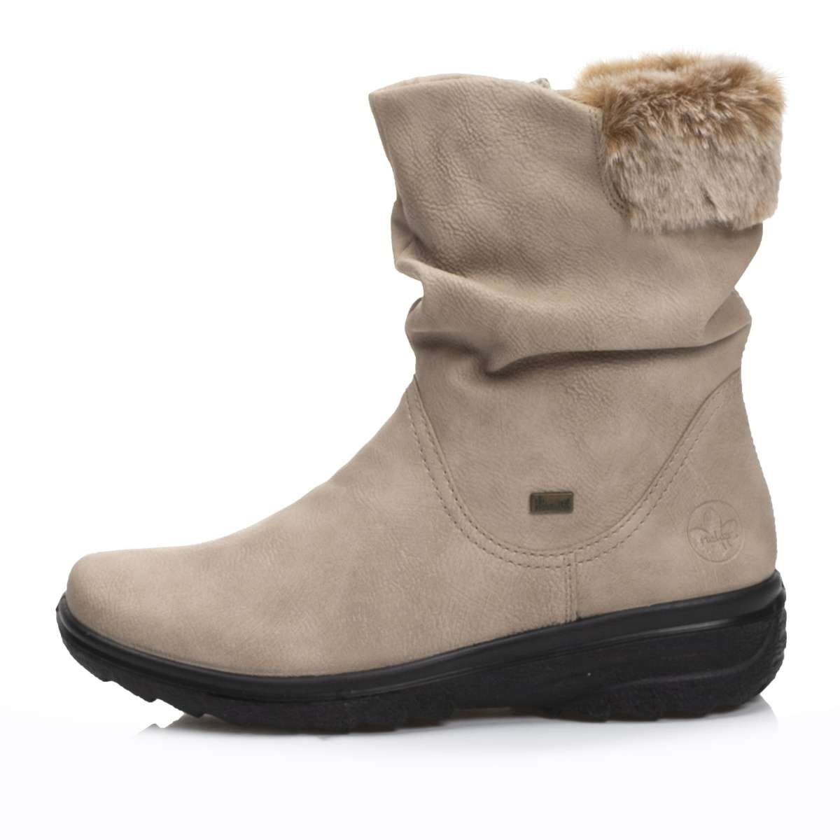 Obuv s celkovou výškou cca 21 cm v klasické béžové barvě je zdobná kožíškem v zadní části horního okraje, řasením kolem kotníku a elegantním šitím. Na vnitřní straně je funkční zip pro snadné nazouvání. Funkční vrstva Rieker TEX zajistí, že je bota nepromokavá a přesto prodyšná.