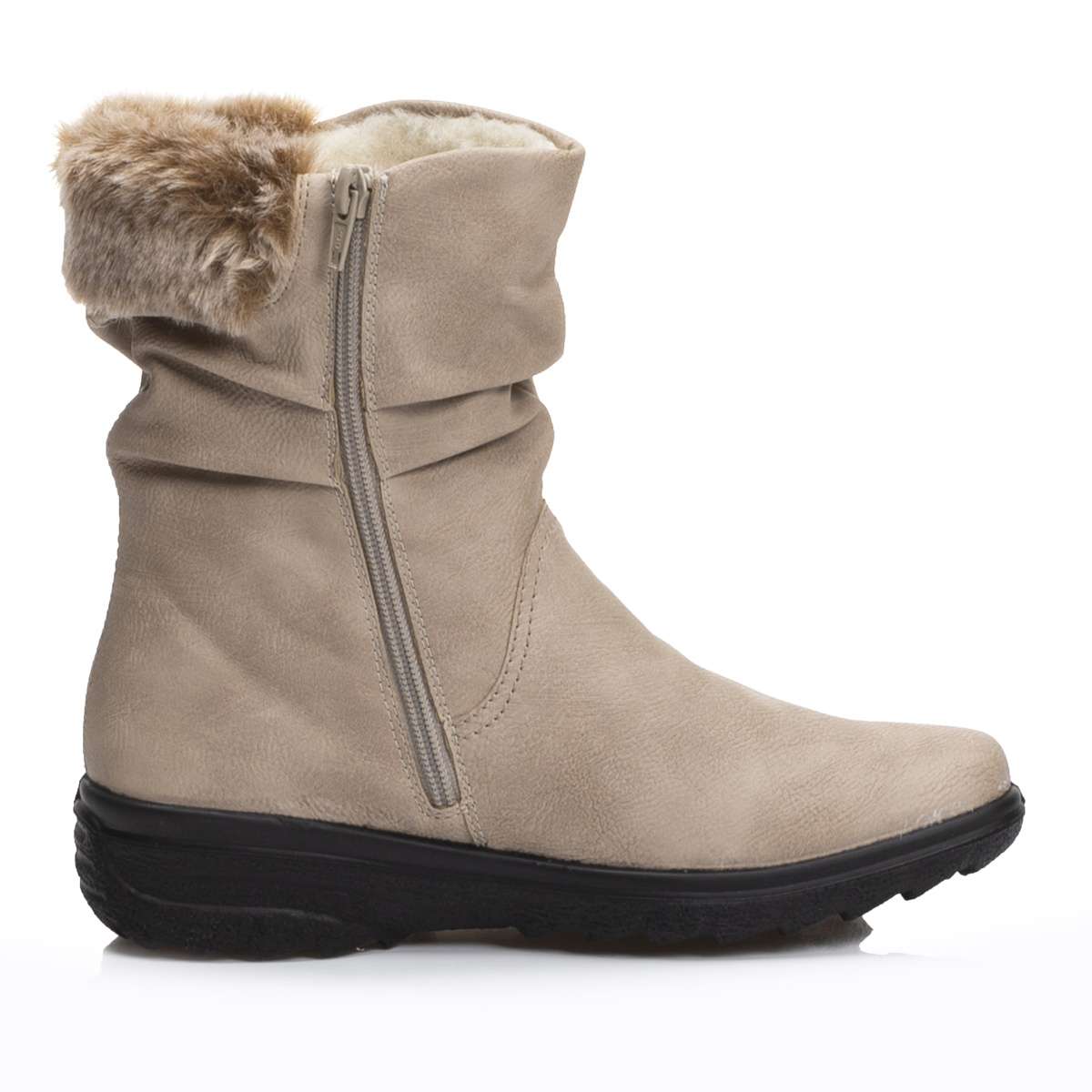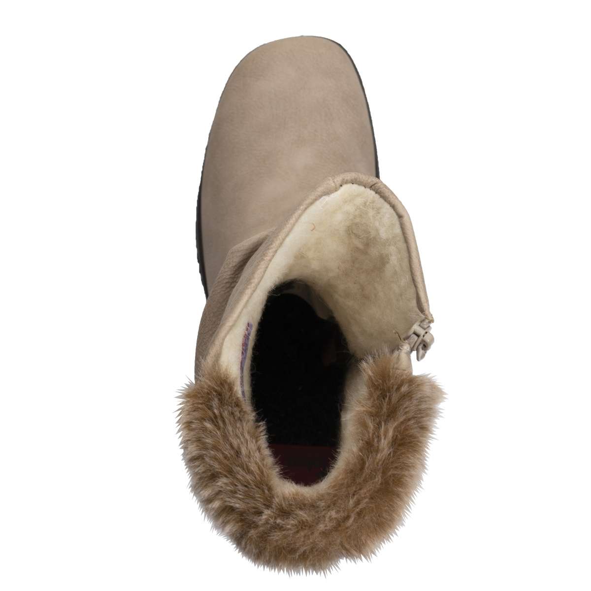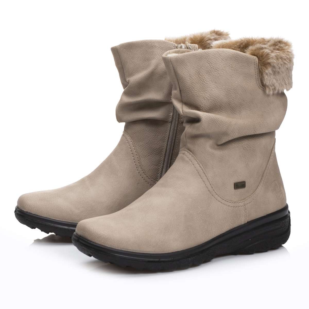 Obuv s celkovou výškou cca 21 cm v klasické béžové barvě je zdobná kožíškem v zadní části horního okraje, řasením kolem kotníku a elegantním šitím. Na vnitřní straně je funkční zip pro snadné nazouvání. Funkční vrstva Rieker TEX zajistí, že je bota nepromokavá a přesto prodyšná.