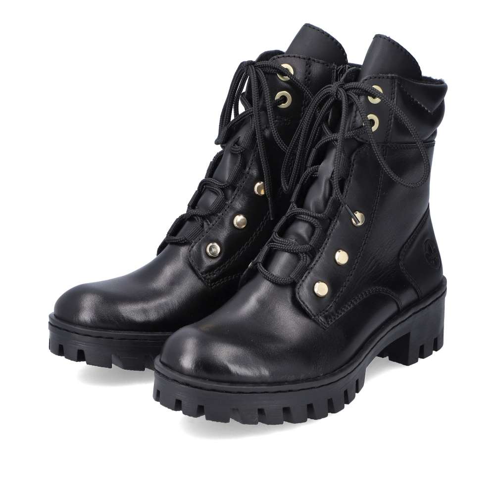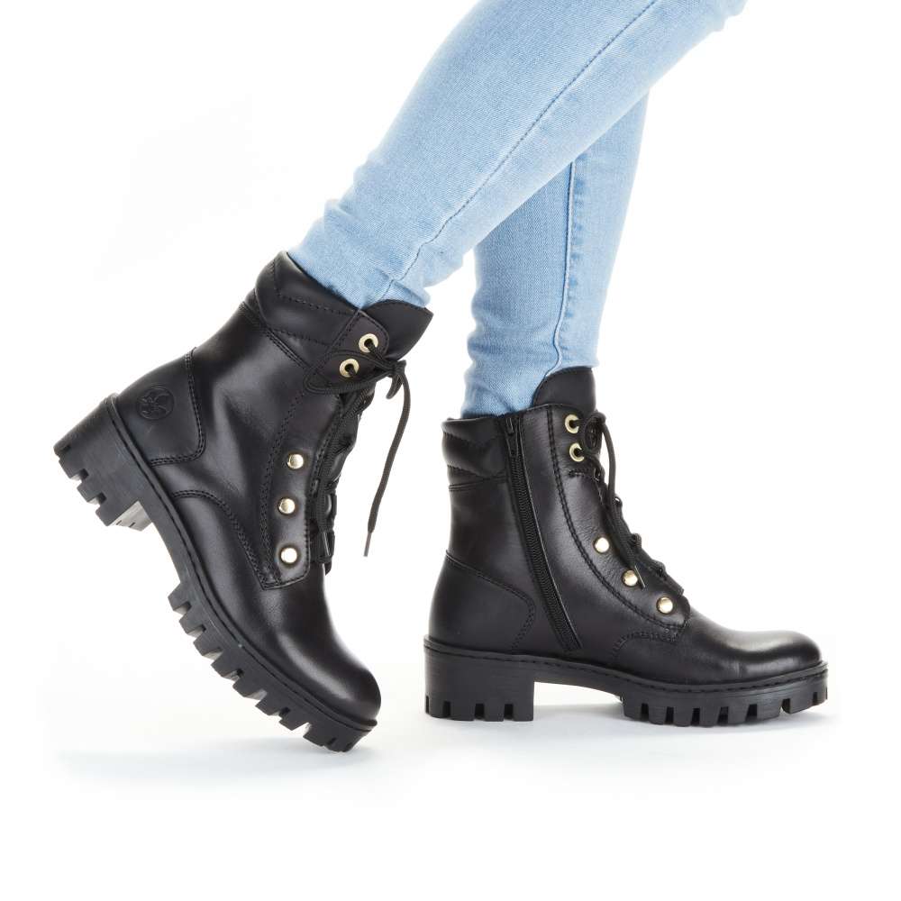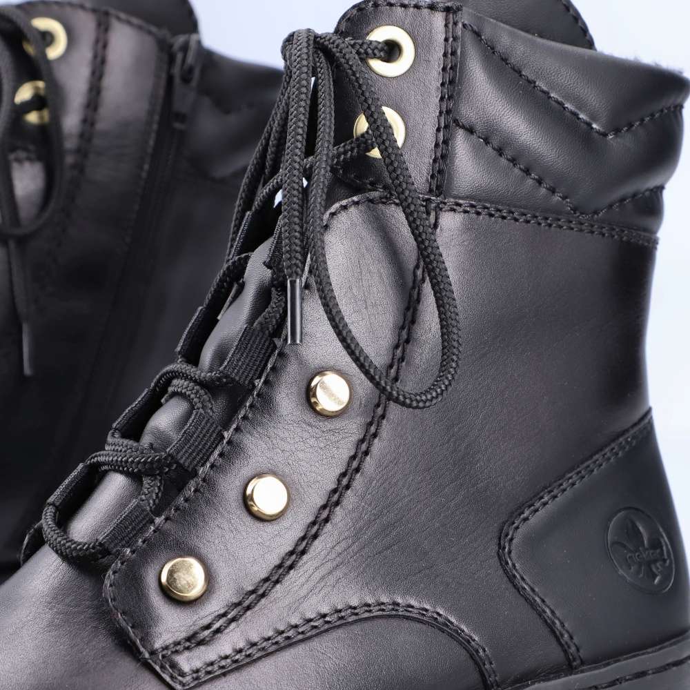 Tato obuv značky RIEKER je spojením originality a vysokého pohodlí. Hladký svršek je vyroben v kombinaci kožených a syntetických materiálů. Je zdoben jemným prošíváním a decentním logem značky. Boty na první pohled zaujmou zajímavým šněrováním. Tkaničky jsou provlečeny ve spodní části textilními poutky a v horní části výraznými kovovými očky. Přední část je zdobena kovovými cvočky. Vnitřní funkční zip využijete ke snadnému obutí. Pohodlí na každém kroku zajistí měkoučká stélka. Tyto boty využijete všude tam, kde budete chtít vyniknout. Technologie: Antistress – podešev je díky této technologii lehká, flexibilní, absorbuje nárazy při došlapu a snadno se přizpůsobí každé noze.