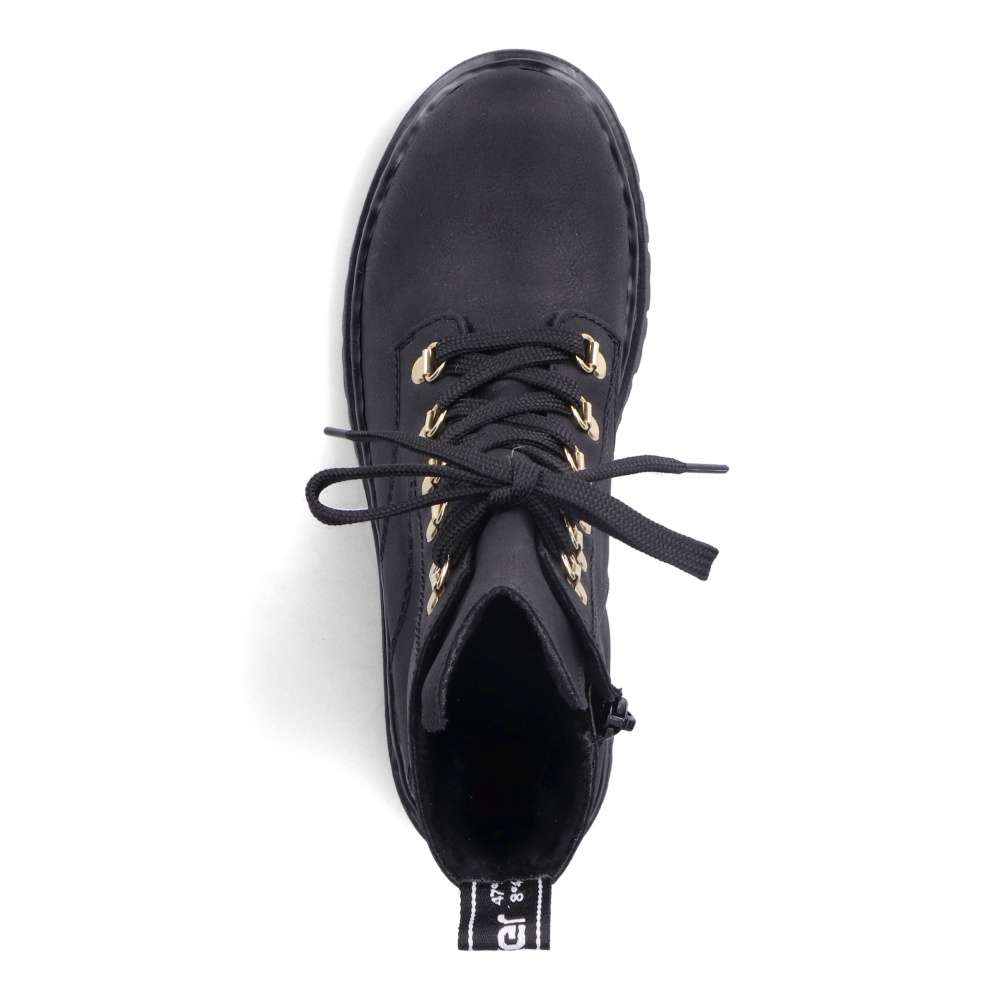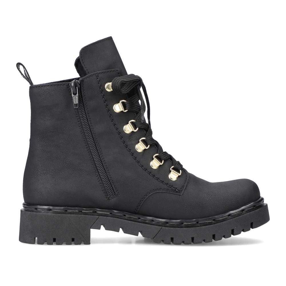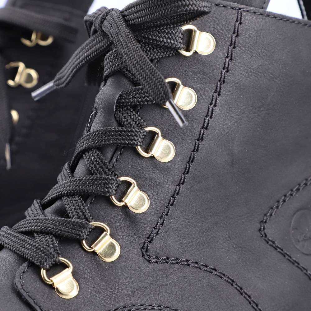 Šitá kvalitní obuv v černé barvě je od značky RIEKER a má jednoduchý design se zlatými nýty na tkaničky. Obuv má hřejivou podšívku a hodí se spíše do přechodového období. Na vnitřní straně se nachází zip pro rychlé nazutí a tkaničkami si můžete obuv přizpůsobit na Vaši nohu. Měkká stélka se Vám dokonale přizpůsobí a chůze bude maximálně pohodlná. Kvalitní podešev zabrání uklouznutí. Technologie: Antistress – podrážka je vďaka tejto technológii ľahká, flexibilná a absorbuje nárazy pri došľape a ľahko sa prispôsobí každej nohe.