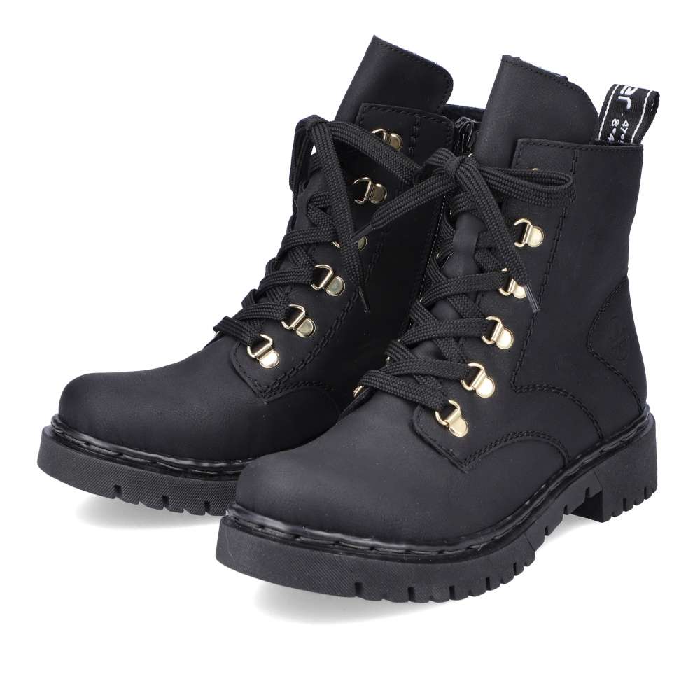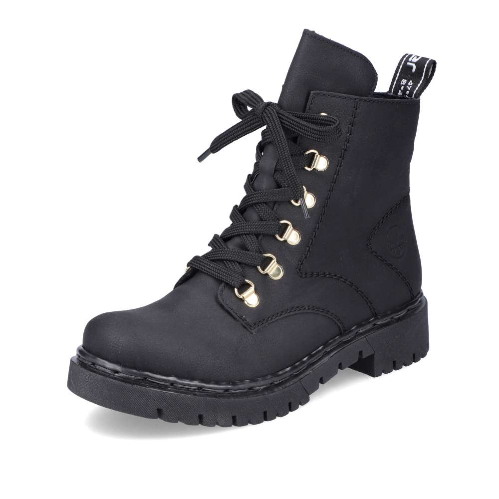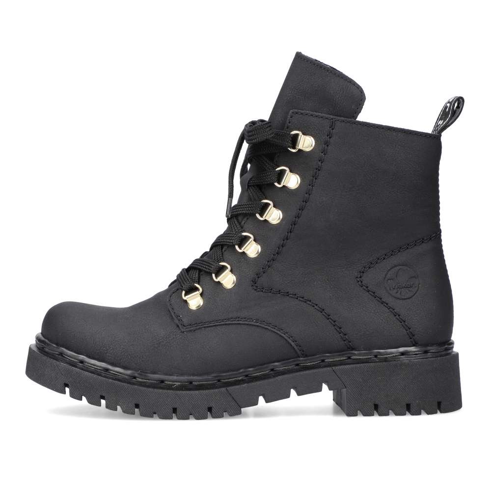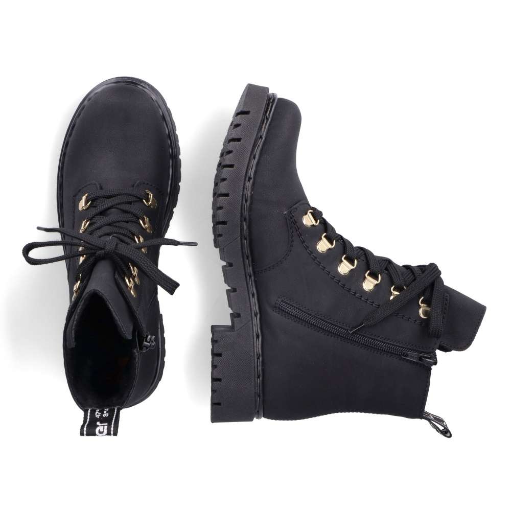 Šitá kvalitní obuv v černé barvě je od značky RIEKER a má jednoduchý design se zlatými nýty na tkaničky. Obuv má hřejivou podšívku a hodí se spíše do přechodového období. Na vnitřní straně se nachází zip pro rychlé nazutí a tkaničkami si můžete obuv přizpůsobit na Vaši nohu. Měkká stélka se Vám dokonale přizpůsobí a chůze bude maximálně pohodlná. Kvalitní podešev zabrání uklouznutí. Technologie: Antistress – podrážka je vďaka tejto technológii ľahká, flexibilná a absorbuje nárazy pri došľape a ľahko sa prispôsobí každej nohe.