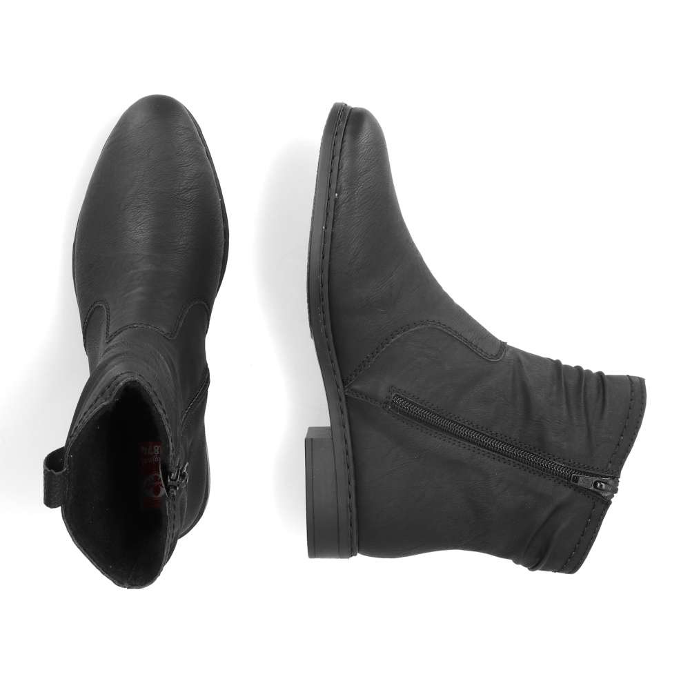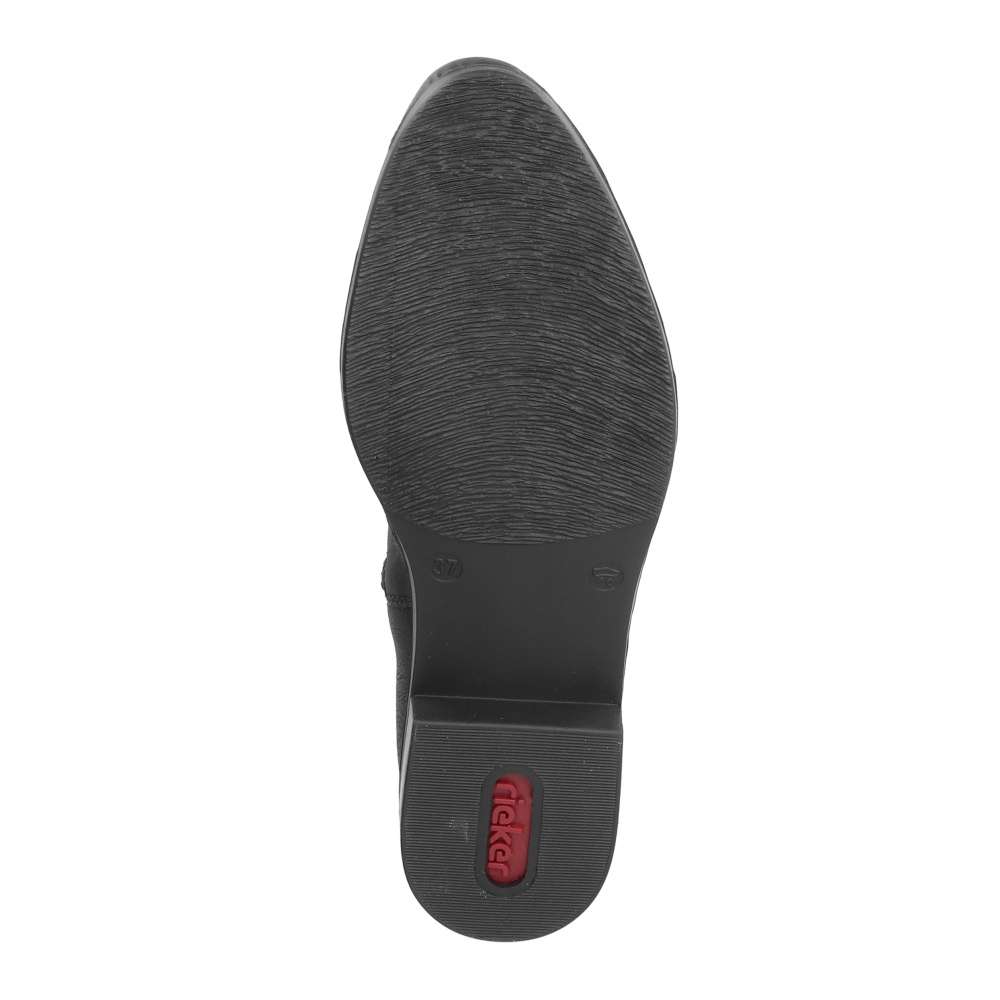 Boty RIEKER s jednoduchým vzhledem budou každodenním obutím všedních dní, pro jejich univerzální vzhled je jednoduše zkombinujete se svým oblečením. Černý svršek zdobí logo značky a jemné nařasení v horní části. Nazutí je snadné díky zipu z vnitřní strany. Flexibilní podrážka Vás bude provázet cestou do práce nebo na nákupy s kamarádkami. Technologie: Antistress – podrážka je díky této technologii lehká, flexibilní, absorbuje nárazy při došlapu a snadno se přizpůsobí každé noze.