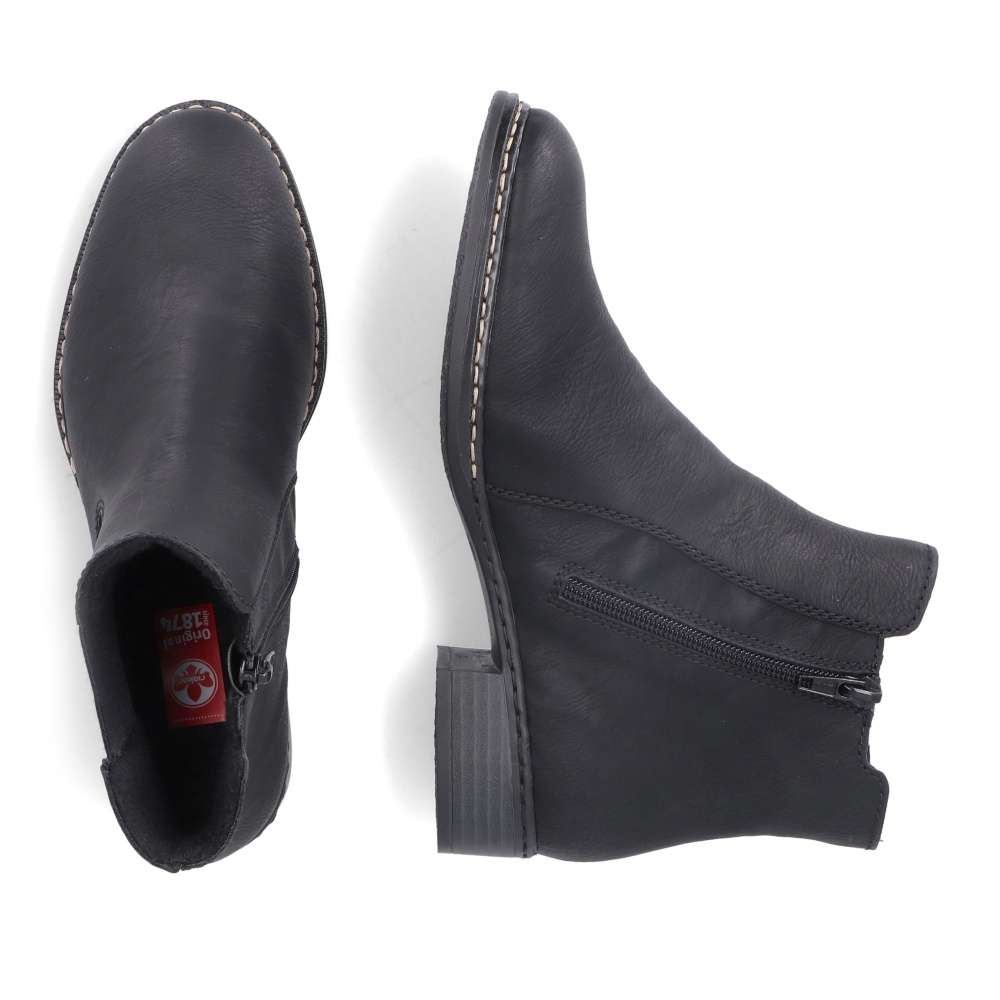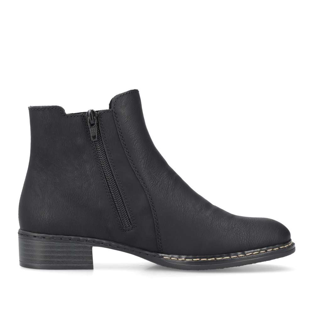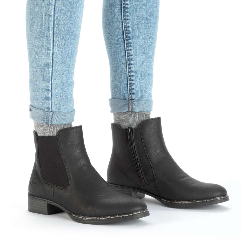 Dámská kotníková obuv RIEKER bude Vaším ideálním každodenním společníkem. Černý svršek má jako ozdobné prvky logo vtisknuté na boku boty, pružnou gumičku na vnější straně, která zároveň pomůže ke snadnějšímu obutí. Zip z vnitřní části usnadní obutí a o pohodlí na každém kroku se postará měkká stélka. Kvalitní podešev s nízkým podpatkem je flexibilní a dekorovaná světlým prošitím v přední části. Tento model je vysoce elegantní a vhodný ke všem pracovním i běžným outfitům. Technologie: Antistress – podrážka je díky této technologii lehká, flexibilní, absorbuje nárazy při došlapu a snadno se přizpůsobí každé noze.
