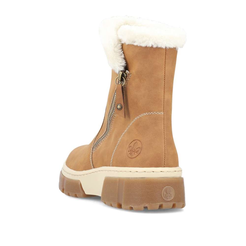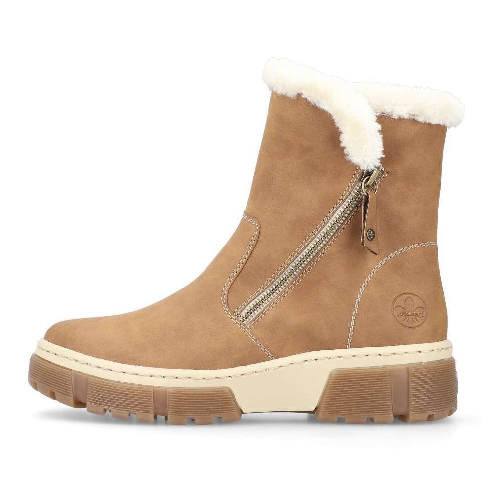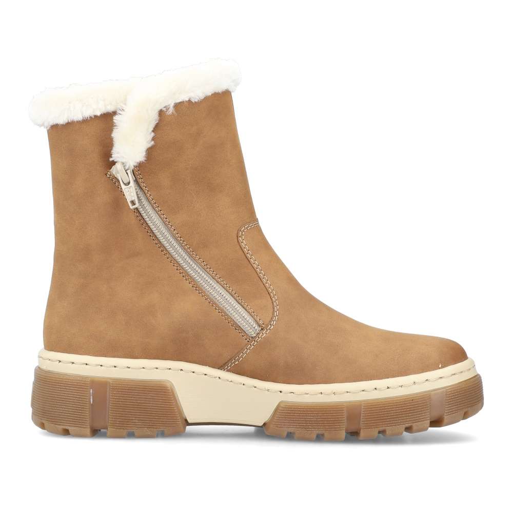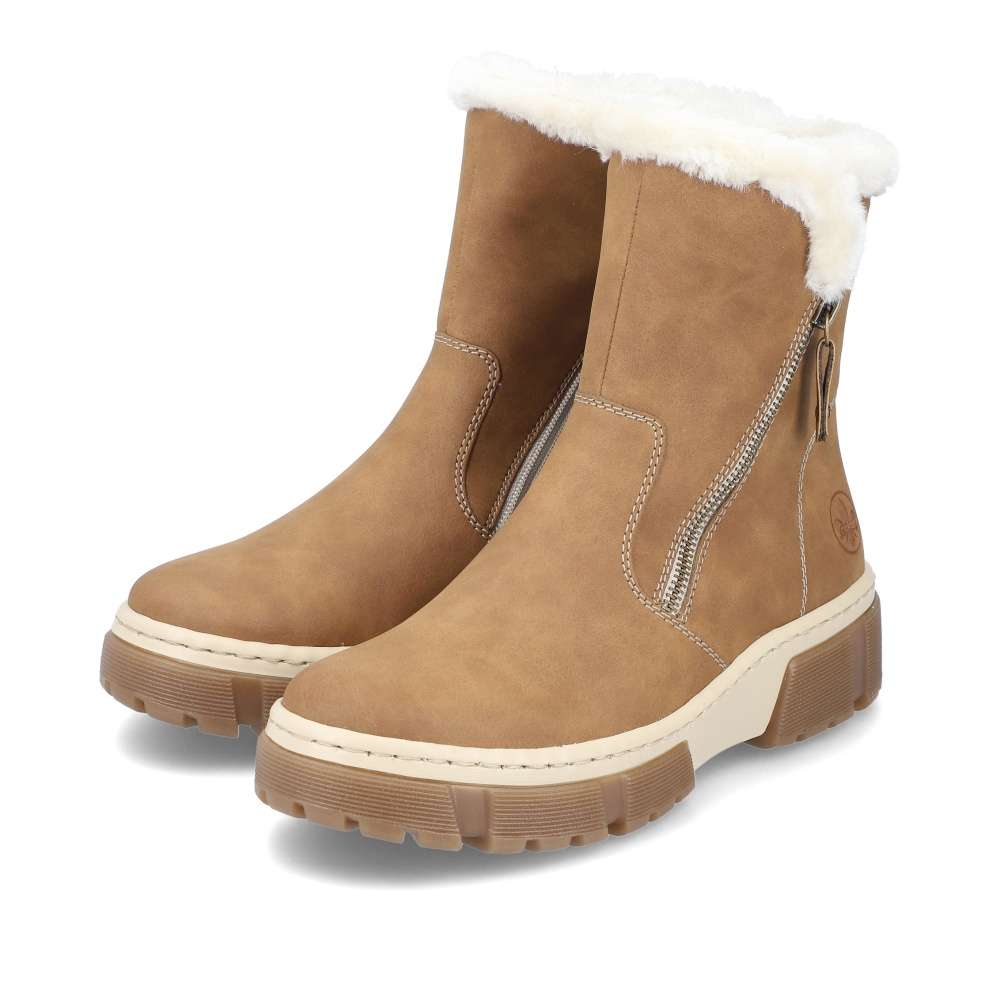 Detailní informace Módní kotník značky Rieker v oblíbené barvě, který zaručeně podtrhne Váš styl a střih vždy oslní. Hnědý svršek je kontrastně ozdoben prošíváním, natištěným logem značky a kožíškovým lemováním horního okraje obuvi. O potřebný komfort na každém kroku se postarají vyjímatelná stélka, vyšší dvoubarevná podešev a teplá podšívka udrží Vaše nohy v teple i během chladných dnů. Kotník skvěle padne ke všem jeansům a stane se tak dokonalým doplňkem.