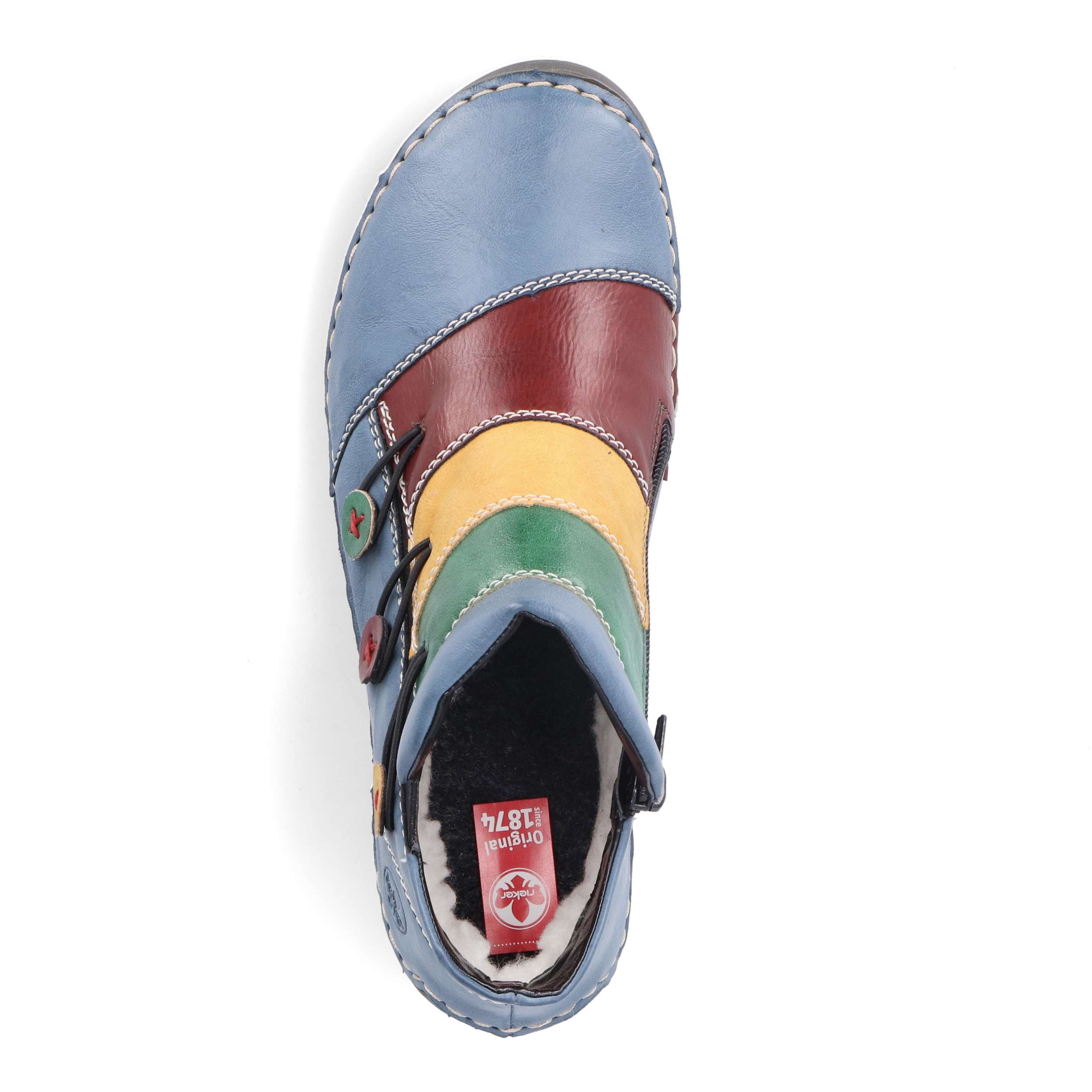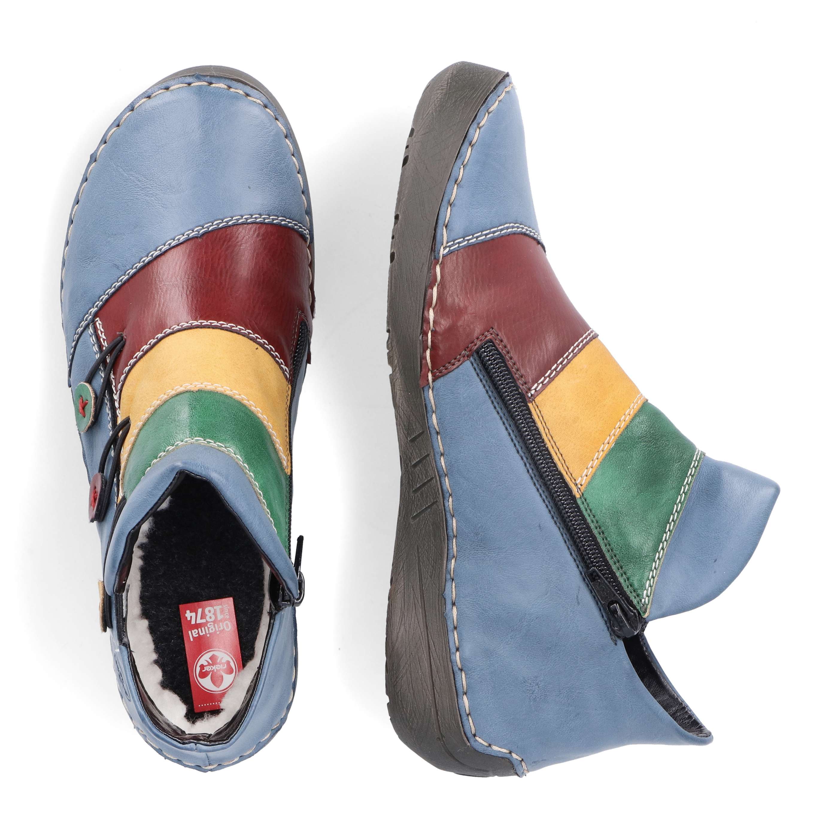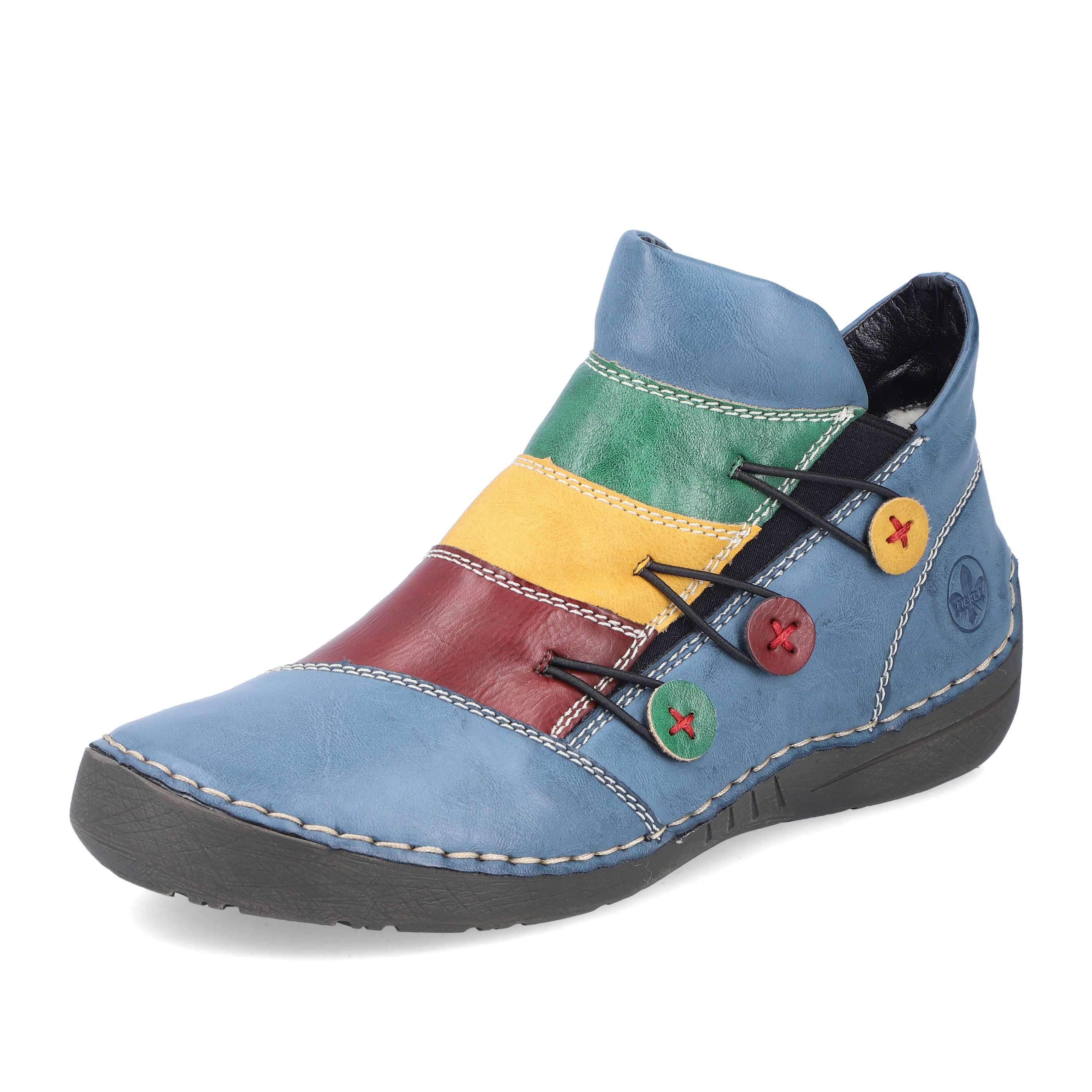 Dámské kotníkové boty značky RIEKER Vás zaujmou na první pohled svým vzhledem a kombinací veselých barev. Botičky jsou opatřeny zipem, tedy jejich obouvání bude lehké a díky vsazené gumičce se dokonale přizpůsobí noze. Podšívka je zateplena hřejivým materiálem, ve kterém Vám bude teplo po celý den a je příjemně měkká. Tato kotníková obuv oživí každý outfit do chladných dnů. Technologie: Antistress – podešev je díky této technologii lehká, flexibilní, absorbuje nárazy při došlapu a snadno se přizpůsobí každé noze.