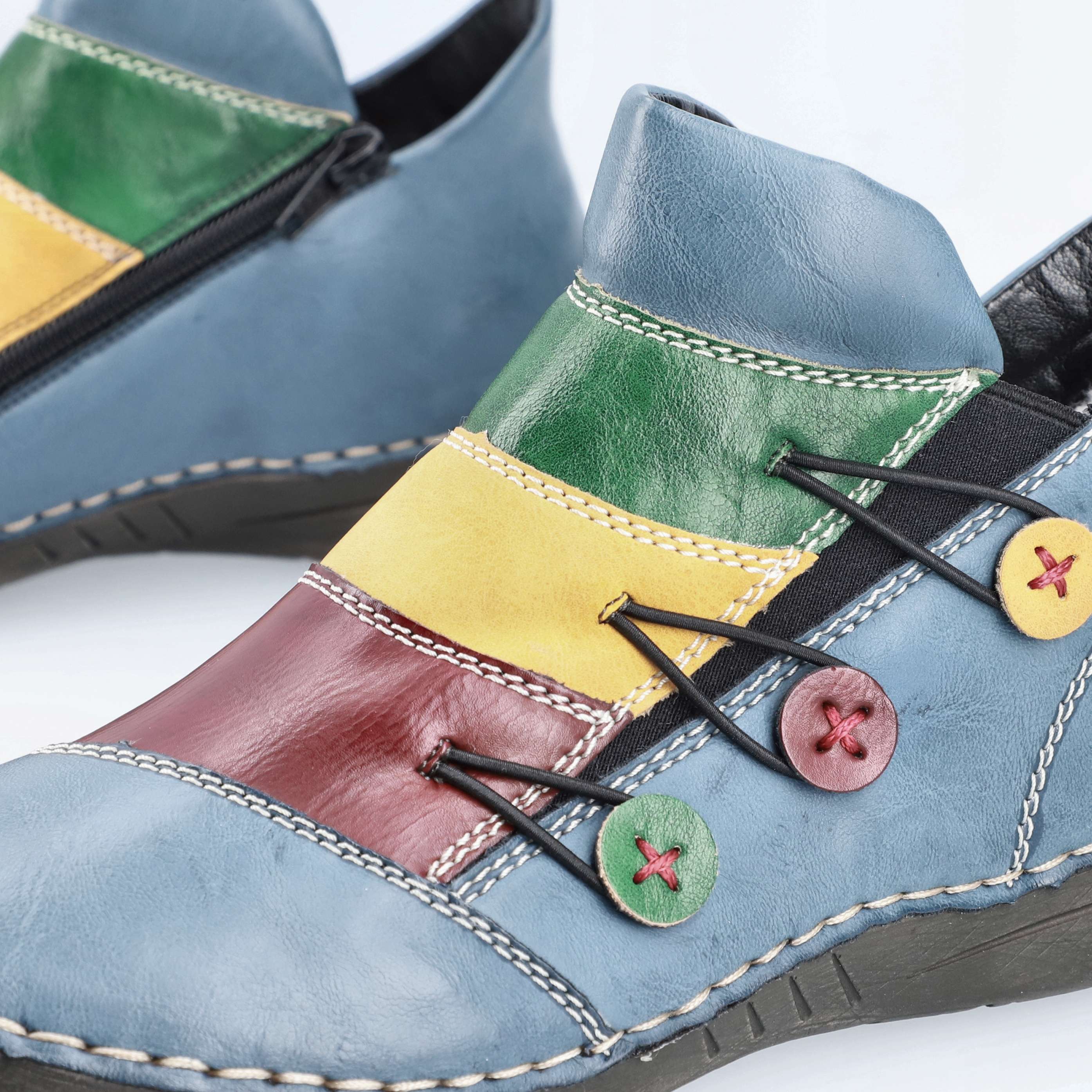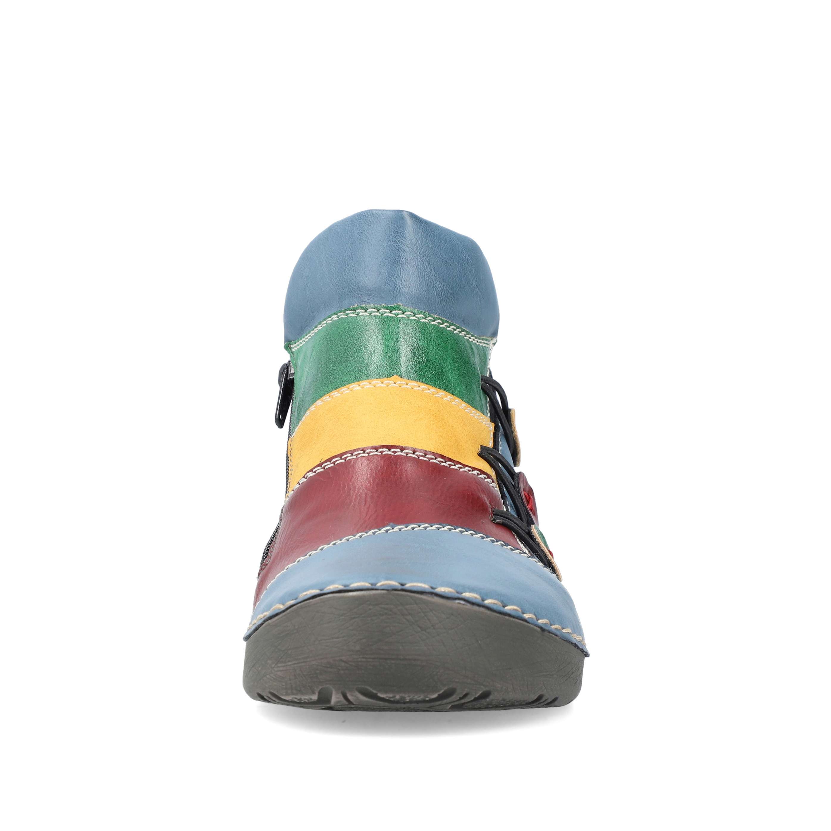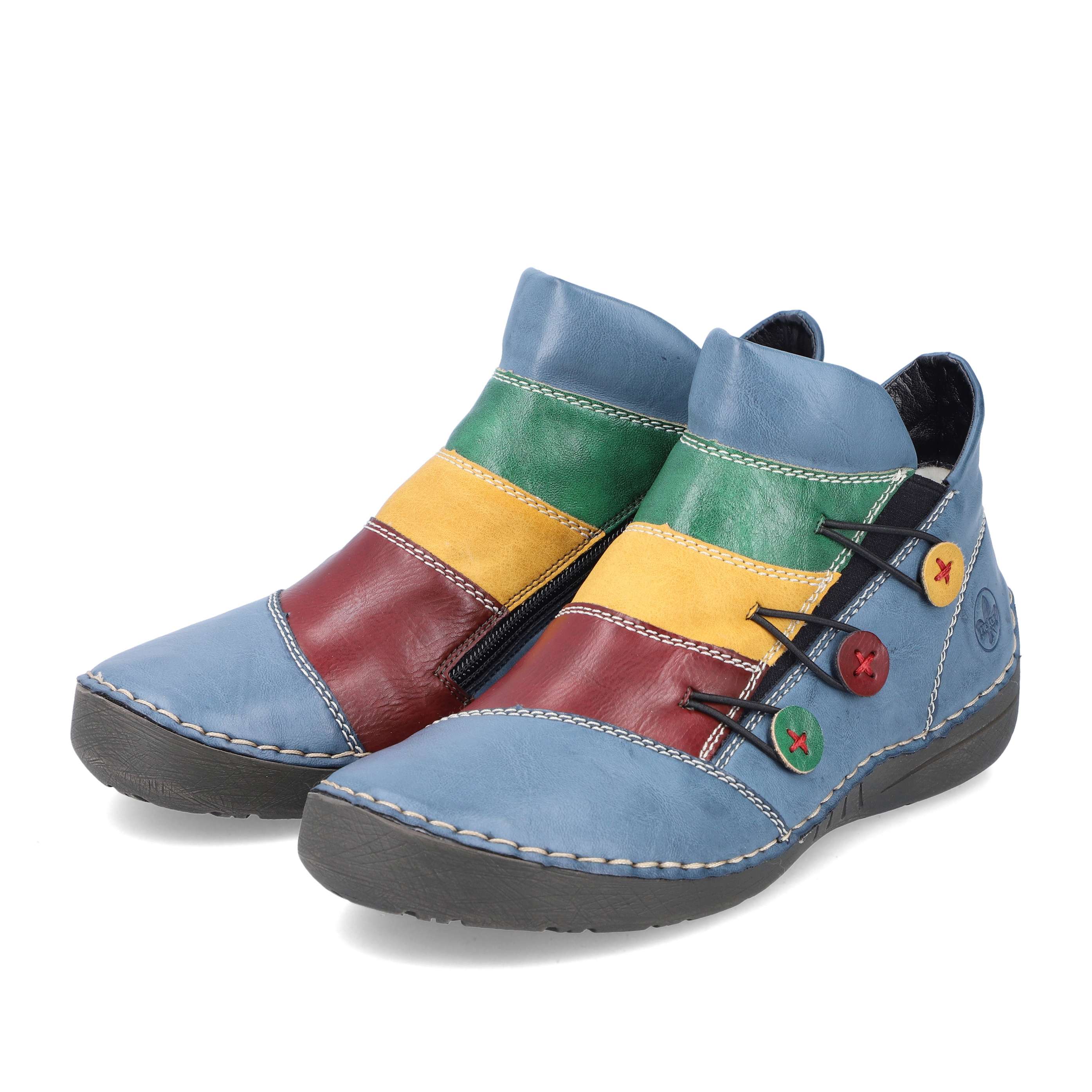 Dámské kotníkové boty značky RIEKER Vás zaujmou na první pohled svým vzhledem a kombinací veselých barev. Botičky jsou opatřeny zipem, tedy jejich obouvání bude lehké a díky vsazené gumičce se dokonale přizpůsobí noze. Podšívka je zateplena hřejivým materiálem, ve kterém Vám bude teplo po celý den a je příjemně měkká. Tato kotníková obuv oživí každý outfit do chladných dnů. Technologie: Antistress – podešev je díky této technologii lehká, flexibilní, absorbuje nárazy při došlapu a snadno se přizpůsobí každé noze.