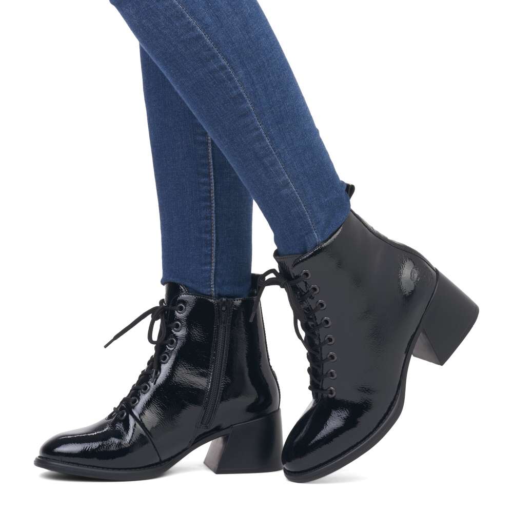 Milovnice módy pozor! Tyto nádherné lesklé kožené kotníčkové boty zdobí decentní logo značky Rieker na patní části. Do botiček jednoduše vklouznete díky skrytému zipu na vnitřní straně a pomocí tkaniček dotáhnete dle potřeby. Umělá kožešina spolu s měkkou stélkou se postarají o pocit pohodlí po celý den. Kvalitní podešev vybavena technologií Antistress, která absorbuje nárazy došlapu disponuje širokým podpatkem, který bude velmi lichotit Vašim nožkám. Zachovejte si svůj styl a pořiďte si tyto botky, které Vás neomrzí. Technologie: Antistress – podešev je díky této technologii lehká, flexibilní, absorbuje nárazy při došlapu a snadno se přizpůsobí každé noze.