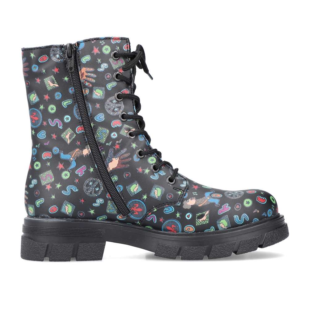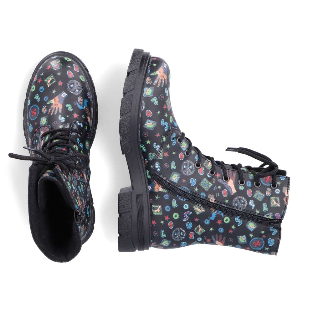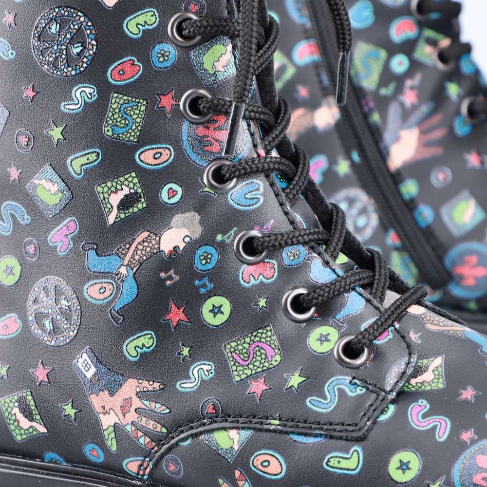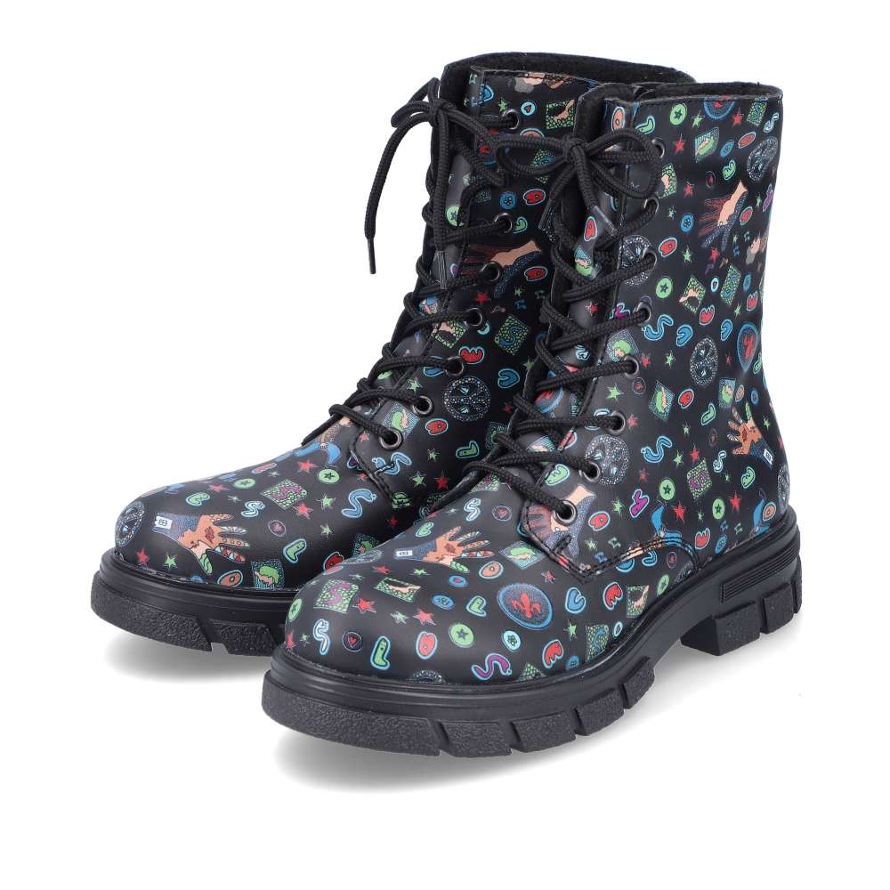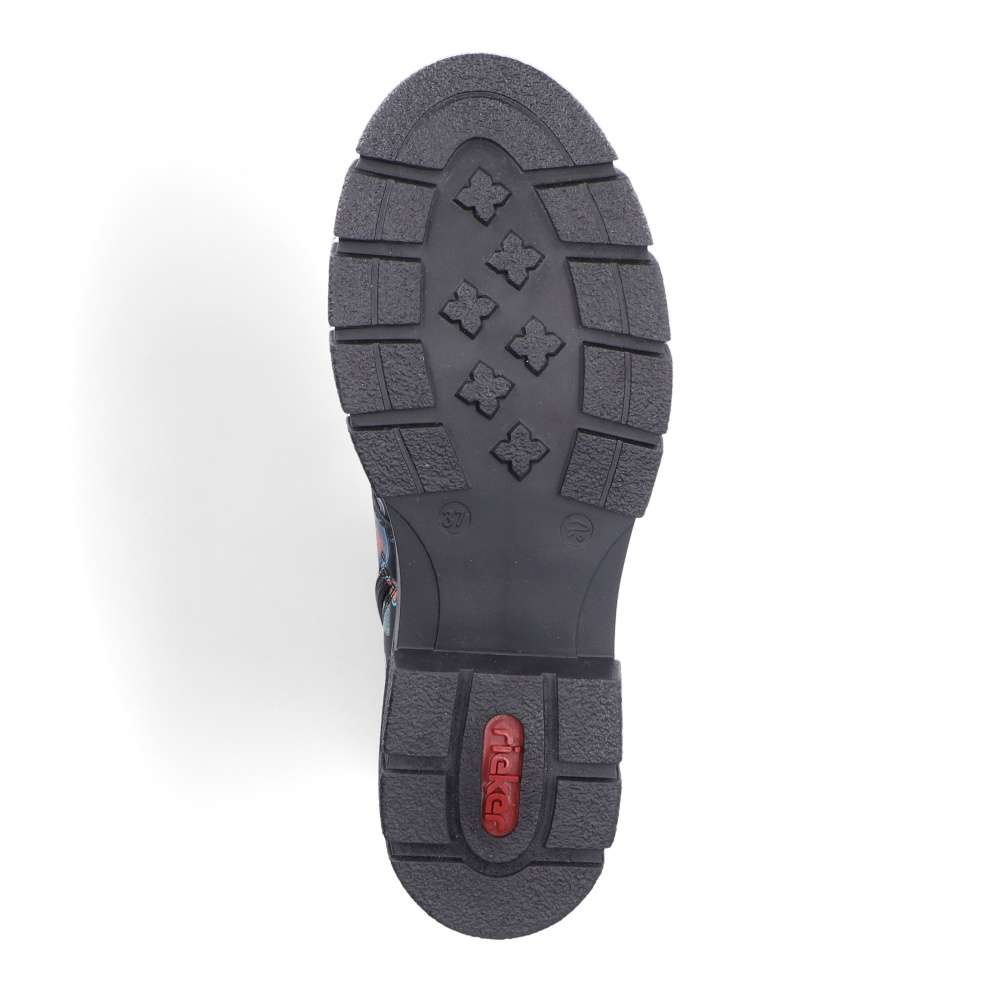 Tyto boty RIEKER jsou nepřehlédnutelné a svým svrškem s barevnými motivy oživí každý Váš den. Obutí je snadné díky bočnímu zipu a šněrováním si je upravíte přímo k Vaší noze. Podešev s hrubším vzorem zajistí stabilitu každým krokem a tlumí nárazy při chůzi. Černé nebo pro odvážné ženy i barevné oblečení dokonale doplní tento kousek od značky RIEKER.