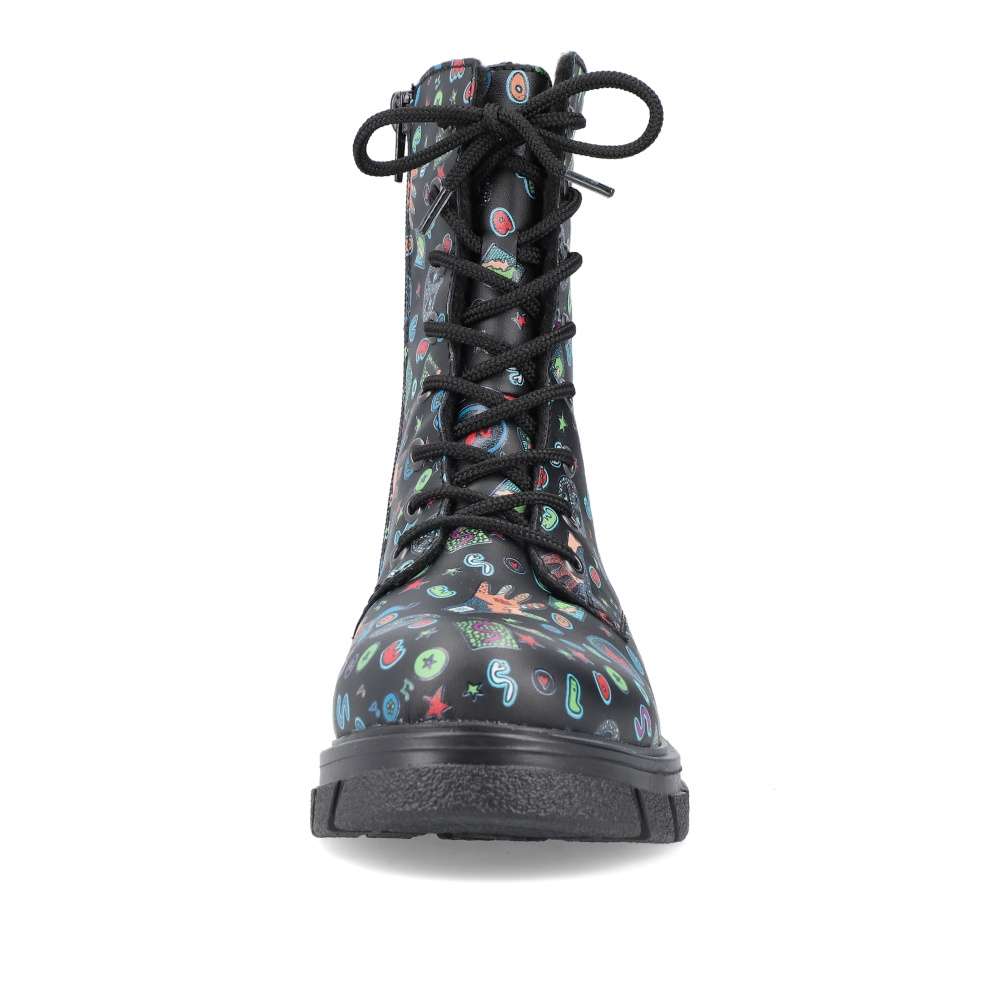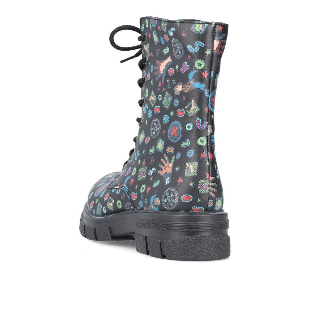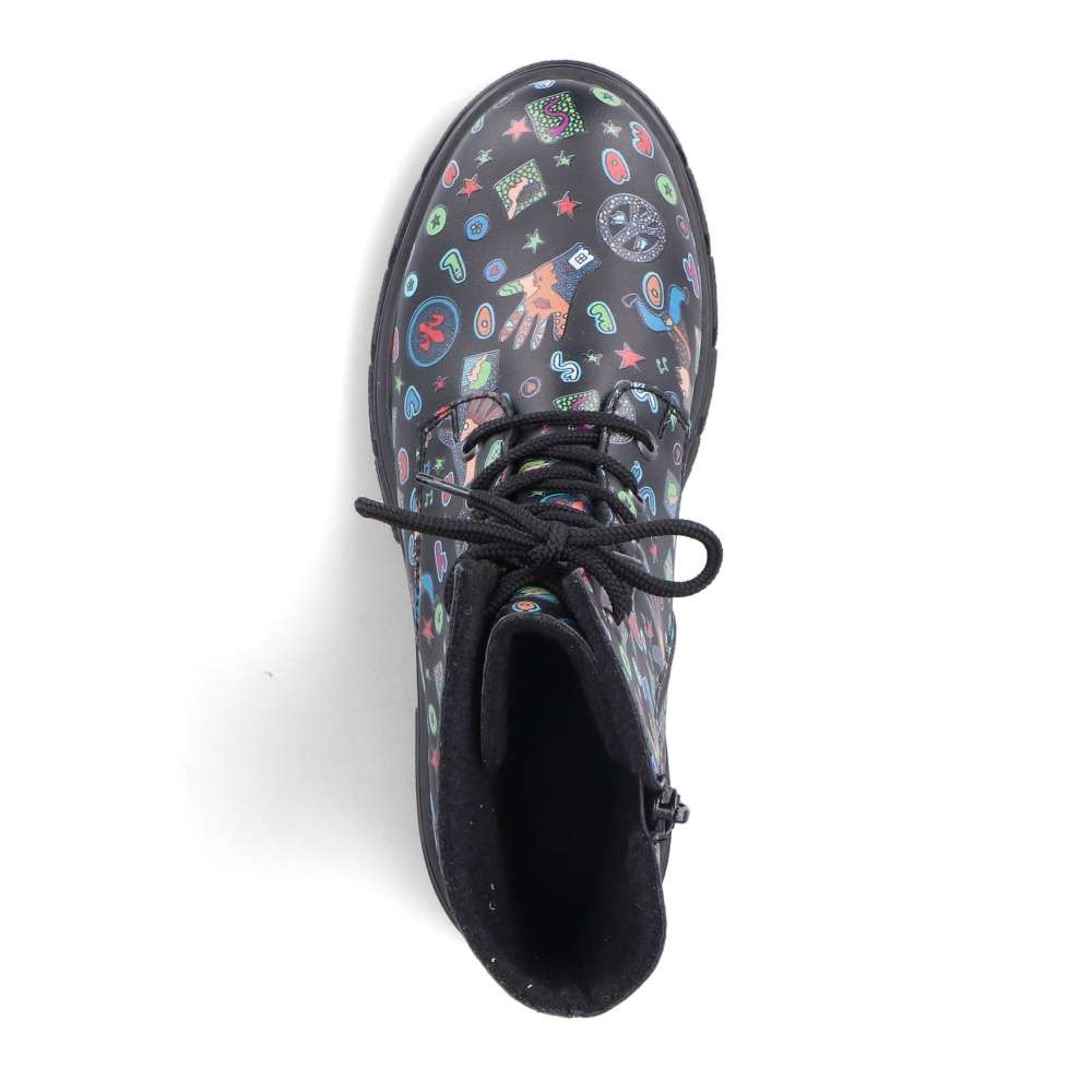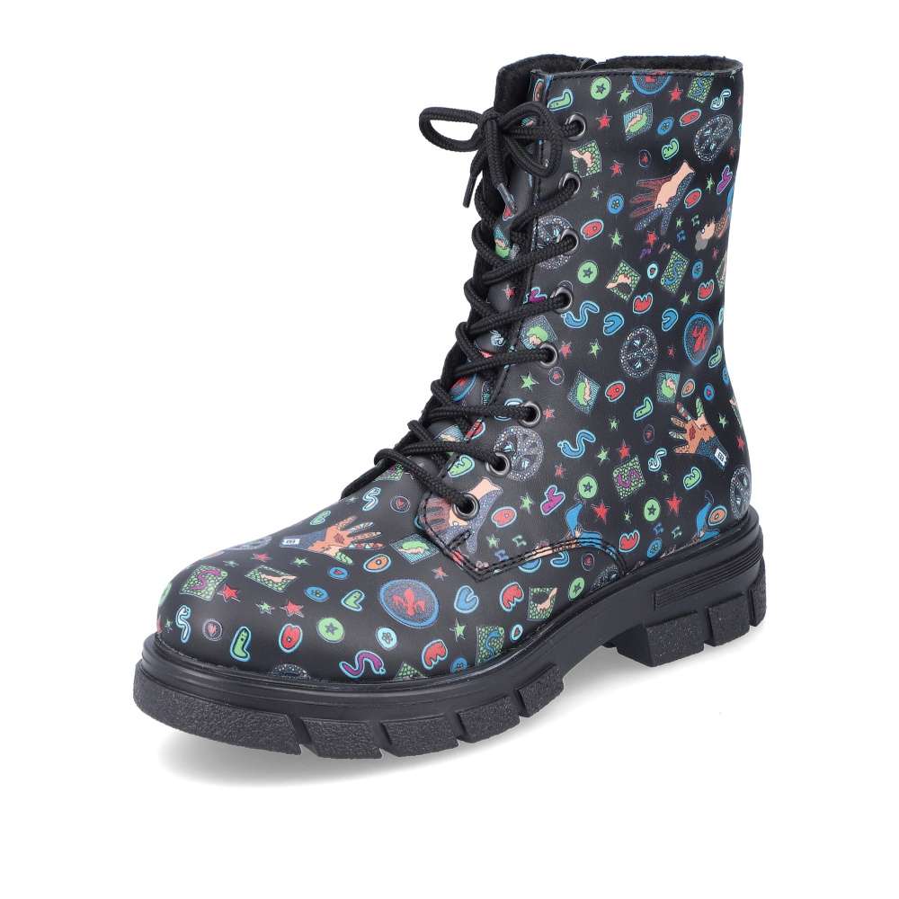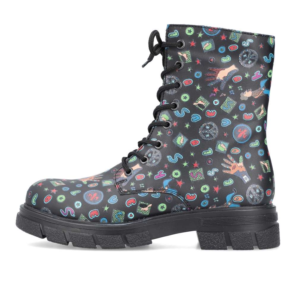 Tyto boty RIEKER jsou nepřehlédnutelné a svým svrškem s barevnými motivy oživí každý Váš den. Obutí je snadné díky bočnímu zipu a šněrováním si je upravíte přímo k Vaší noze. Podešev s hrubším vzorem zajistí stabilitu každým krokem a tlumí nárazy při chůzi. Černé nebo pro odvážné ženy i barevné oblečení dokonale doplní tento kousek od značky RIEKER.