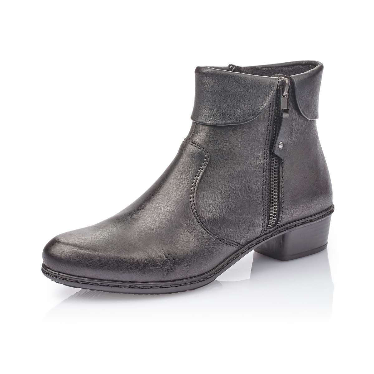 Dámská kotníková obuv černé barvy na nízkém podpatku, značky RIEKER. Podešev Podešev je vyrobena z kvalitního syntetického materiálu. Je vysoká cca 1 cm a podpatek je vysoký cca 3,5 cm. Díky technologii Antistress je podešev lehká, flexibilní. Svršek Tato dámská kotníková obuv je vyrobena z pravé hladké kůže, která krásně doplní jakýkoliv outfit. Svršek v černé barvě je zdoben na vnější straně funkčním zipem, který společně se zipem na straně vnitřní usnadní nazouvání. Stélka Hřejivá stélka a příjemná podšívka z materiálu Velur Vám dodají potřebný pocit pohodlí po celý den.