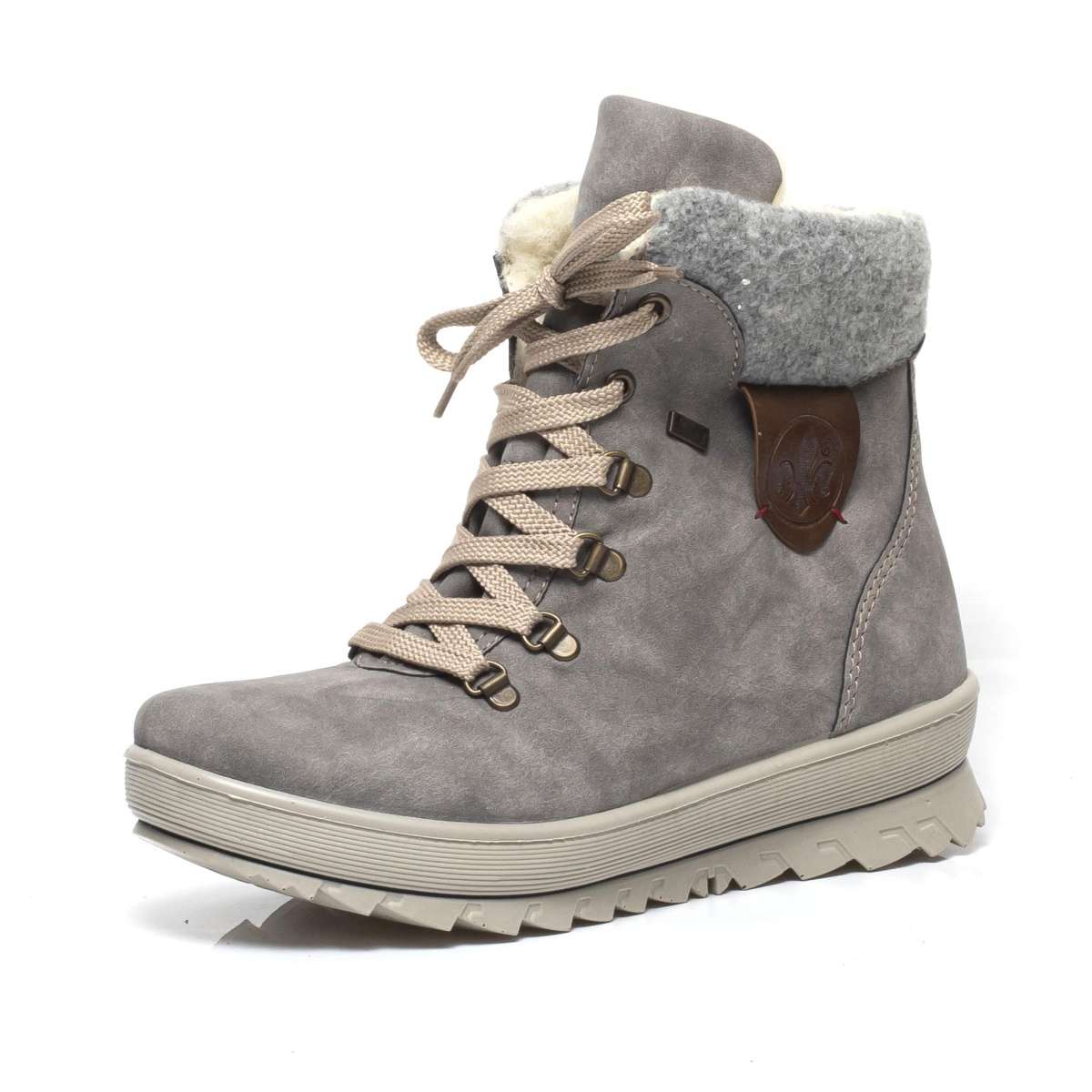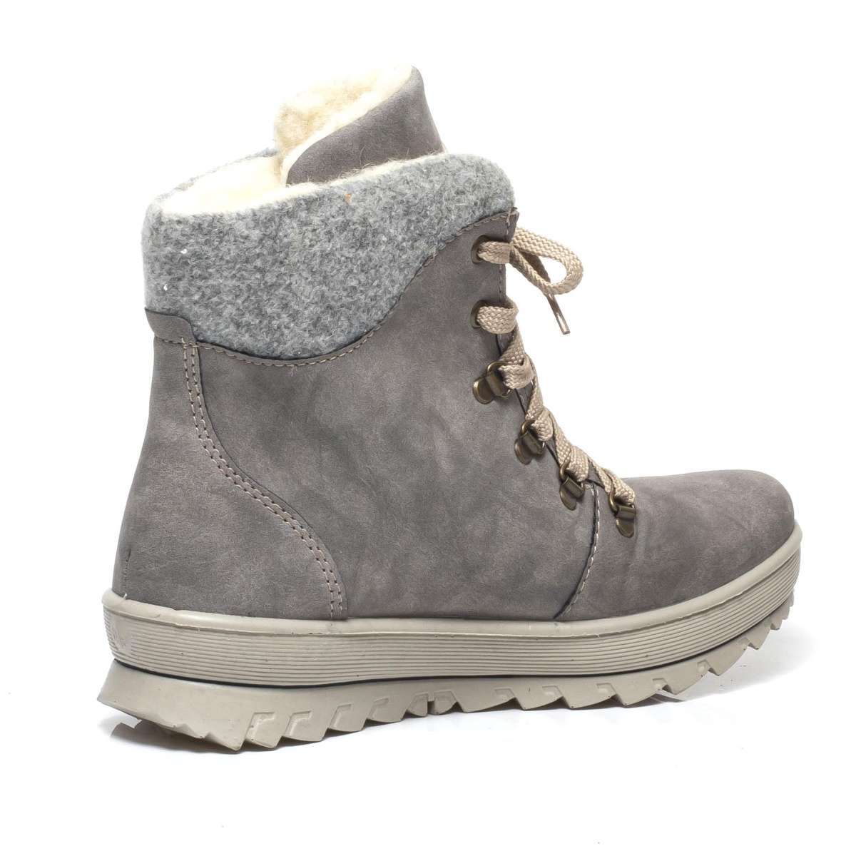 Dámská kotníková obuv semišového vzhledu v šedé barvě je zdobená filcem kolem horního okraje. Má kulatou špičku, RiekerTex což je funkční vrstva a šněrování, kterým si upravíte obuv přímo k vlastní noze. Tento model je vhodný na procházky zimní krajinou i na cestu do práce.