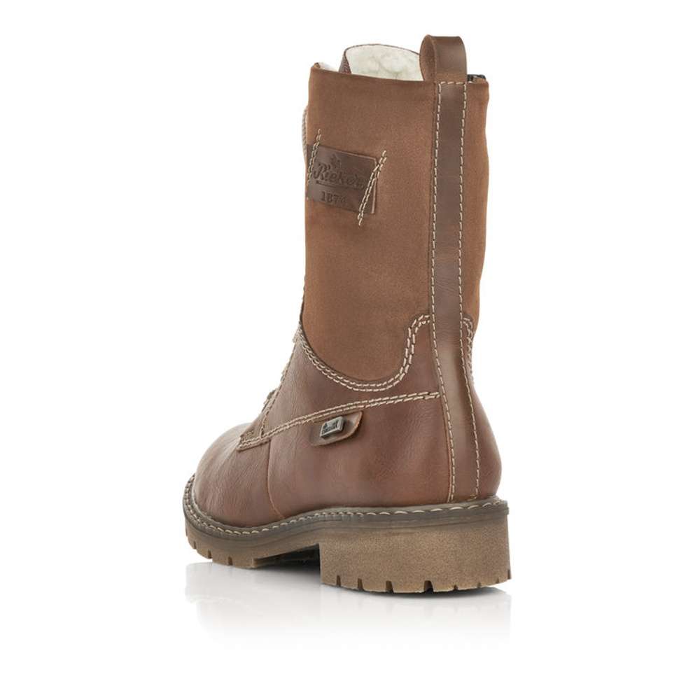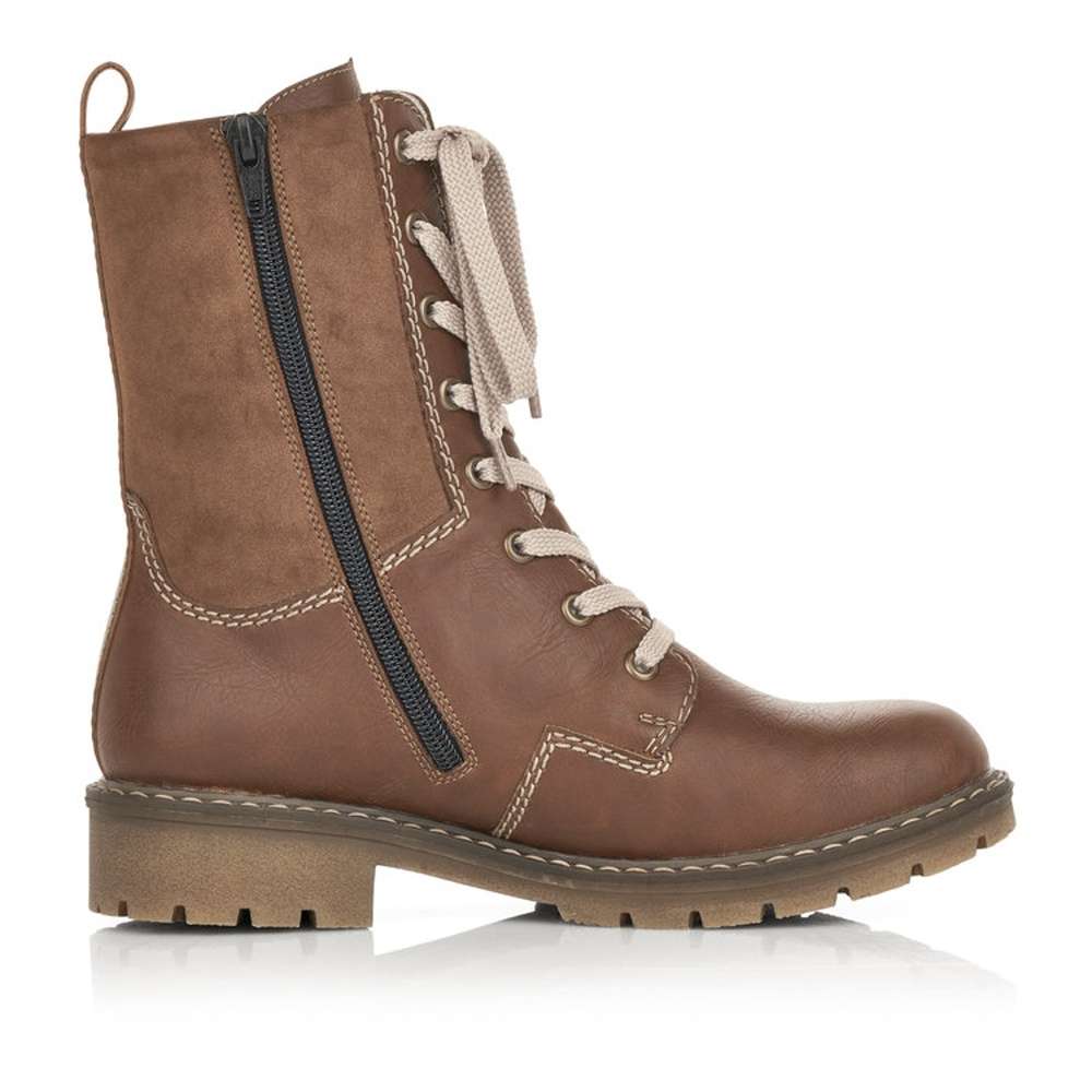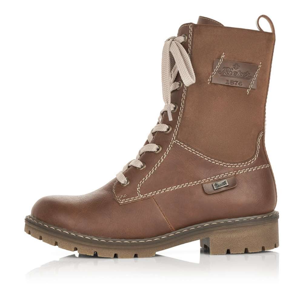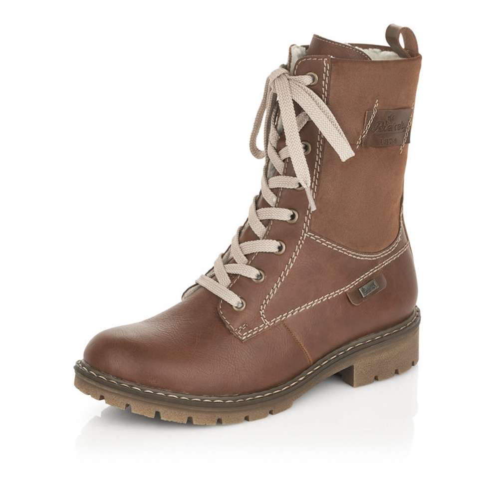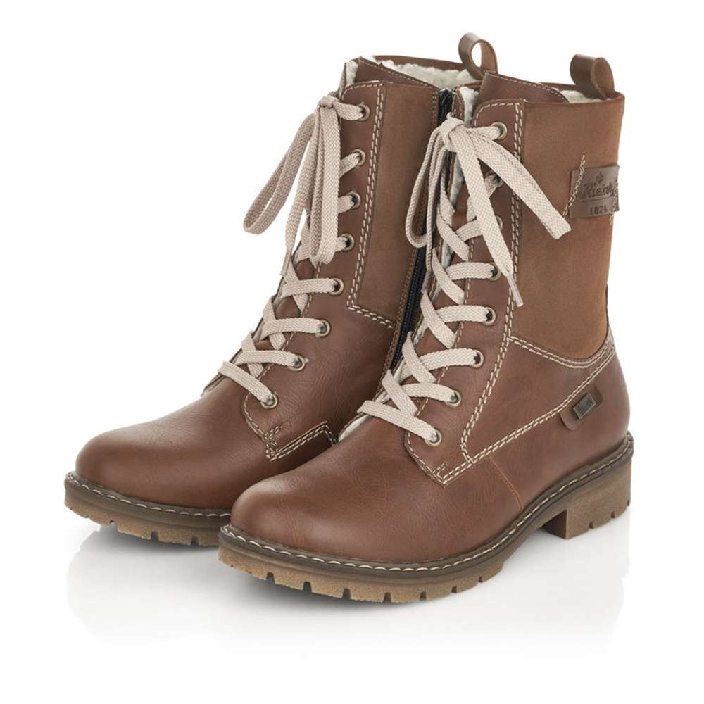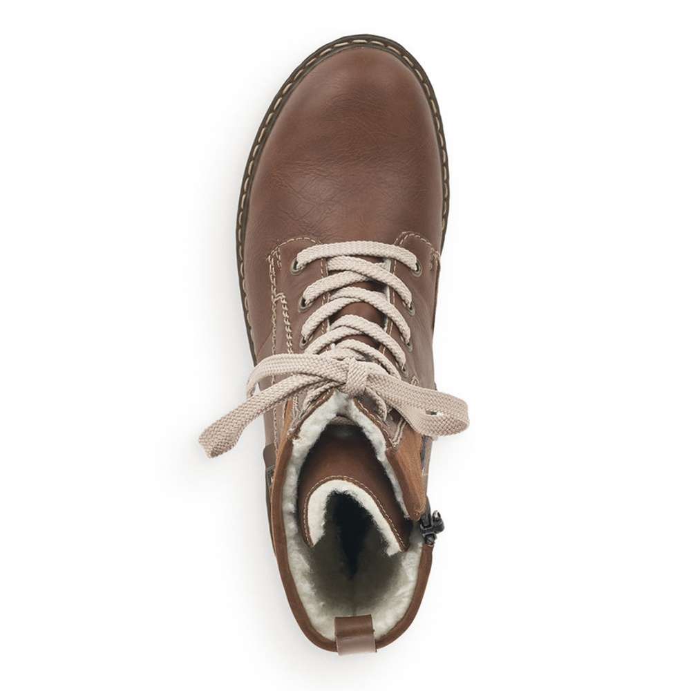 Jedinečná dámská kotníková obuv s kombinací svrchního materiálu v hnědých tónech a našitým logem značky Rieker. Boty jsou šněrovací a na vnitřní straně mají funkční zip, který Vám skvěle usnadní nazutí. Podšívka z teplé kožešiny krásně zahřeje a podešev s hrubším vzorkem zajistí bezpečnou chůzi. Tyto kotníkové boty udělají radost nejen Vám ale i Vašim blízkým. Technologie: Antistress – podešev je díky této technologii lehká, flexibilní, absorbuje nárazy při došlapu a snadno se přizpůsobí každé noze. Rieker TEX – funkční vrstva, díky které je bota nepromokavá a přesto prodyšná.