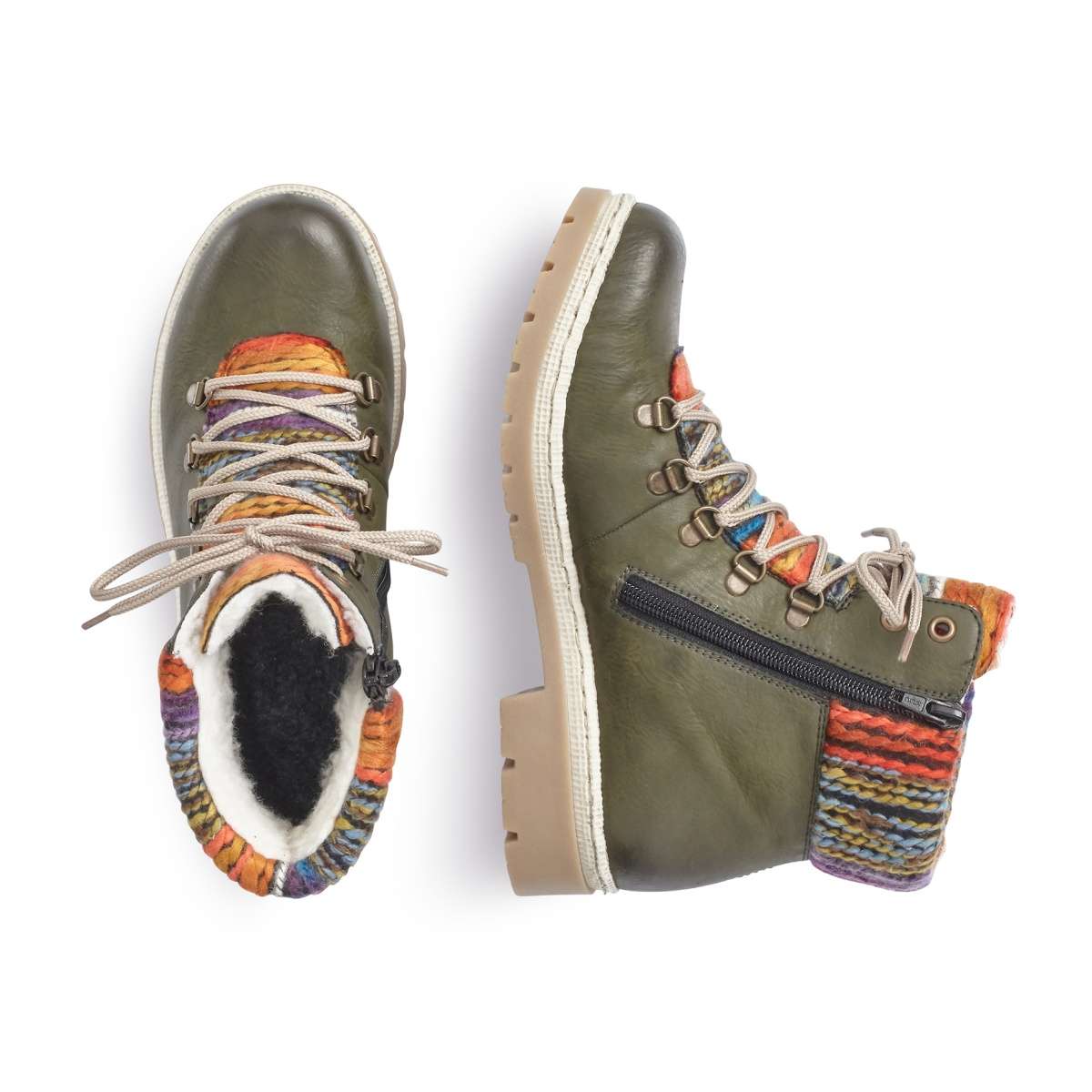 Dámská kotníková obuv zelené barvy s barevnými textilními detaily, značky RIEKER.