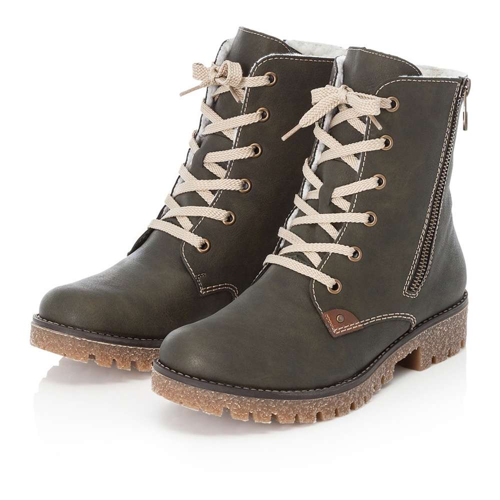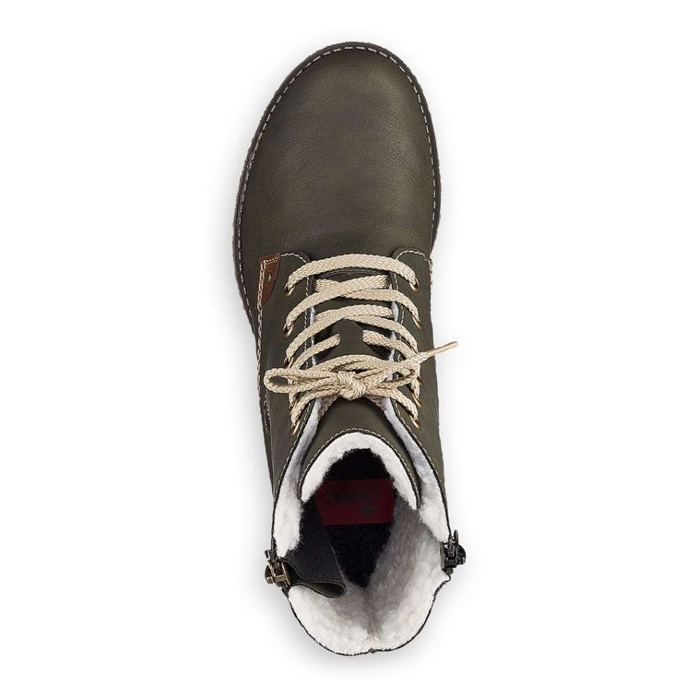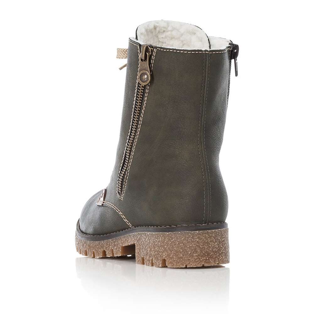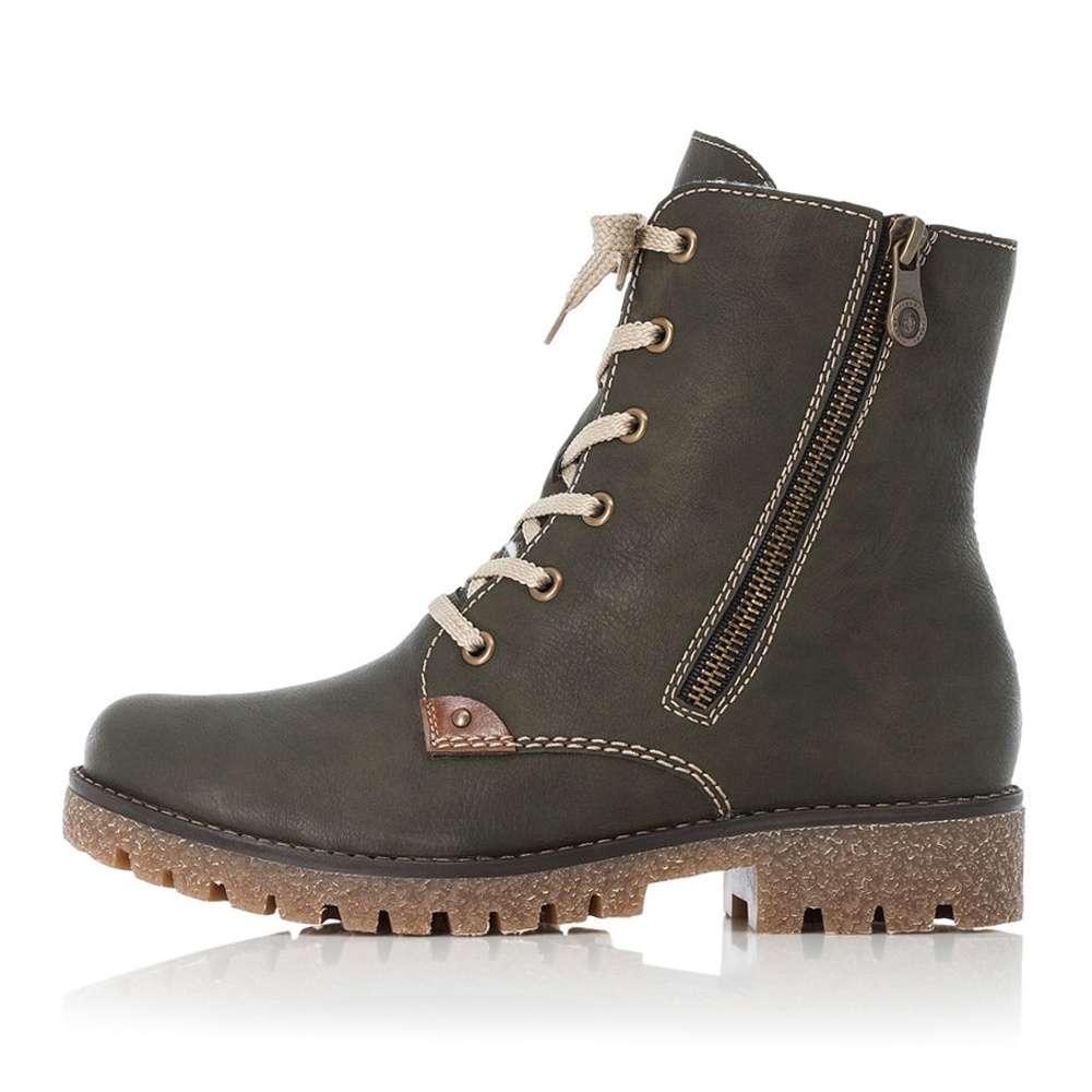 Dámská kotníková obuv v zelené barvě se zateplením, značky RIEKER. Svršek Obuv je zdobená zipem na vnější straně, kontrastním prošíváním a šněrováním. Má hladký povrch, kulatou špičku, funkční zip na vnitřní straně a šněrování, kterým si obuv upravíte přímo k vlastní noze. Tento model je vhodný na procházky přírodou i na cestu do práce. Stélka a podšívka Stélka i podšívka jsou vyrobeny z kvalitní hřejivé textilie, která je imitací pravé ovčí vlny. Podešev Podešev je vyrobena technologií Antistress díky níž je lehká, flexibilní, absorbuje nárazy při došlapu a snadno se přizpůsobí každé noze. Technologie: Antistress