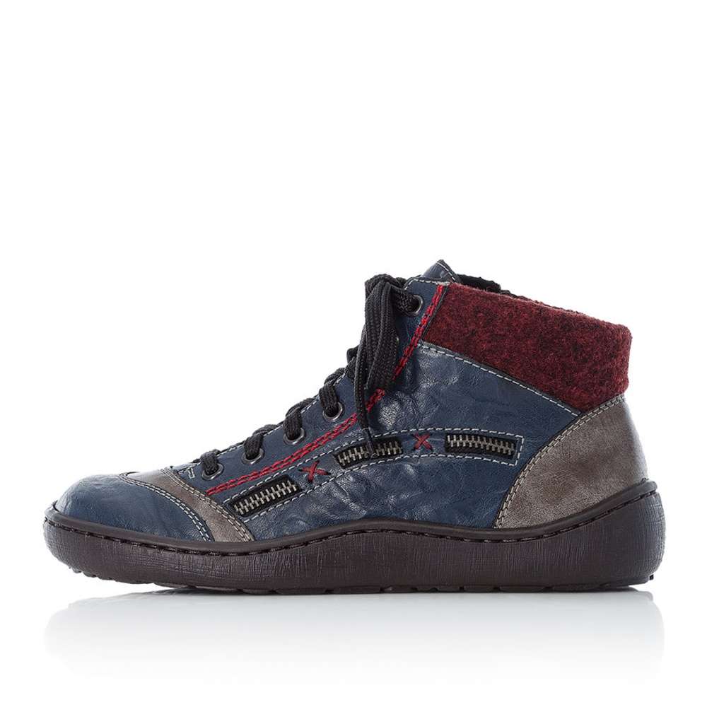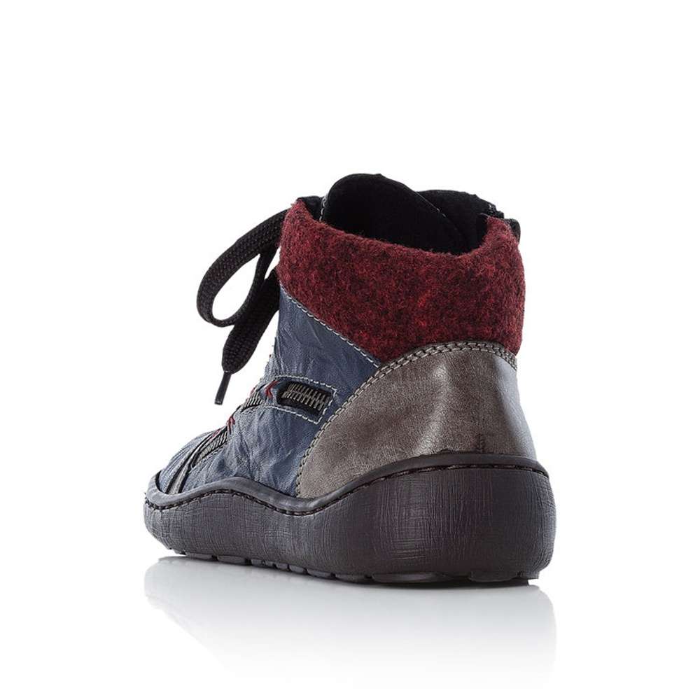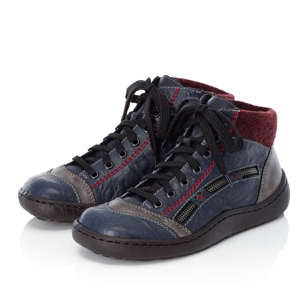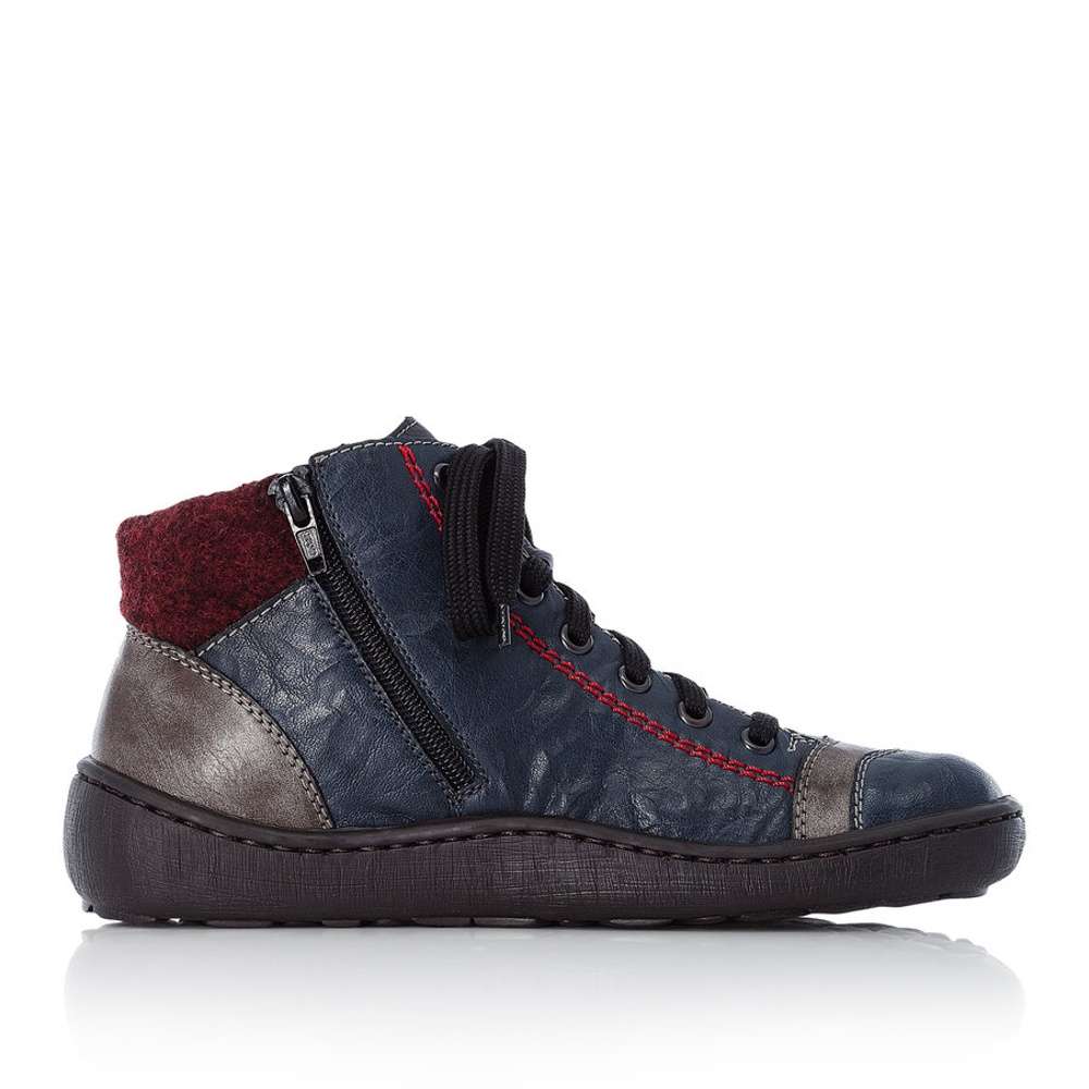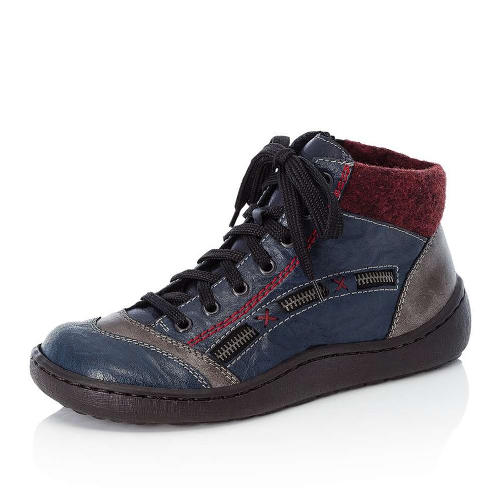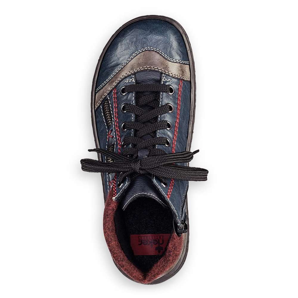 Dámská sportovní obuv RIEKER je vyrobena z pravé kůže modré barvy s výrazným červeným prošitím u tkaniček a textilním lemem. Tkaničky na šněrování slouží pro lepší přizpůsobení přímo na Vaši nohu. Boty vynosíte jak do města, tak i na procházku přírodou.