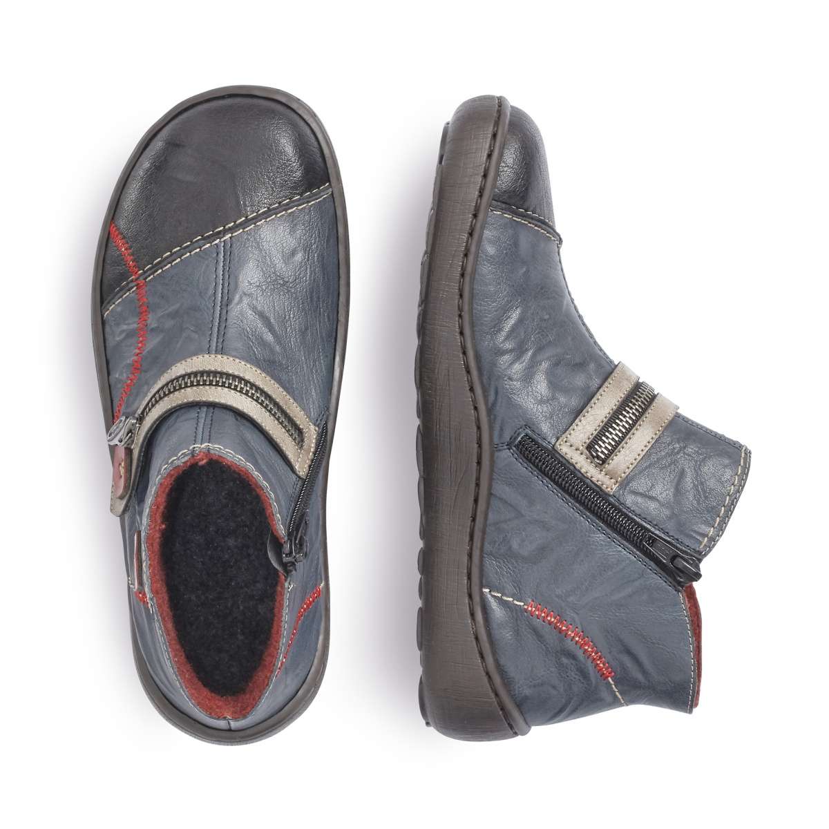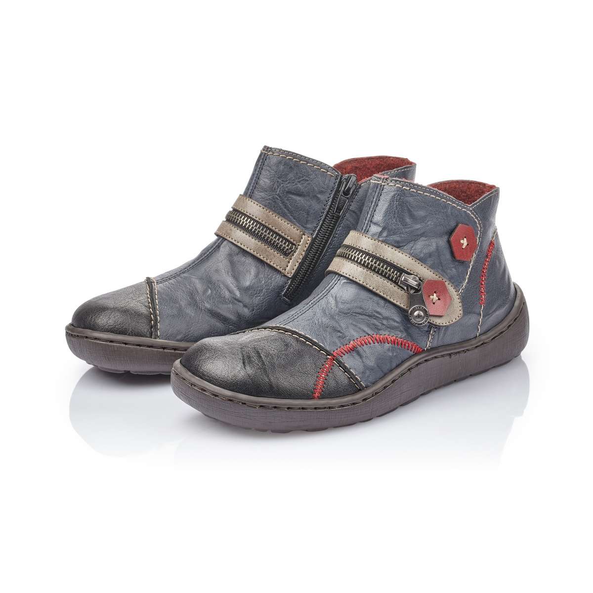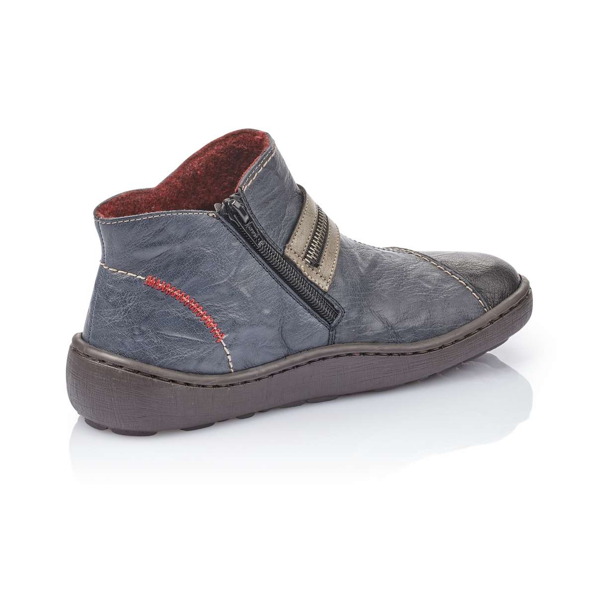 Dámská obuv RIEKER je vyrobena z pravé kůže modré barvy s výrazným červeným prošitím a zdobným zipem v oblasti nártu. Obouvání Vám usnadní funkční praktický zip na vnitřní straně. Skvěle budou vypadat k úzkým kalhotám a zimnímu kabátku.