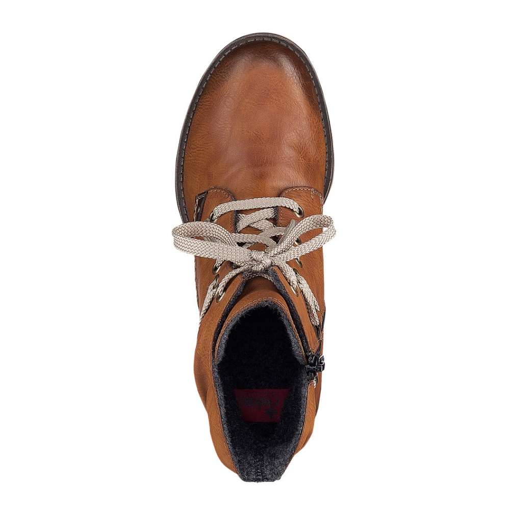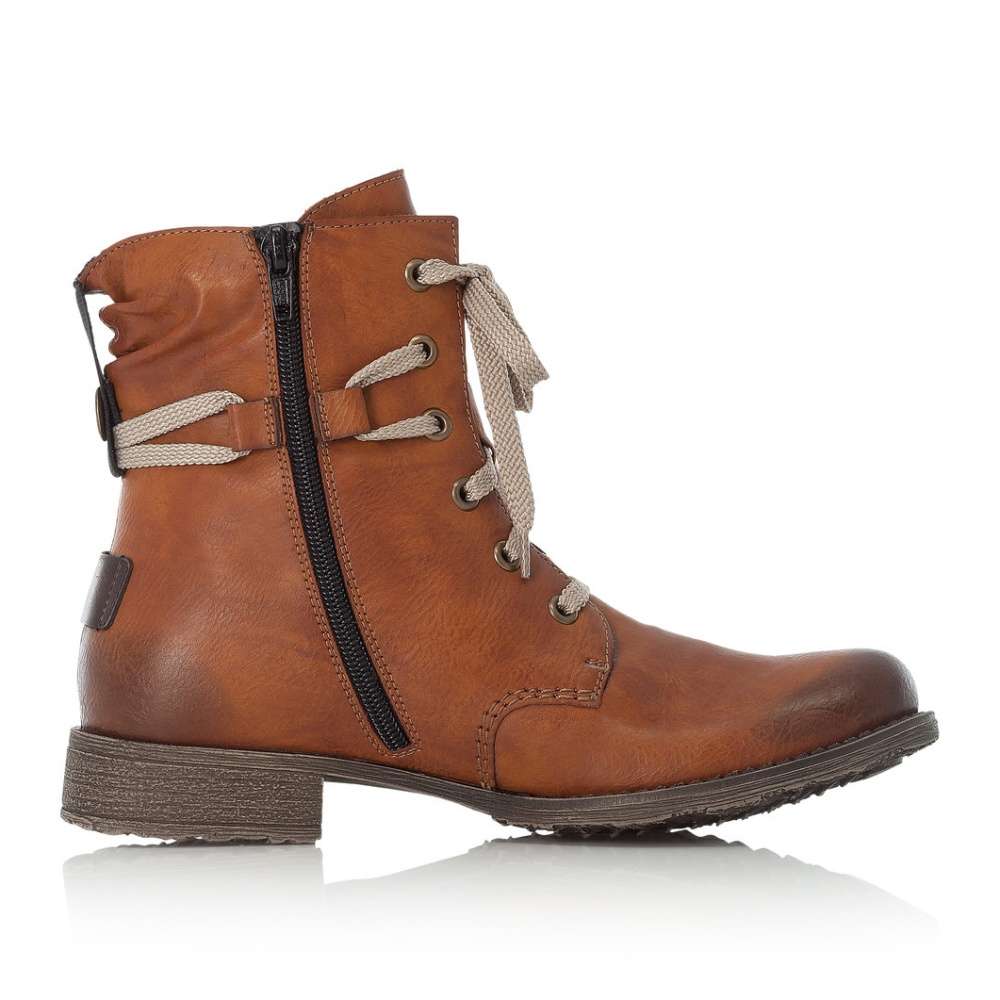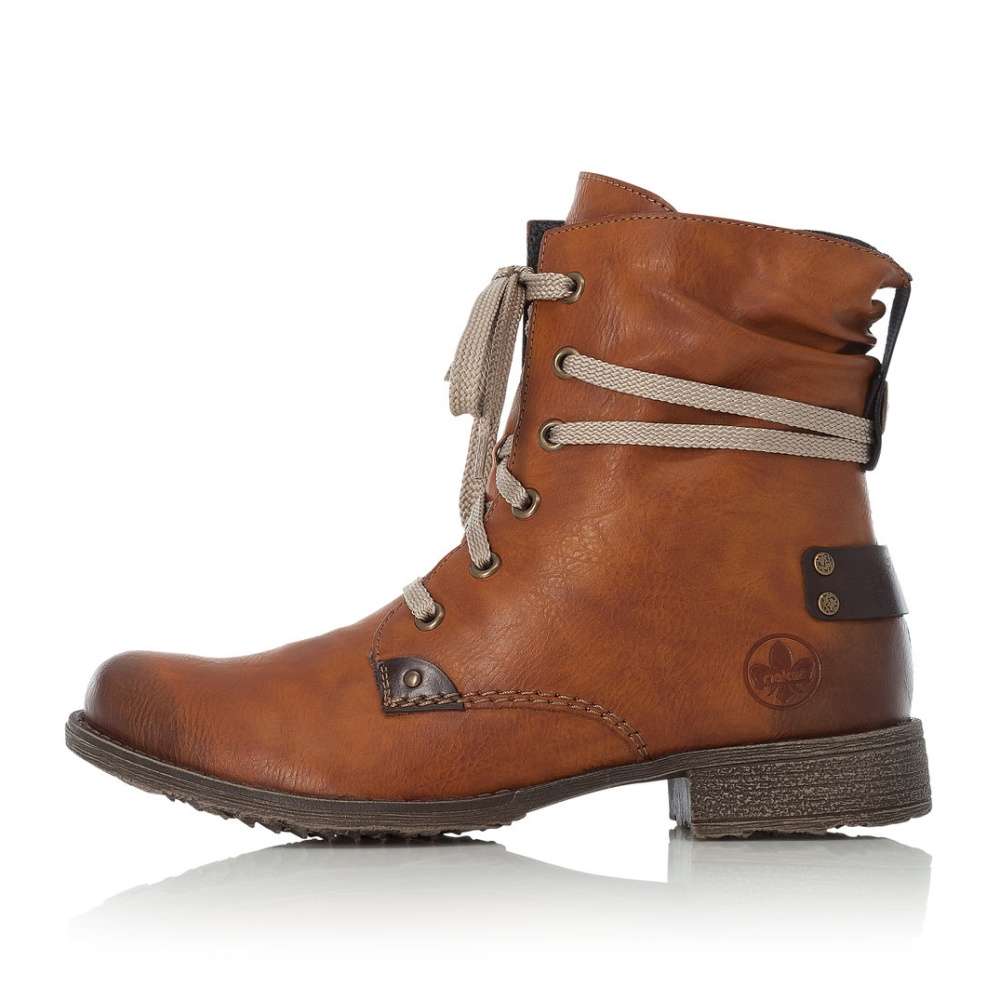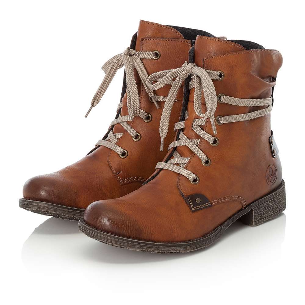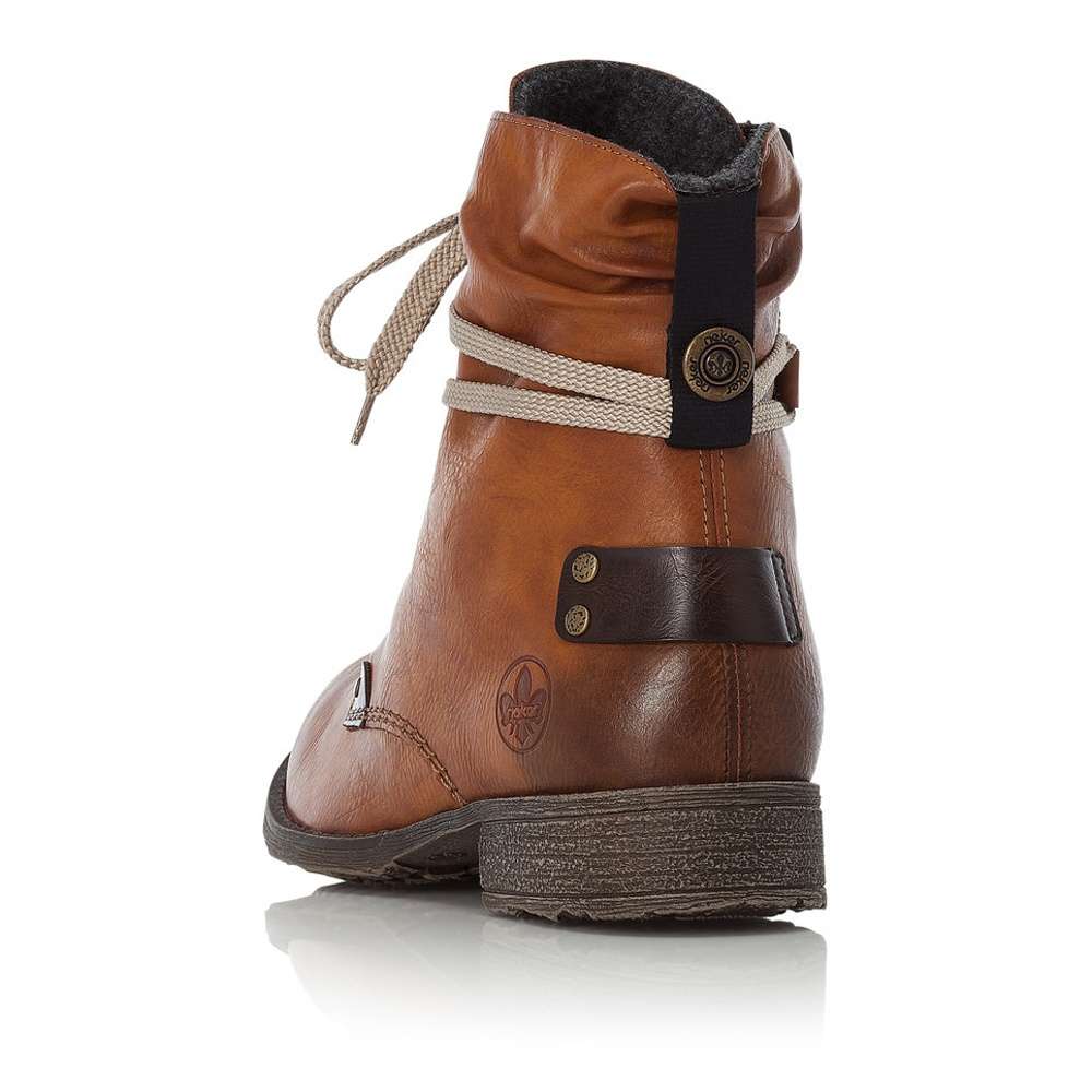 Hladký hnědý svršek bot je prošíván béžovou nití a ozdoben tmavě hnědými nášivkami. Na nártu najdeme šněrování se světlými tkaničkami, kterým si obuv snadno přizpůsobíte a na vnitřní straně funkční zip, který usnadní nazouvání.
