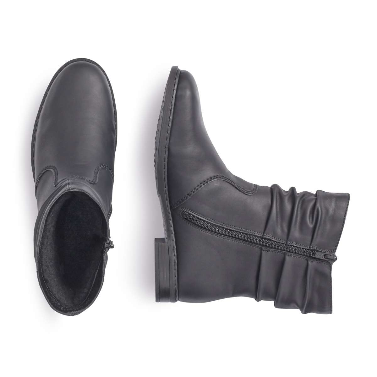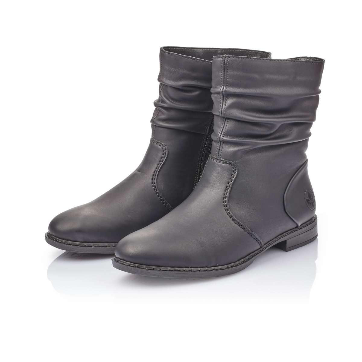 Dámské kotníky s filcovou podšívkou v černé barvě, značky RIEKER. Mají hladký povrch, který je kolem lýtka mírně nakasán, ten obuvi dodává jemný a zároveň zajímavá vzhled. Z vnitřní strany se nachází funkční zip pro snadnější nazutí. Tento model krásně zdůrazní každý Váš krok a je vhodný jak k sukni, tak ke kalhotám.