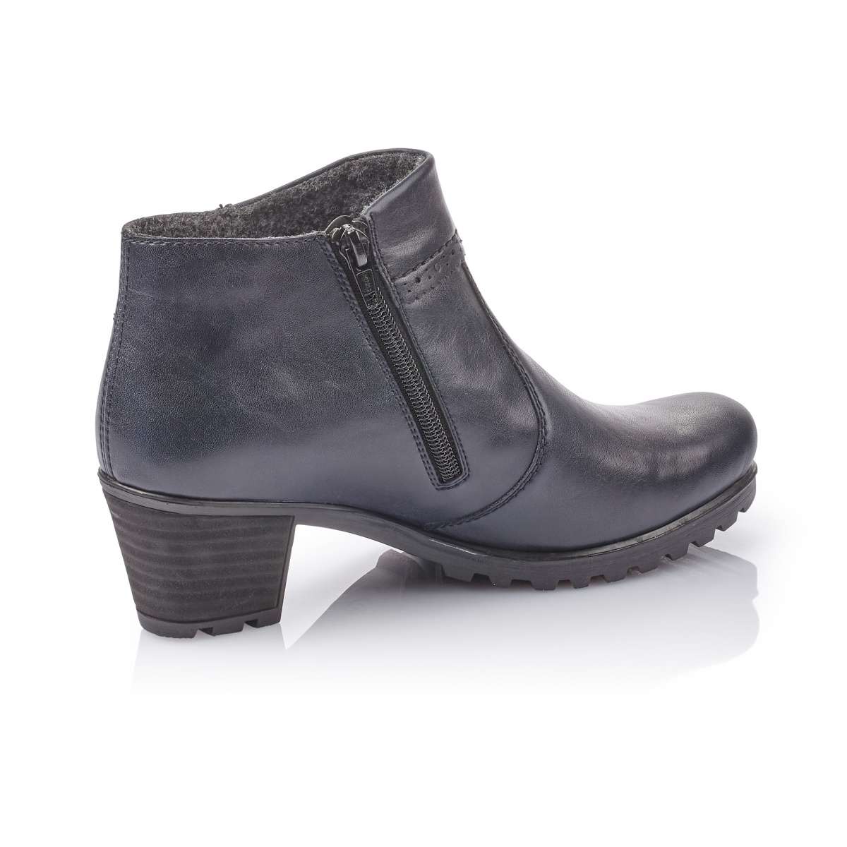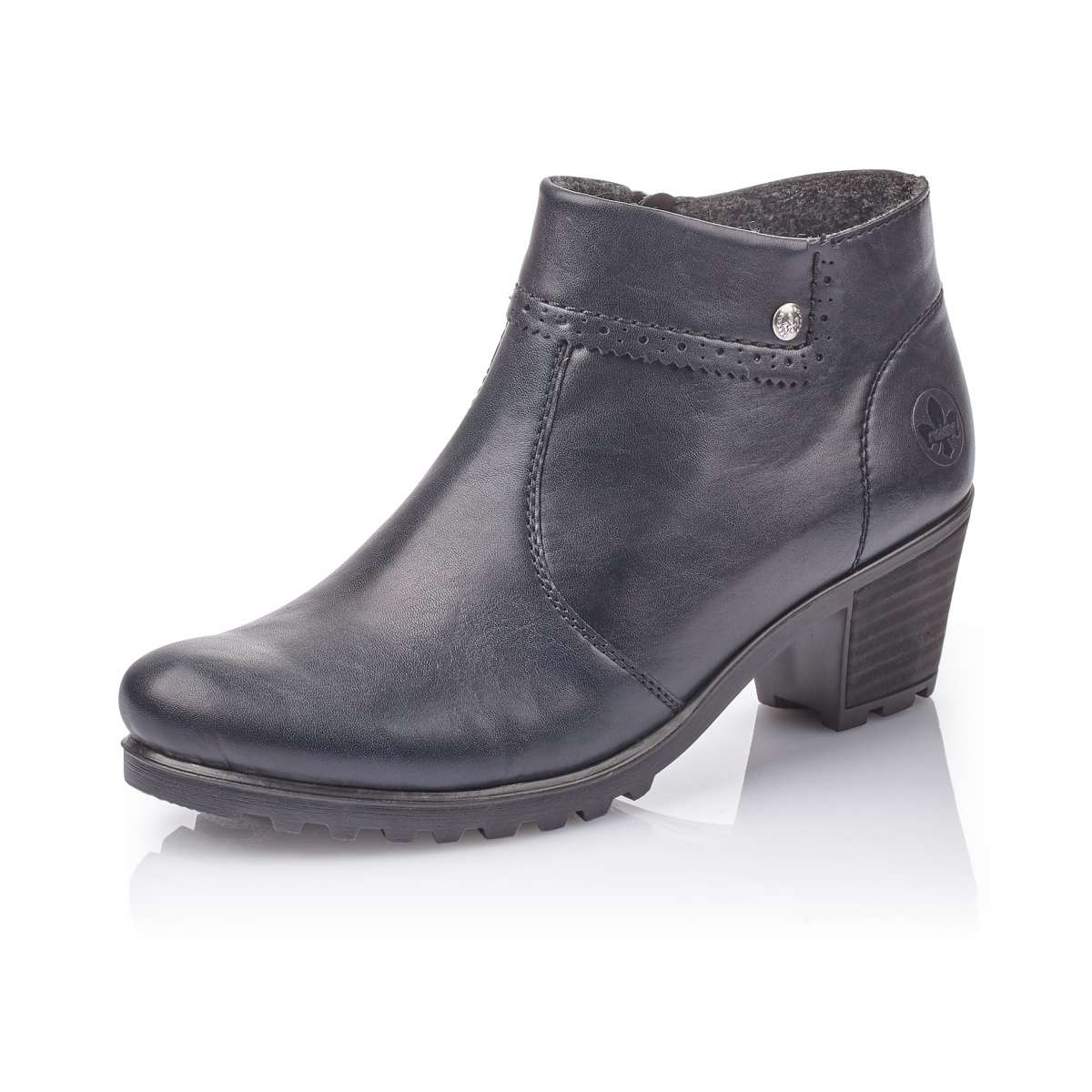 Elegantní kotníkové boty značky Rieker hladkého povrchu mají jednoduché prošití a krásné zdobení jemnou povrchovou perforací, která neprochází skrz celou tloušťku materiálu v nejvyšší části nártu. Obouvání Vám usnadní funkční zip z vnitřní strany. V chladných zimních dnech jistě oceníte zateplení Velur, které se vyznačuje různými druhy textilií s krátkým vlasem. Tento pohodlný vzor unosíte například do práce a sladíte skvěle k jakémukoliv outfitu.