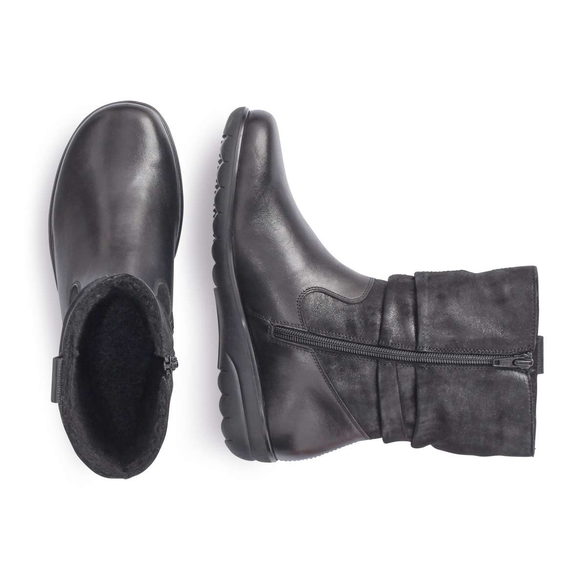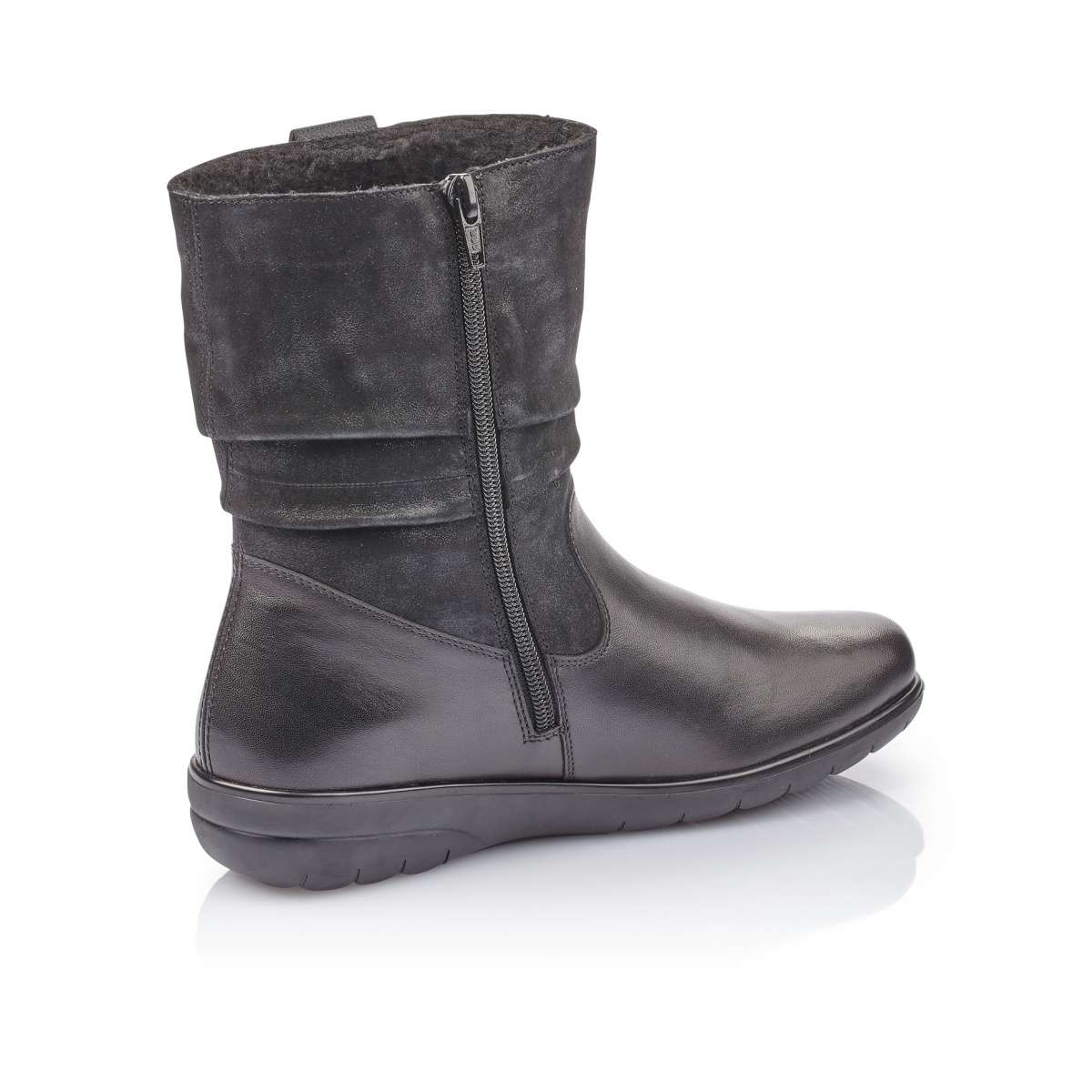 Dámské vyšší kotníky šité z pravé kůže s celkovou výškou boty cca 22 cm jsou vhodné pro každý dámský šatník a zároveň se hodí pro každou příležitost. Vzorek na podešvi je středně hrubý, proto Vám zaručí pohodlnou a bezpečnou chůzi i při nepříznivém počasí. Pro snadné obutí je zapracován funkční zip z vnitřní strany. Boty jsou zdobené elegantním šitím a unikátní kombinací hladkého a semišového vzhledu.