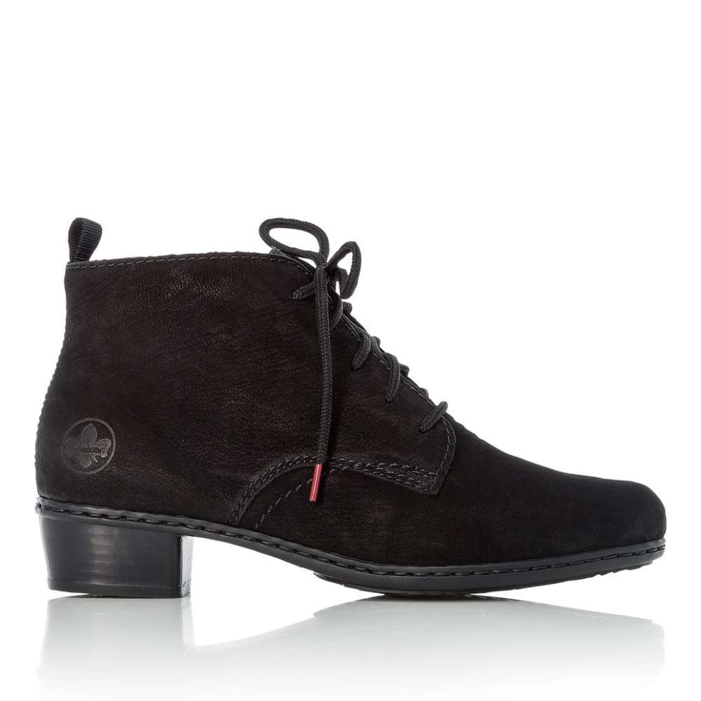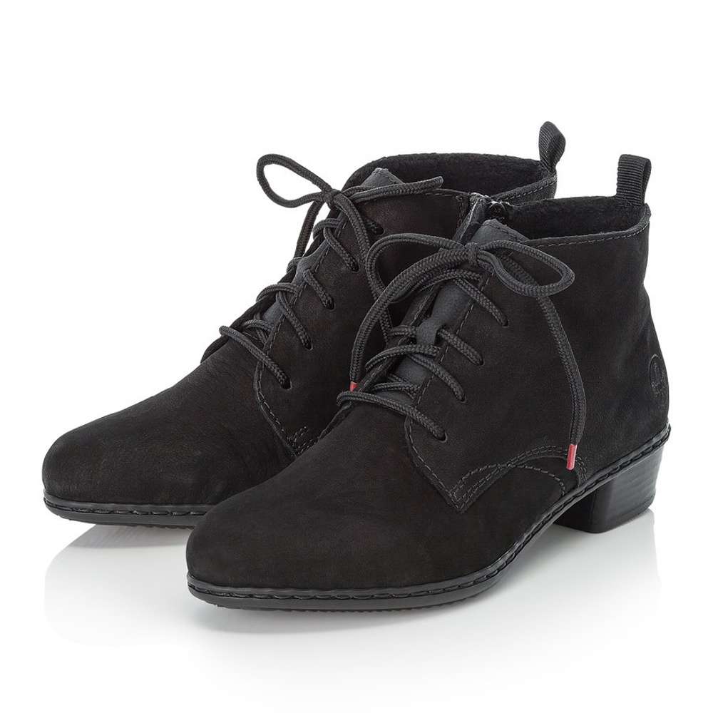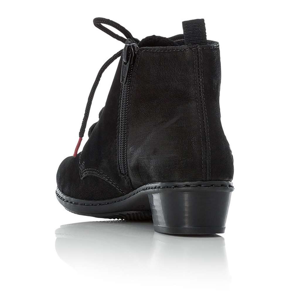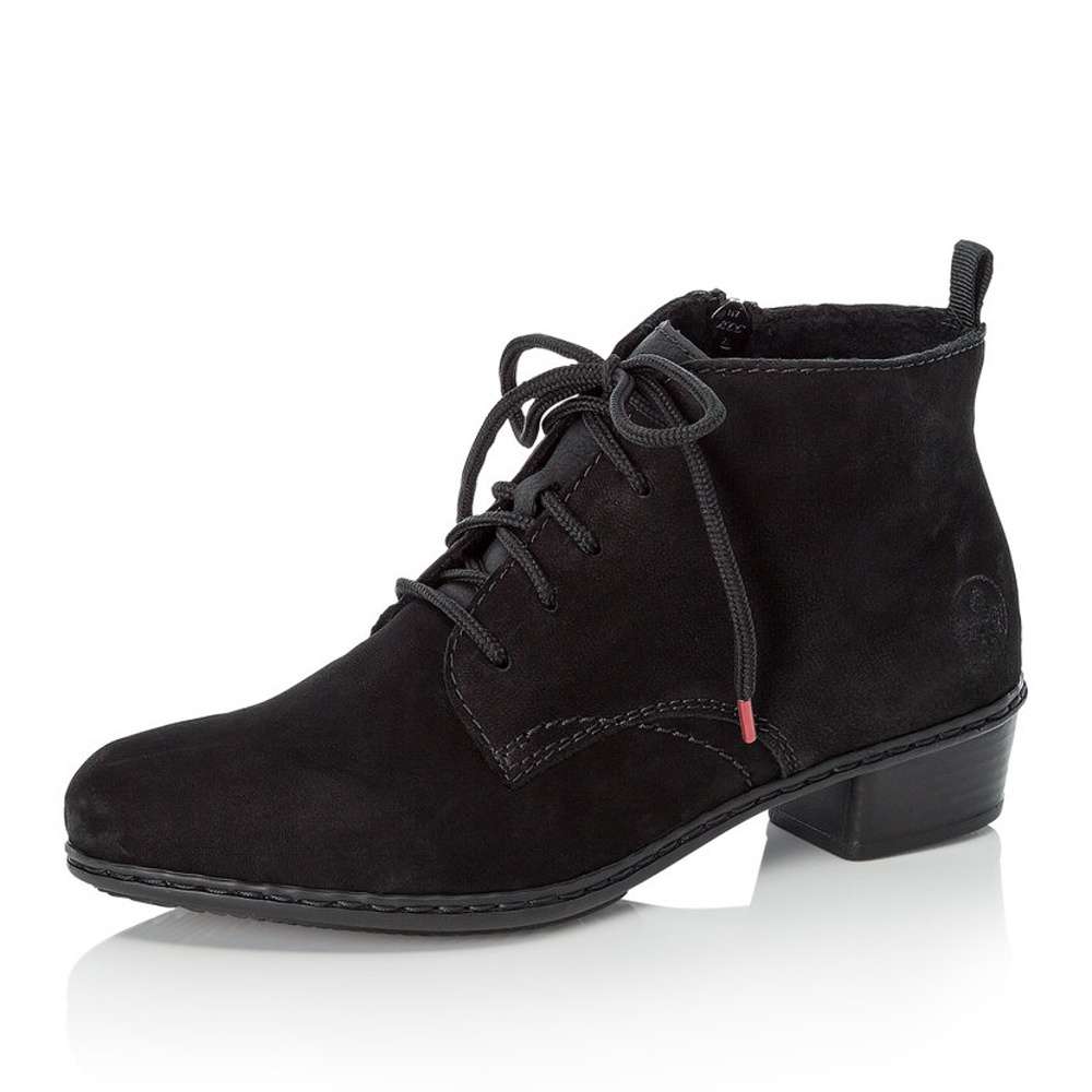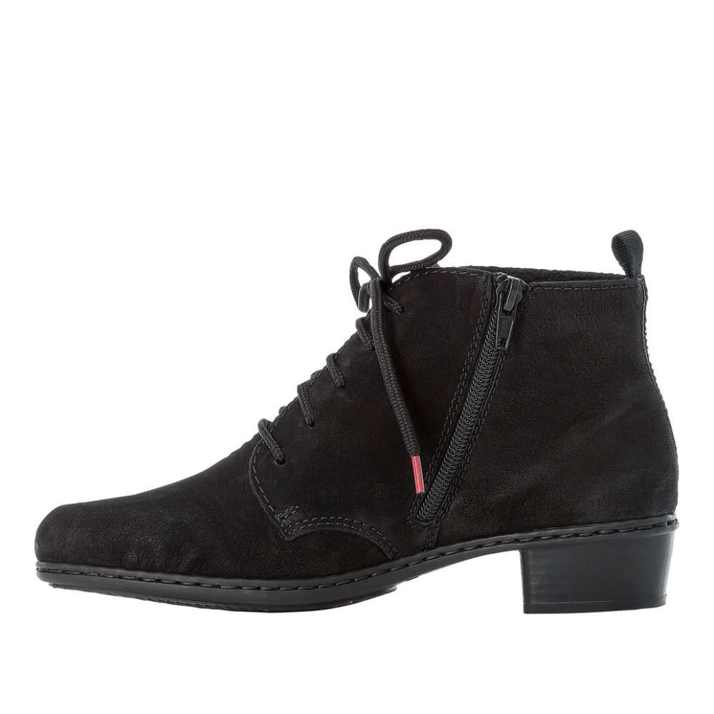 Dámské kotníky z pravé kůže černé barvy jsou vhodné pro každý dámský šatník a zároveň se hodí pro každou příležitost. Pro snadné obutí je zapracován funkční zip z vnitřní strany a šněrování, kterým si pak obuv upravíte přímo k Vaší noze. Boty jsou zdobené elegantním šitím a logem značky Rieker na vnější straně paty. Teplou velurovou podšívku oceníte i při nepříznivém počasí.