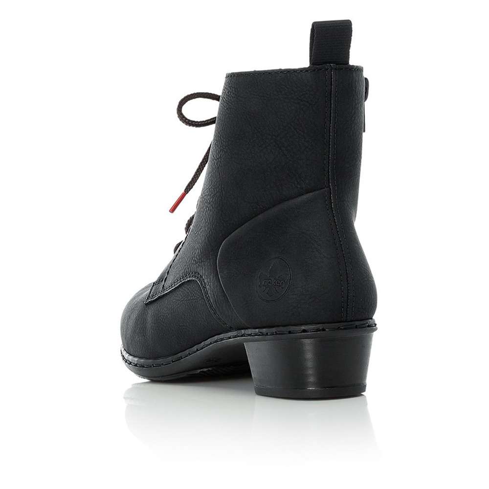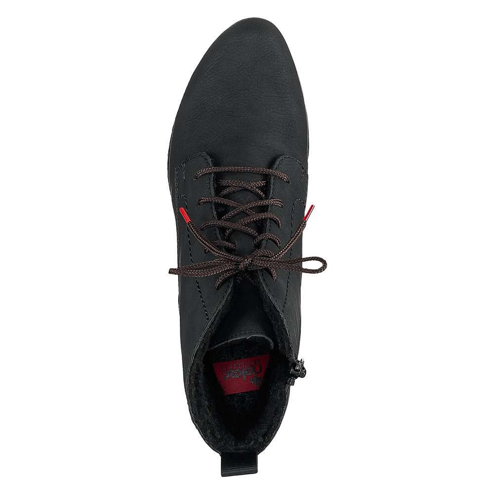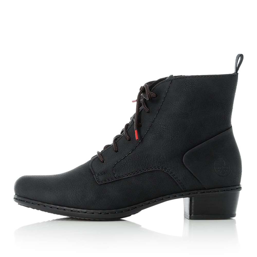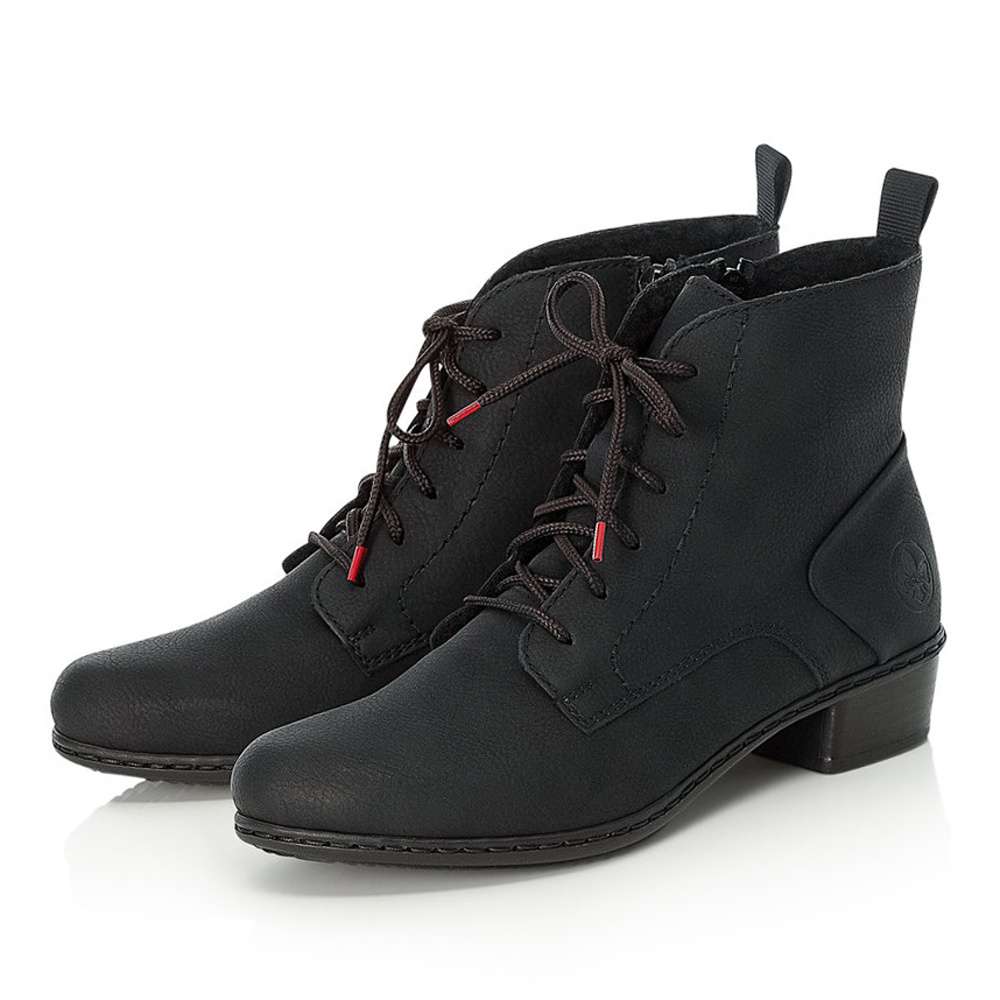 Úžasně elegantní kotník černé barvy je zde pro všechny dámy a slečny, které chtějí vypadat nádherně. Jednoduché zdobení šitím černou nití, logem značky Rieker a červenými konci tkaniček. Šněrováním si upravíte obuv přímo k vlastní noze. Teplou podšívku pak oceníte v chladném počasí při procházkách městem i při cestě do práce.