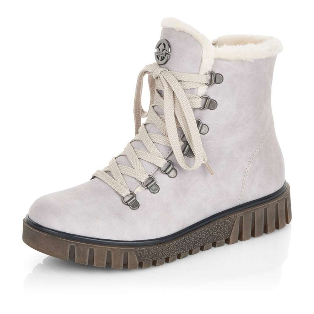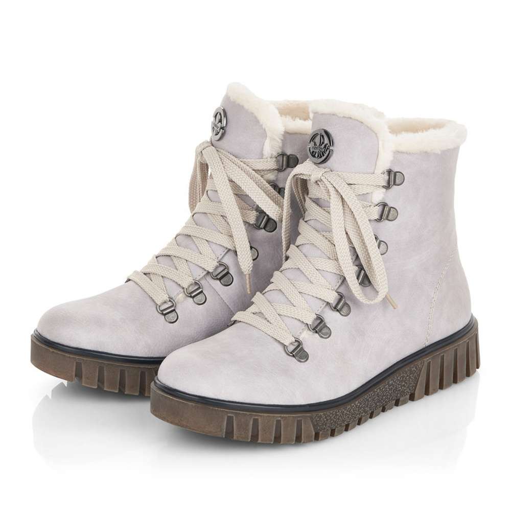Tato jednoduchá kotníková obuv Vás na první pohled zaujme svou světlou barvou, která je ozdobena prošíváním, kovovým logem Rieker, vyšší kontrastní podešví či kožíškovým lemem v horní části obuvi. Pro snadné nazouvání slouží šněrování v oblasti nártu. Obuv skvěle doplní Vaše zimní outfity.