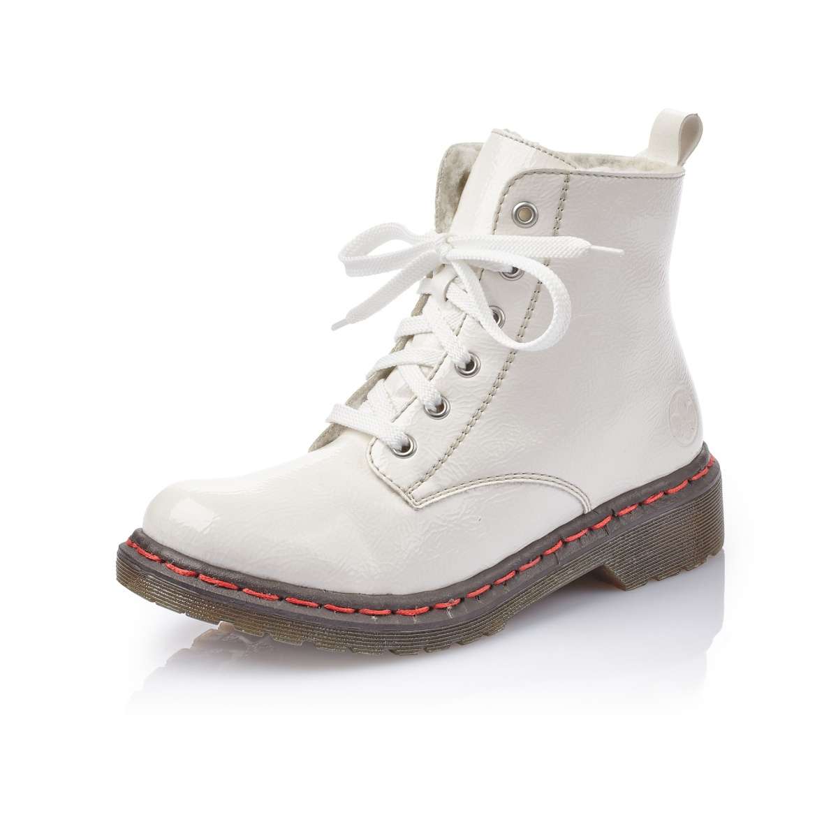 Dámská kotníková obuv RIEKER v lesklé bílé barvě je jedinečná díky sytě červenému prošití v části podešve. Tkaničky na šněrování slouží pro lepší přizpůsobení přímo na Vaši nohu. Tento stylový model Vám zajistí celodenní komfort.