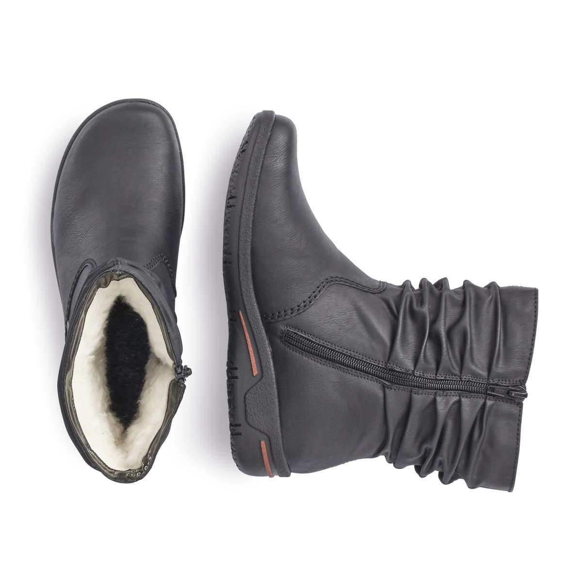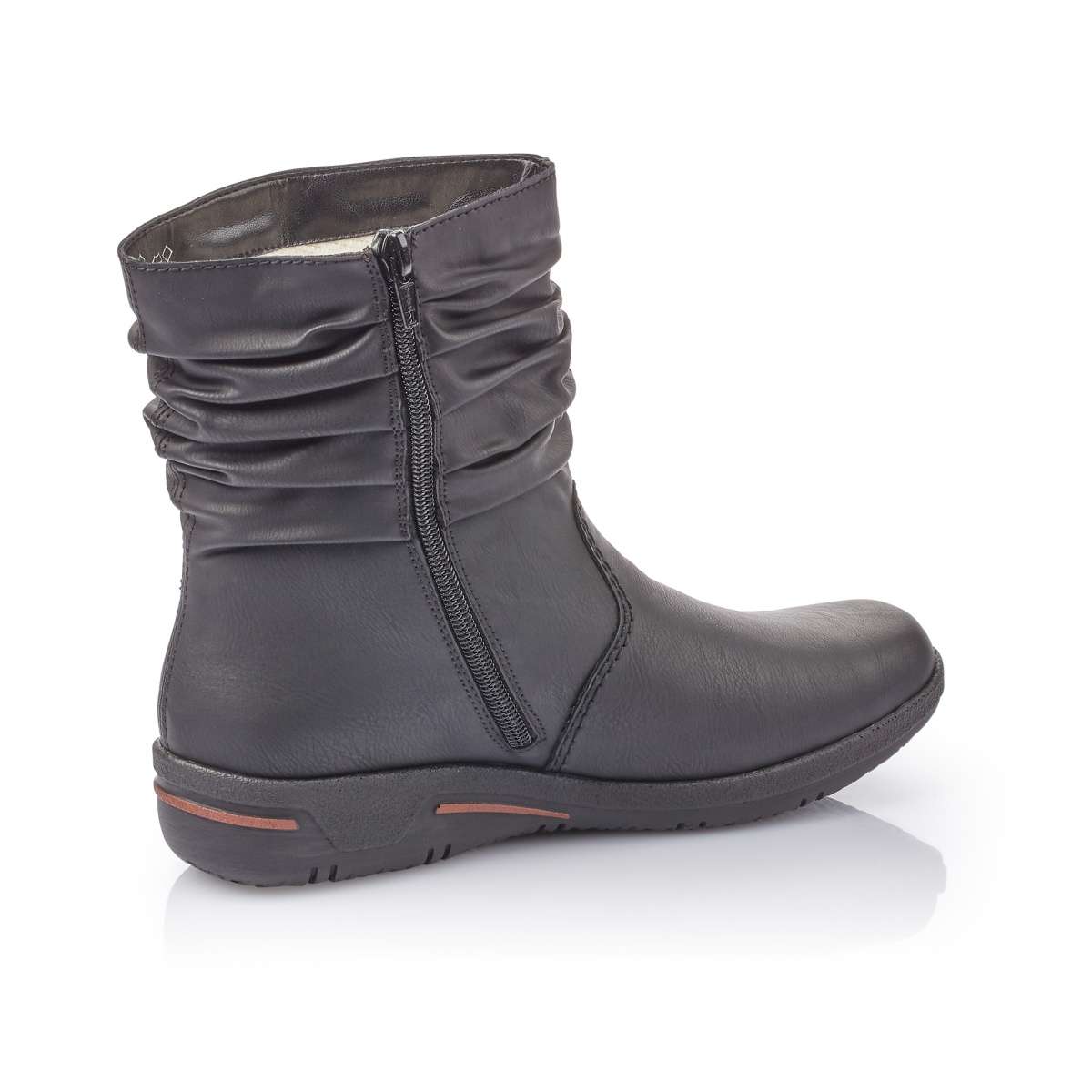 Dámská kotníková obuv s lehkým pokrčením v horní části v černém provedení, značky RIEKER.