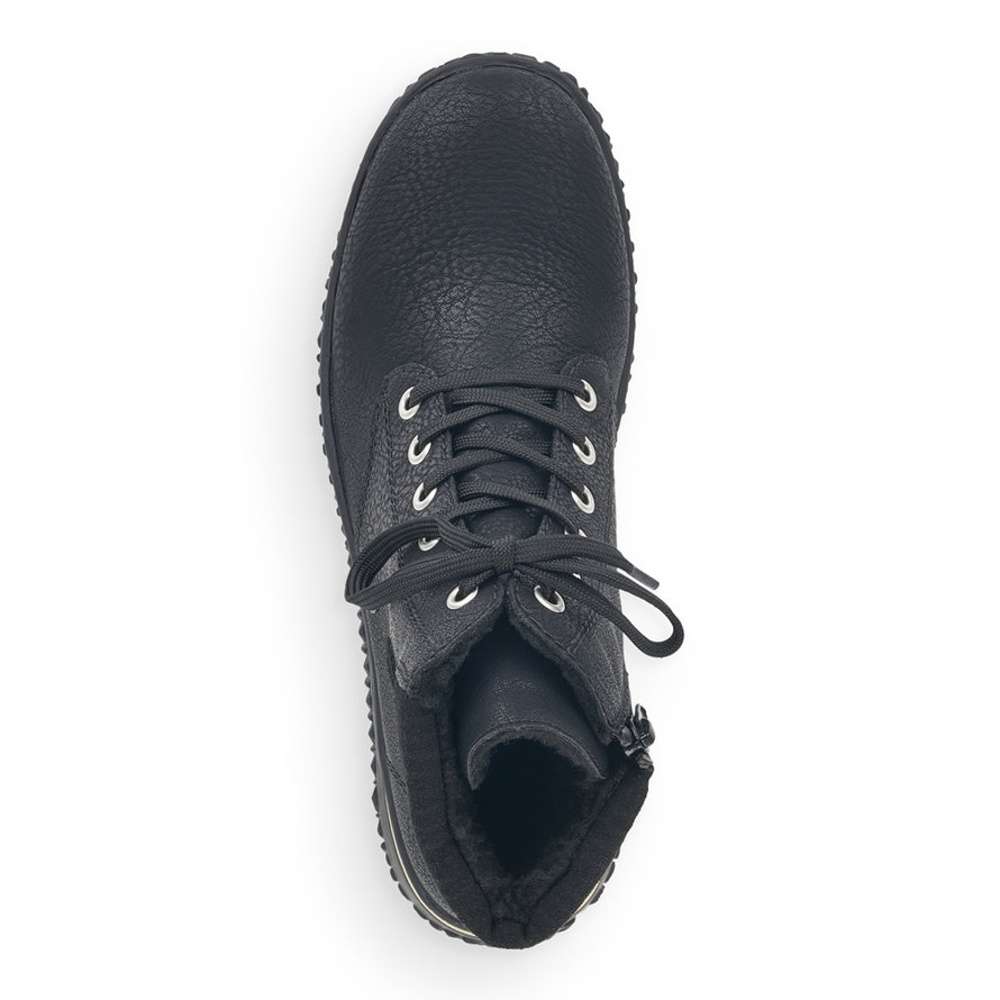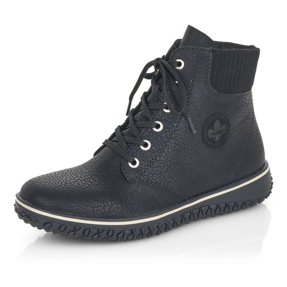 Tyto šněrovací boty v kotníkovém stylu Vás okouzlí svým jednoduchým oblázkovým svrškem v černé barvě, který je navíc dozdoben logem značky Rieker a černým lemem u horního okraje. Tkaničkami na šněrování si je můžete utáhnout přesně podle Vašich představ. Podšívka z teplé kožešiny krásně zahřeje a hrubá podešev Vám zajistí bezpečnou chůzi. Vkusná obuv, se kterou si užijete celou zimní sezónu. Technologie: Antistress – podešev je díky této technologii lehká, flexibilní, absorbuje nárazy při došlapu a snadno se přizpůsobí každé noze.