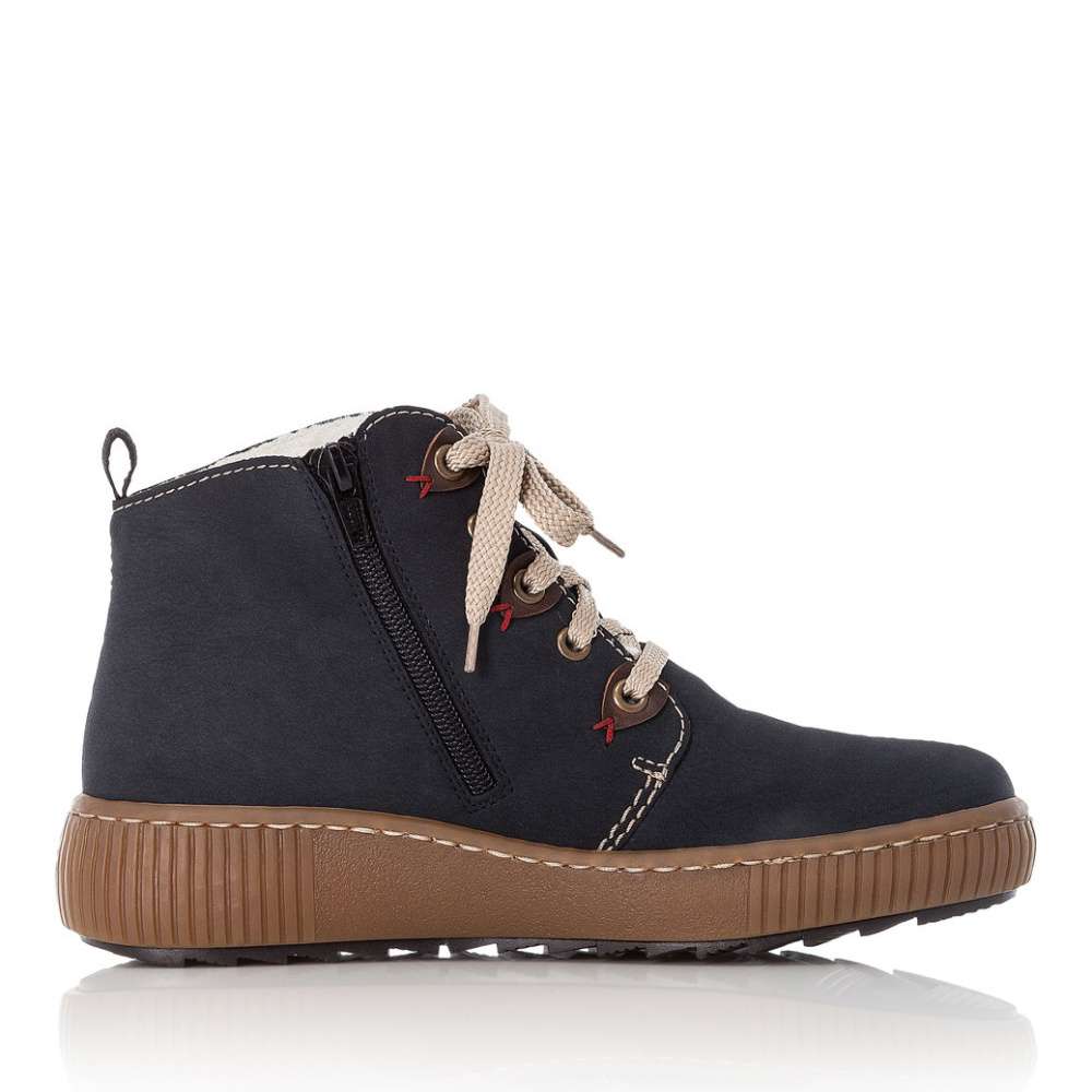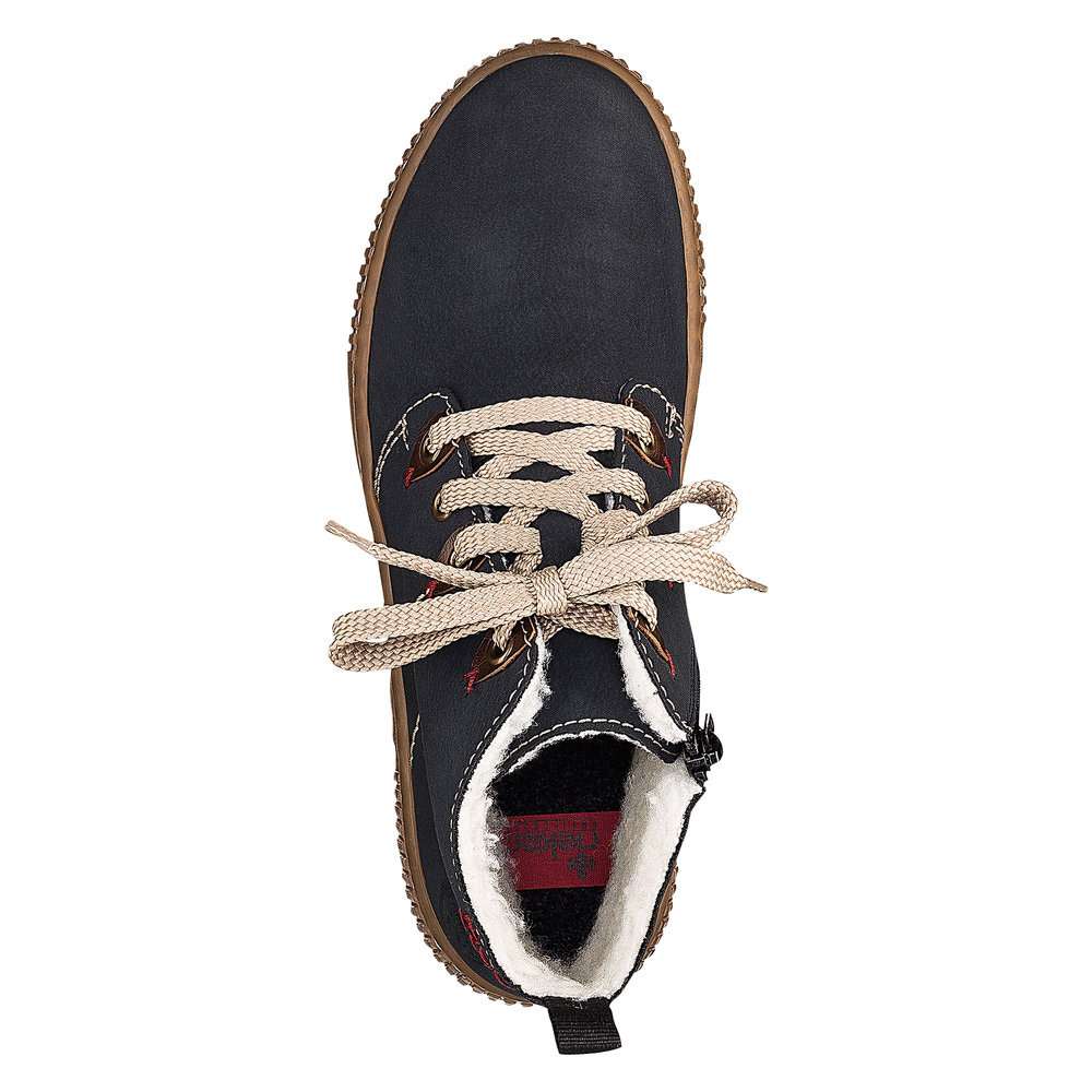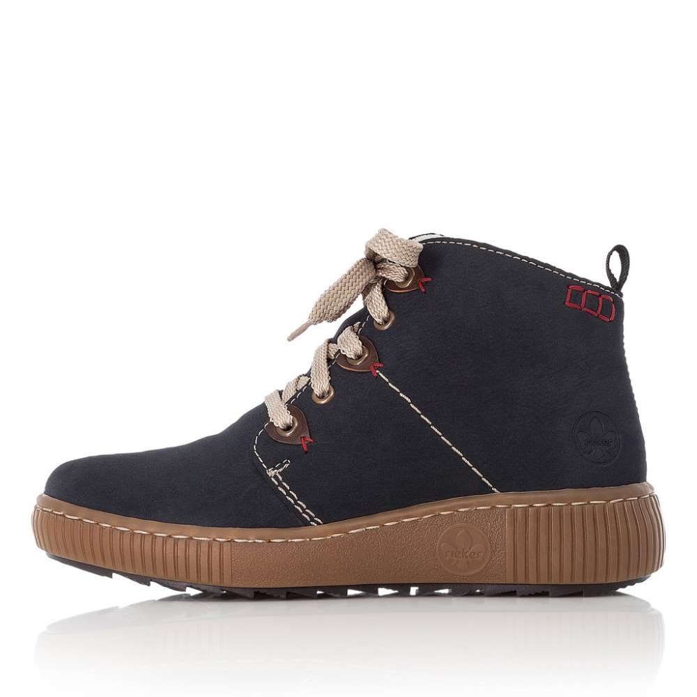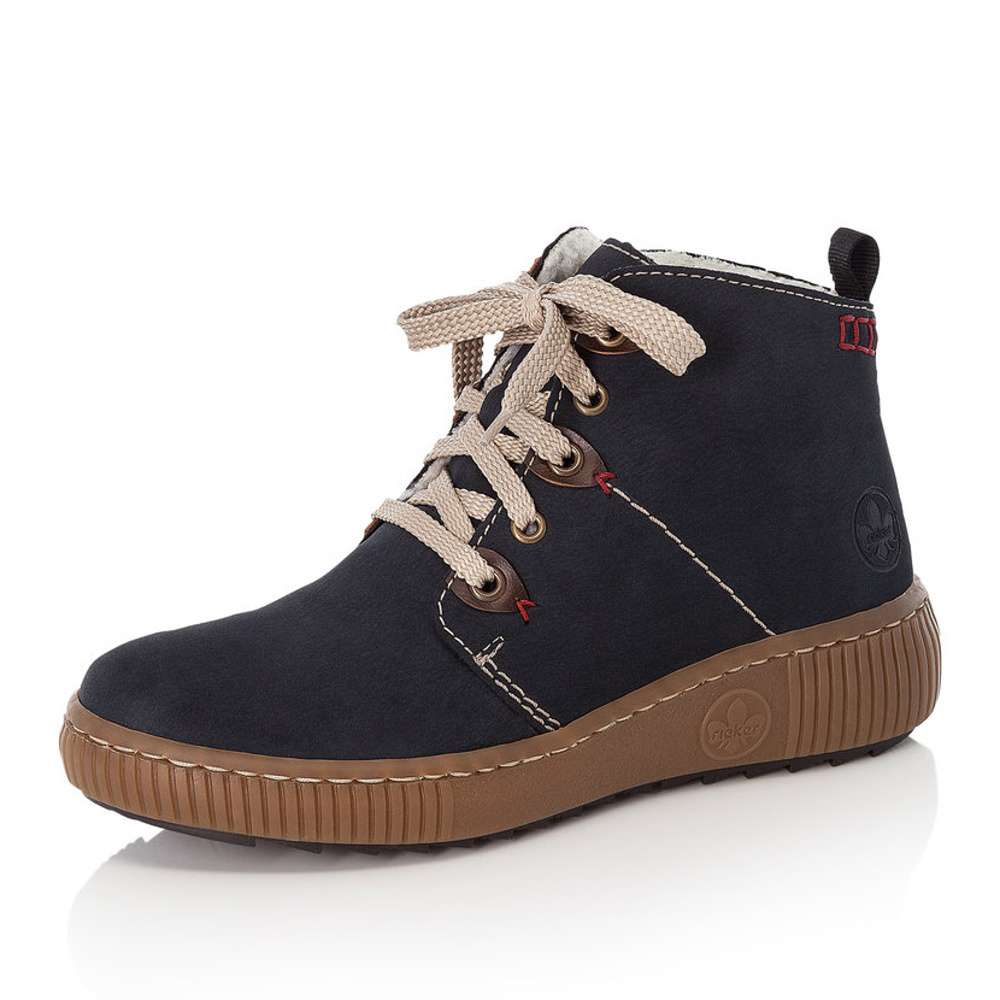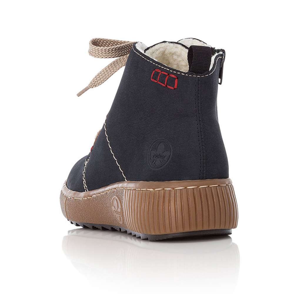 Dámský kotník s celkovou výškou boty cca 15 cm v modré barvě, zdobený je logem značky Rieker na vnější straně, prvky v červené barvě a designovou podešví. Teplou podšívku oceníte i při sychravém počasí. Šněrováním si obuv upravíte přímo k Vaší noze. Tento model unosíte jak na procházky zimní krajinou, nebo do práce.