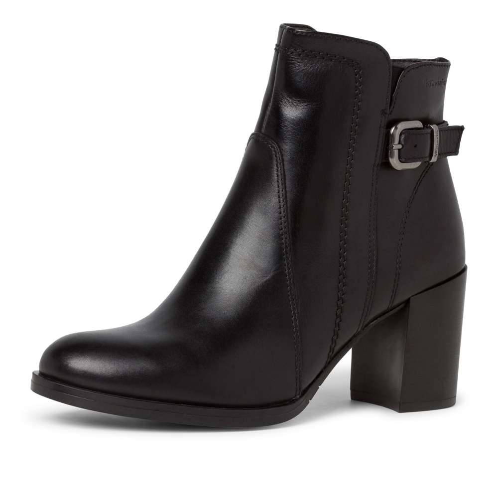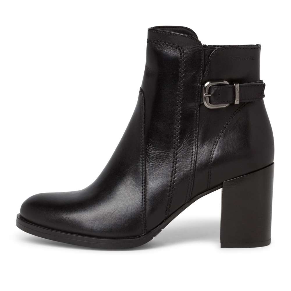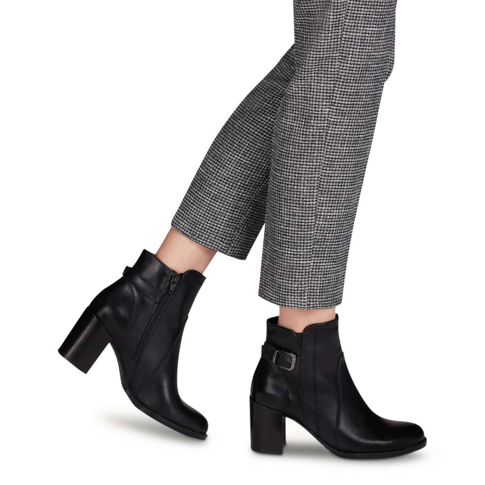 Elegantní dámská obuv v černé barvě, značky TAMARIS. Podešev Pevná podešev a širší podpatek vysoký cca 7 cm Vám zajistí pevný a jistější krok. Svršek Tento hladký dámský kotník od značky Tamaris je vyroben spojením přírodní usně a kvalitního textilního materiálu. Kulatá špička, lehké prošití a přezka s páskem v patní části jsou zdobnými znaky této obuvi. Snadné nazouvání zajistí pružná gumička ve výkroji a funkční zip na vnitřní straně. Tento model bude Vaším skvělým společníkem při jakýchkoliv příležitostech. Stélka Měkká stélka Vám zajistí pohodlnou chůzi po celý den.