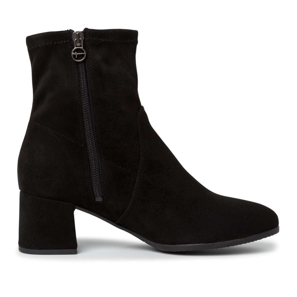 Stylová dámská obuv v černé barvě, značky TAMARIS. Podešev Podešev má široký podpatek vysoký cca 5,5 cm a postará se o dokonalou stabilitu při chůzi. Svršek Stylová kotníková obuv od značky Tamaris má kvalitní textilní materiál v černé barvě a jemné prošívání v části kotníku. Na vnitřní straně je použit praktický černý zip, který Vám usnadní obutí. Tato bota krásně vynikne na noze a svou jemností a elegancí jí můžete nosit kamkoliv budete chtít. Stélka Měkká stélka Vám zajistí pohodlnou chůzi po celý den.