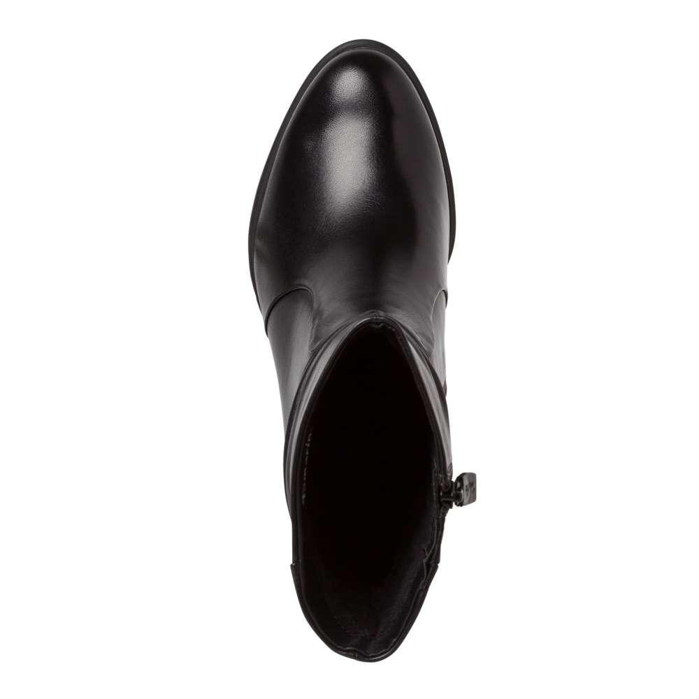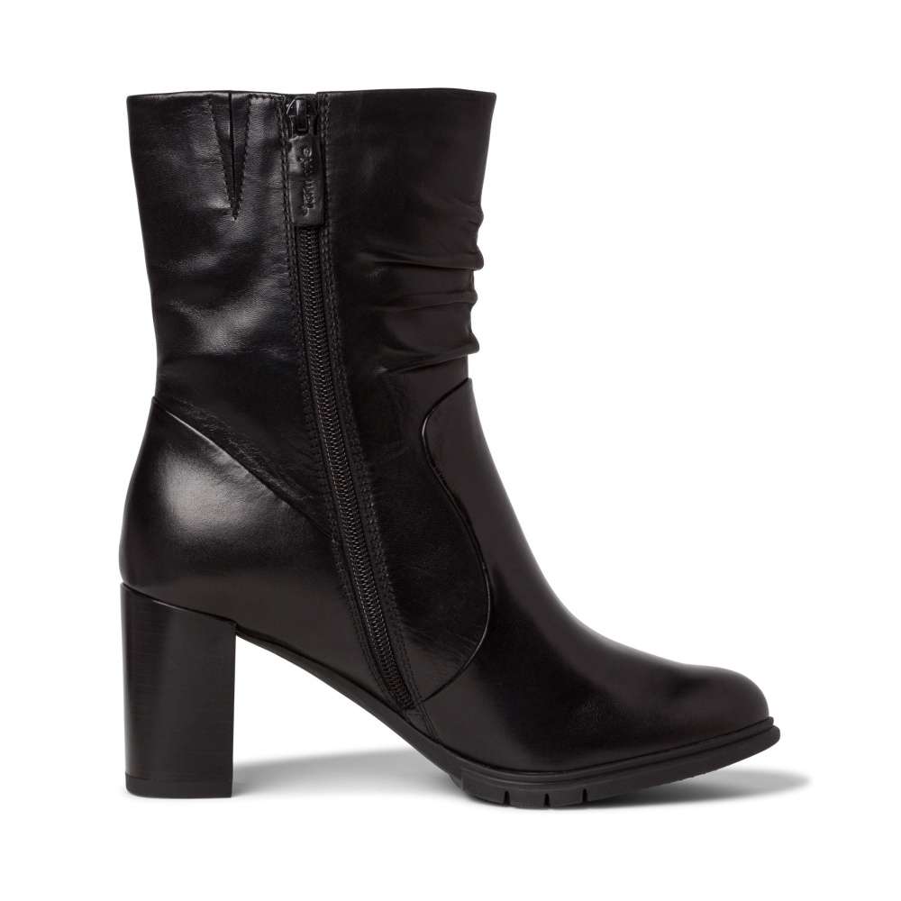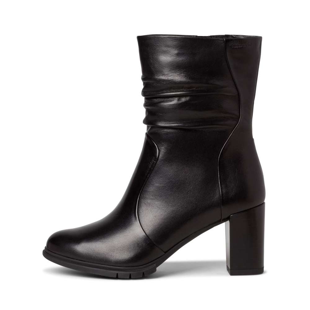 Vyšší kotníková obuv značky TAMARIS, má vysoký podpatek s decentním prošíváním a pokrčením v horní kotníkové části.