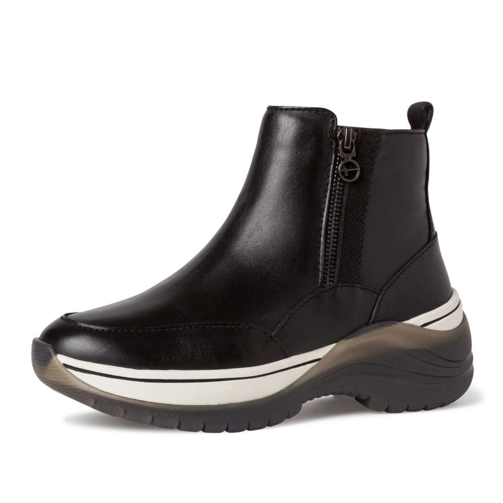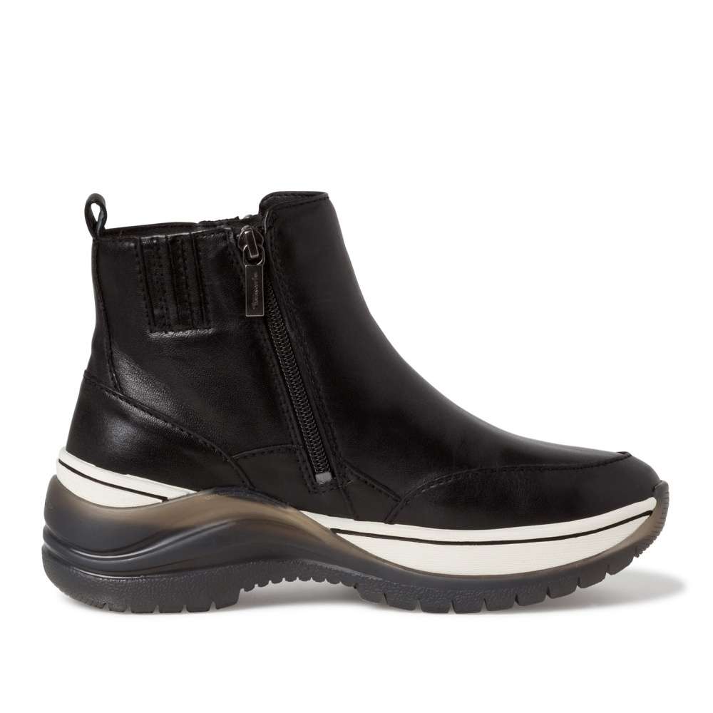 Nevšední model značky TAMARIS, který má kožený svršek, extravagantní podešev a zdobný pruh z vnější strany.